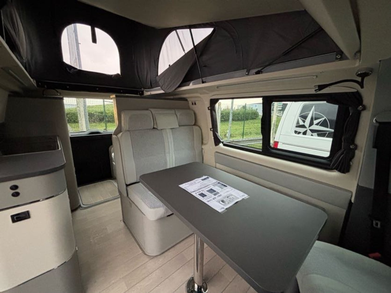 Bac de douche, Cuisine en long, Douche extérieur, Lit dînette avant, Lit toit relevable, Salon avant sièges pivotants, WC Cassette.