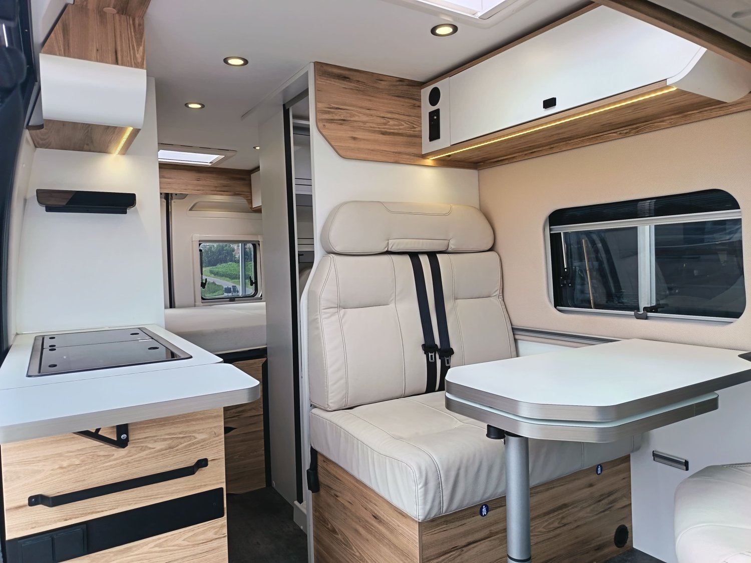 Fourgon d'occasion en 5m99, avec un tout petit kilométrage. Il bénéficie d'un équipement complet, d'une isolation performante et de 3 couchages.