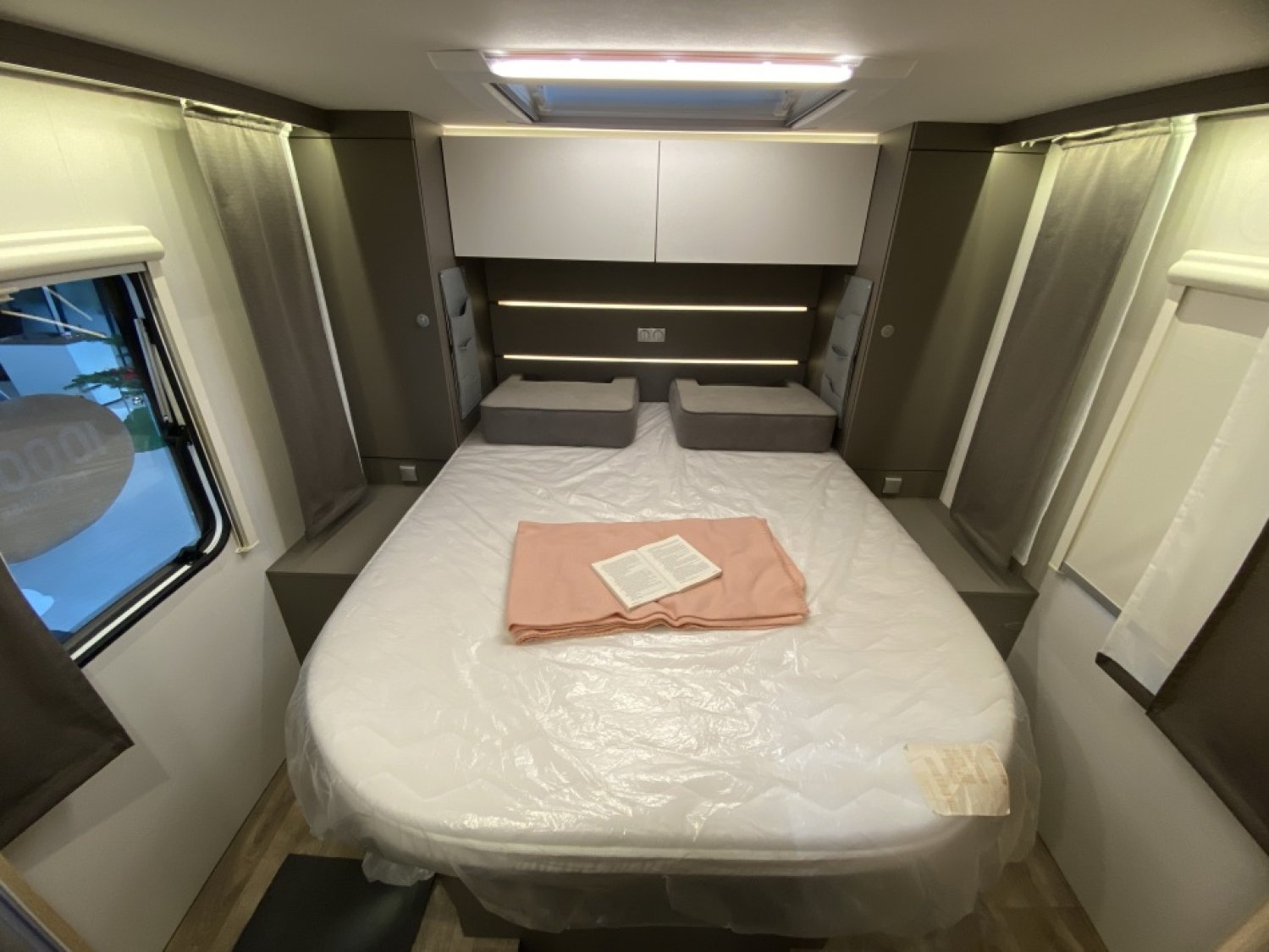 Ce profilé 4 couchages réunit un lit central confortable, un lit pavillon électrique, et un salon spacieux en L dans un design sobre et fonctionnel.