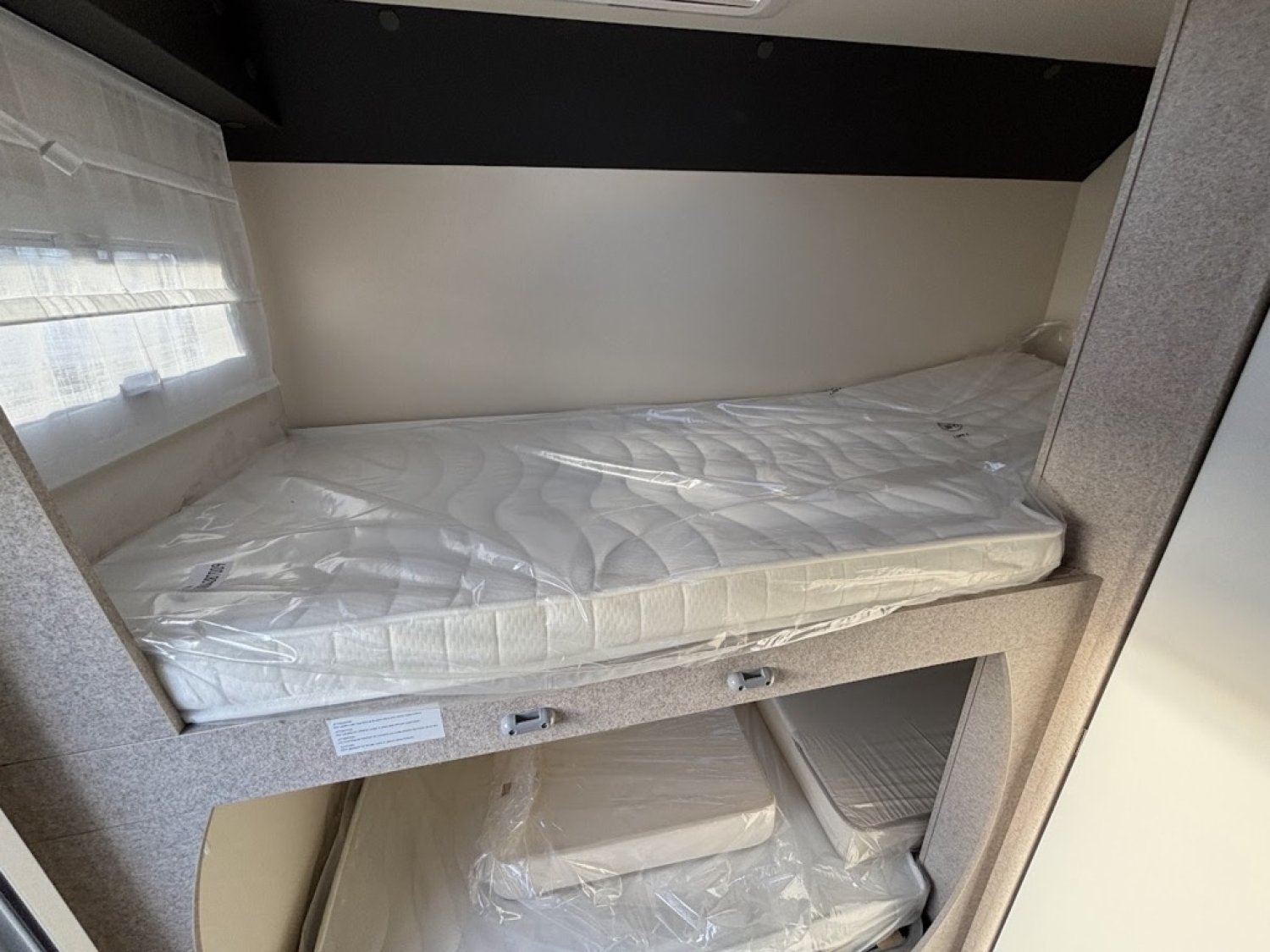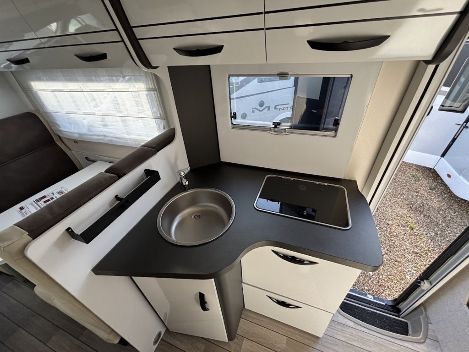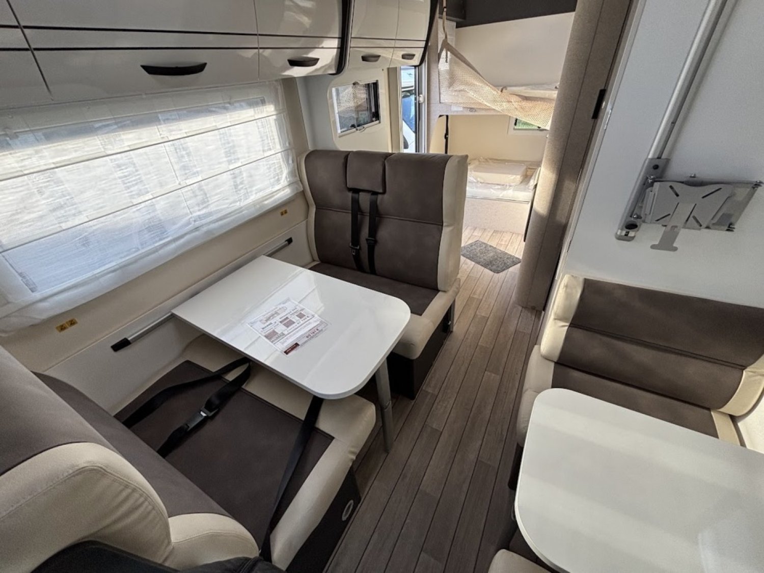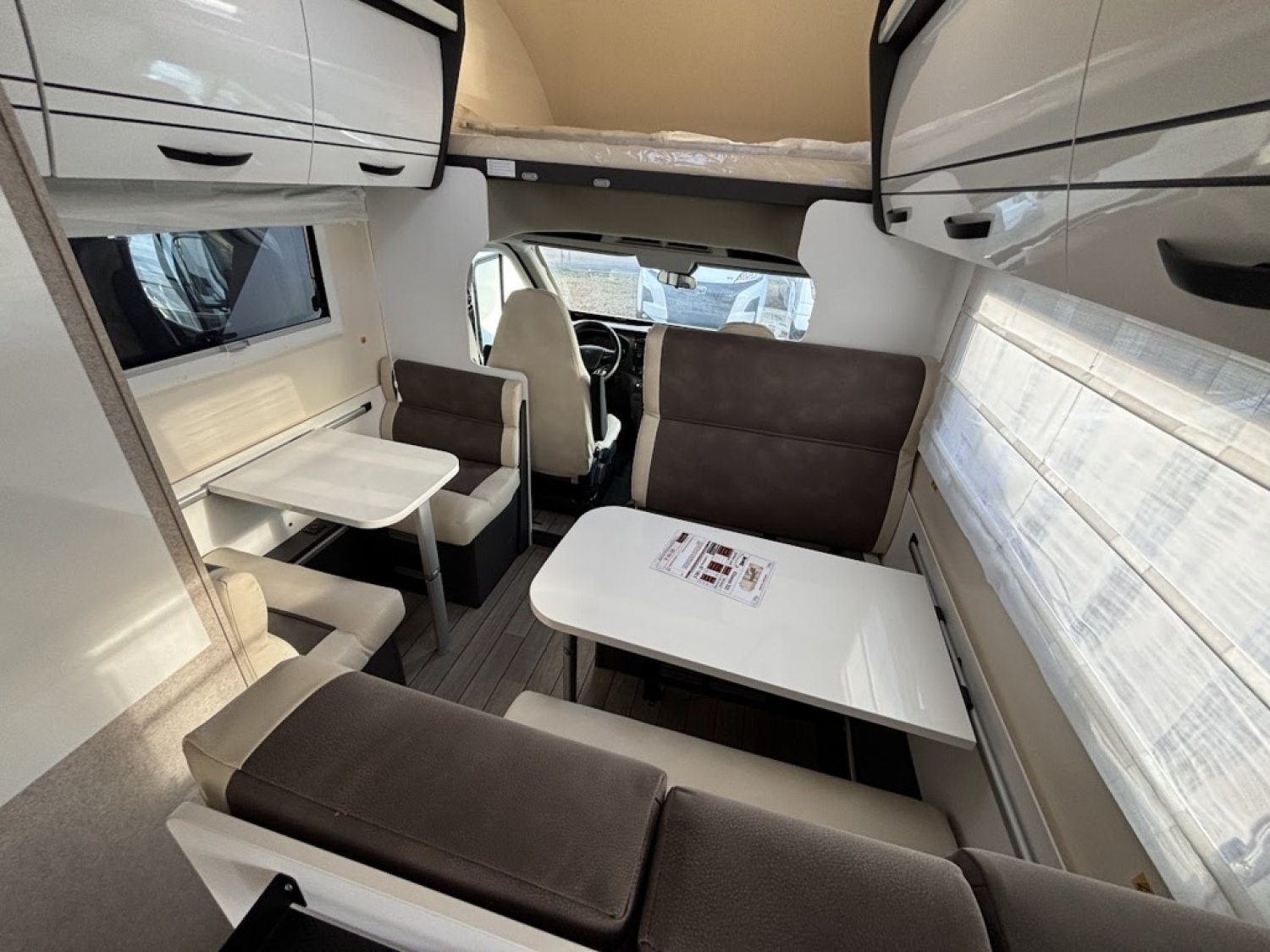 Bac de douche, Cuisine en L, Lit capucine, Lit dînette avant, lit superposés, Salon double dînette avant, Soute, WC Cassette.