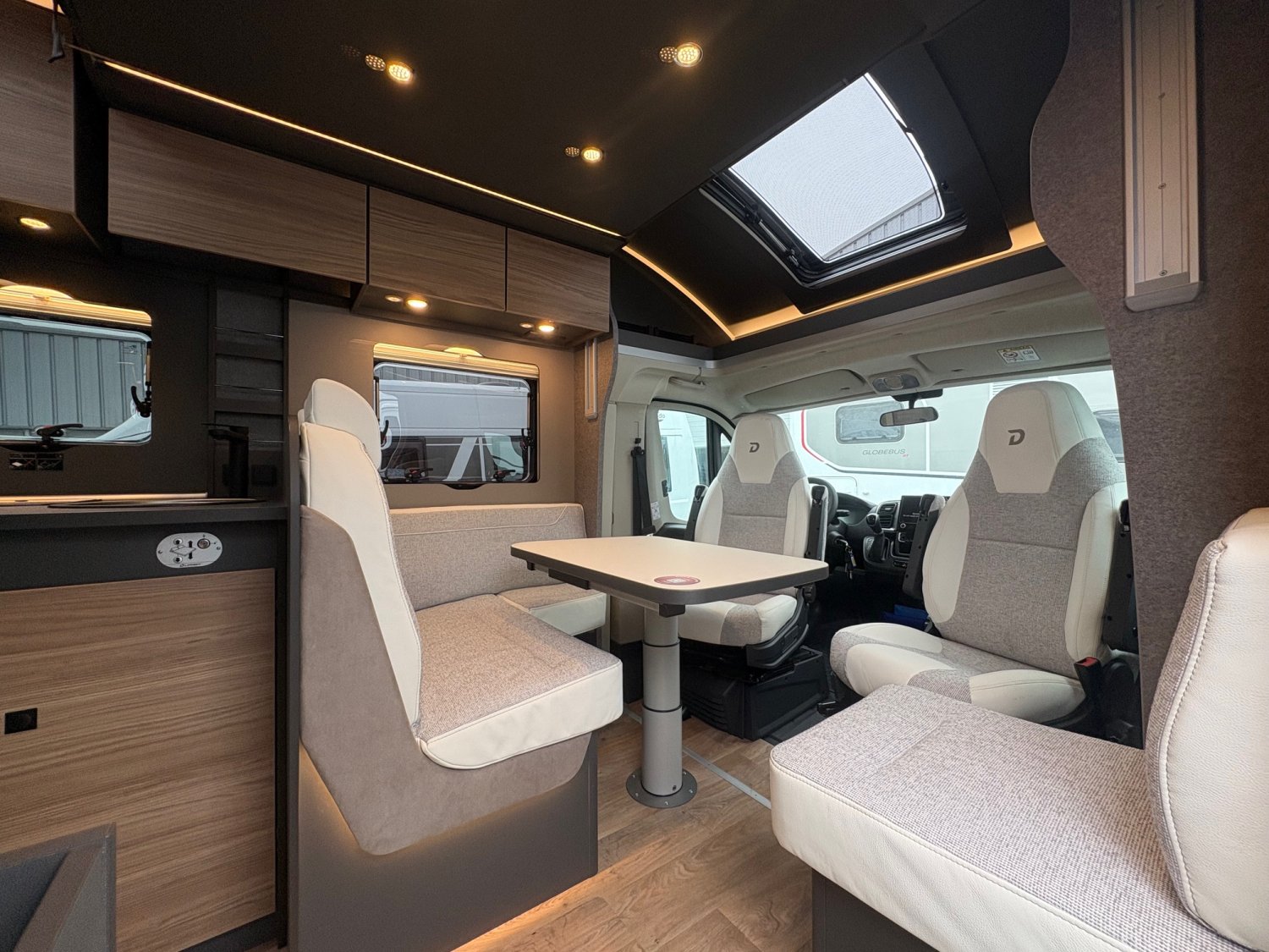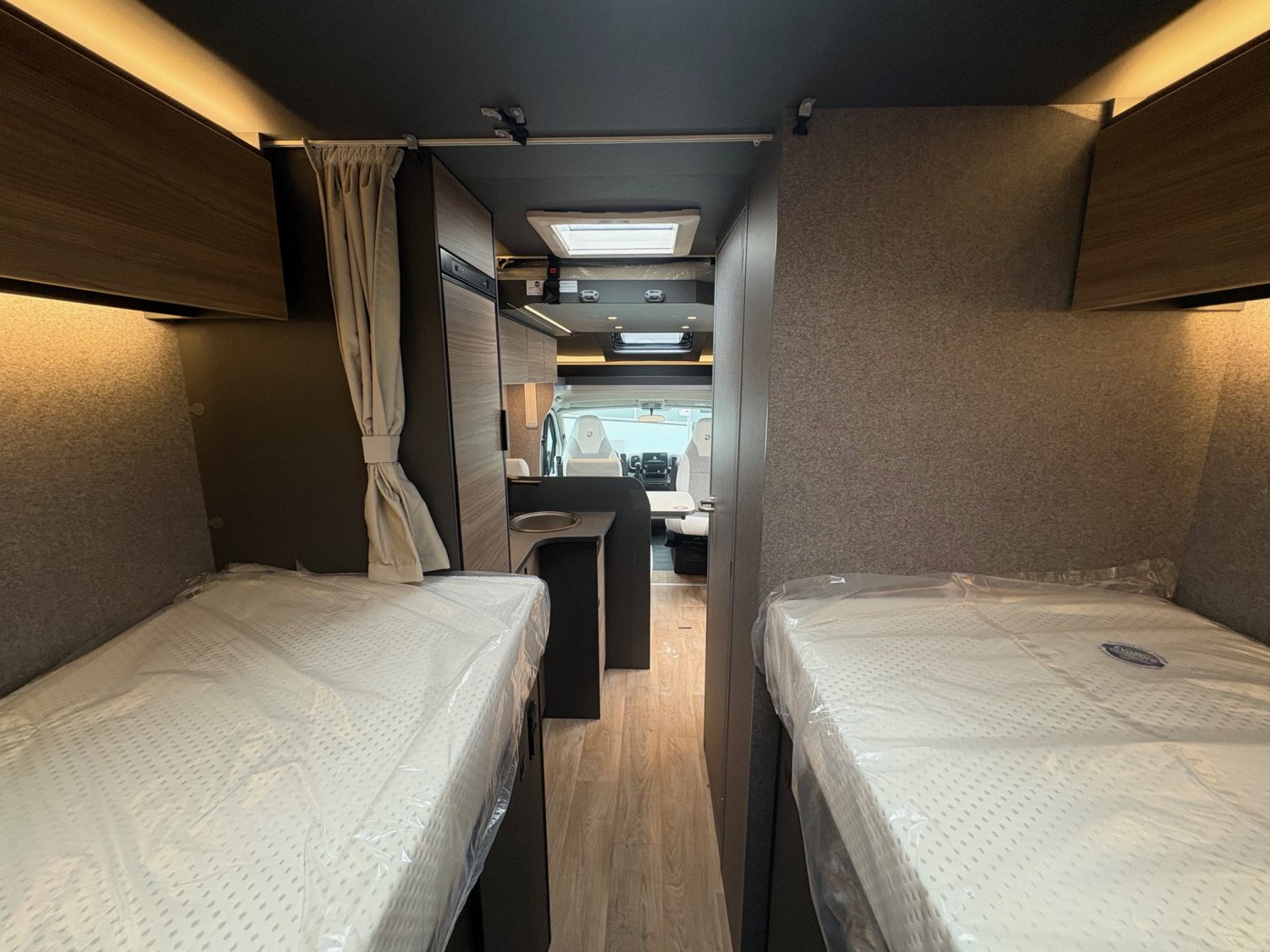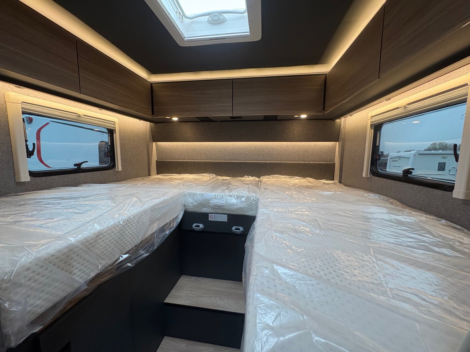 Camping-car haut de gamme de la marque DETHLEFFS, avec lits jumeaux et lit pavillon électrique