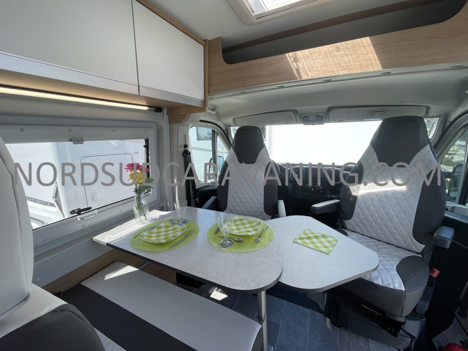 À l'avant, la dinette spacieuse permet également de se transformer en lit d'appoint, et on y retrouve également un grand réfrigérateur à compression de 135L, la climatisation cabine, ou encore un chauffage et chauffe-eau Truma. La salle de bain est équipée d'un bac de douche, d'un WC compact ainsi qu'un astucieux lavabo pivotant.