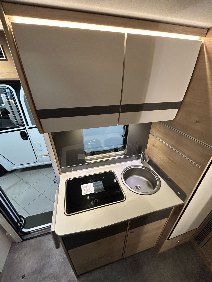 Cuisine entièrement équipée avec plaque de cuisson à 2 feux, poubelle, système de rails Multiflex, etc.
