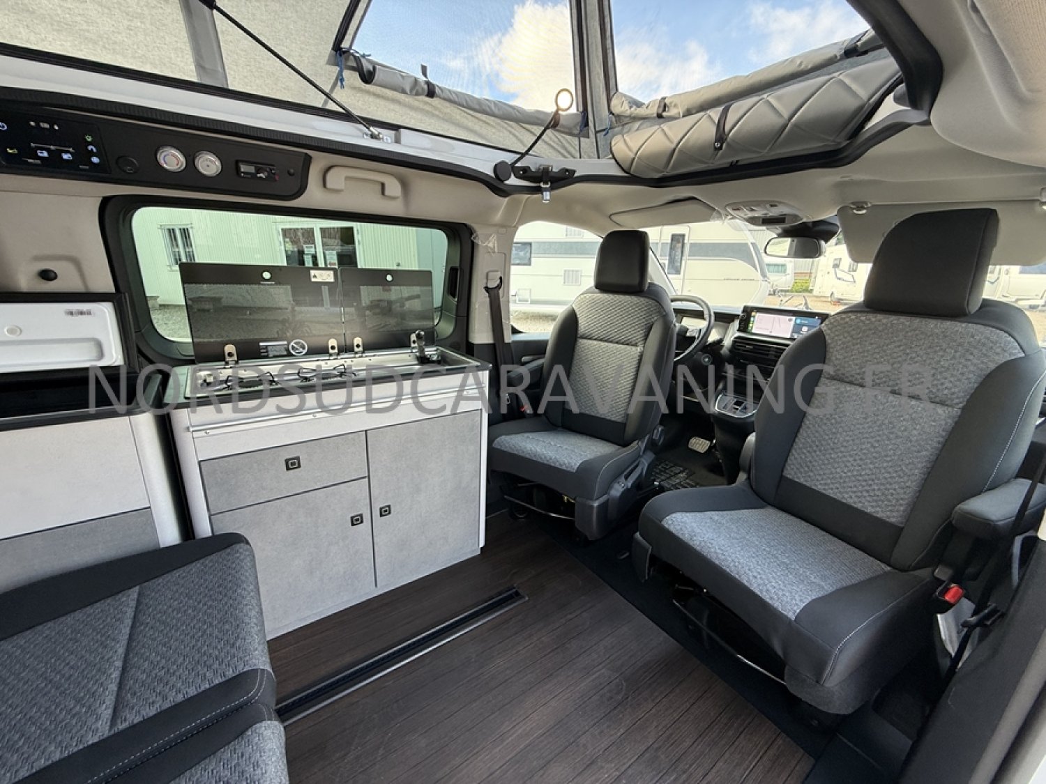 un VÉHICULE DE LOISIRS pour le week-end avec sa possibilité de couchage pour 4 personnes : la banquette dépliante + le toit relevable, et dispose d'un bloc cuisine amovible