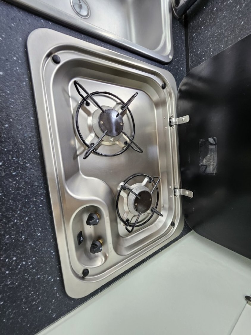 Lit Central 2 adultes - Lit sur dînette - gazerie 2 feux - Refrigerateur / conservateur - dinette 4 personnes - Siéges sur embases pivotantes