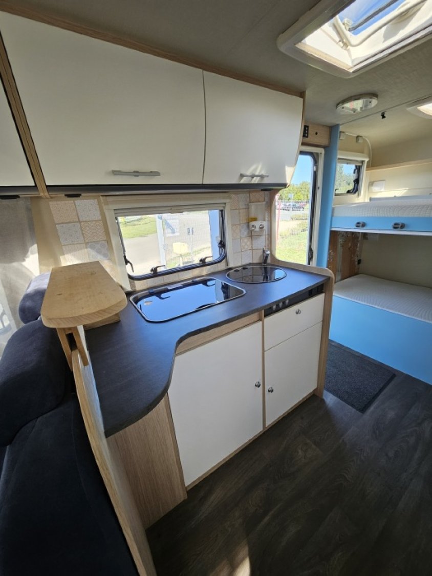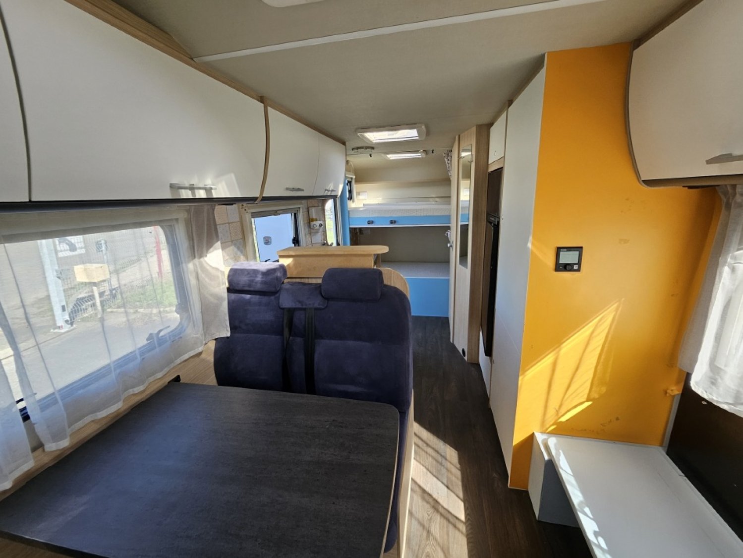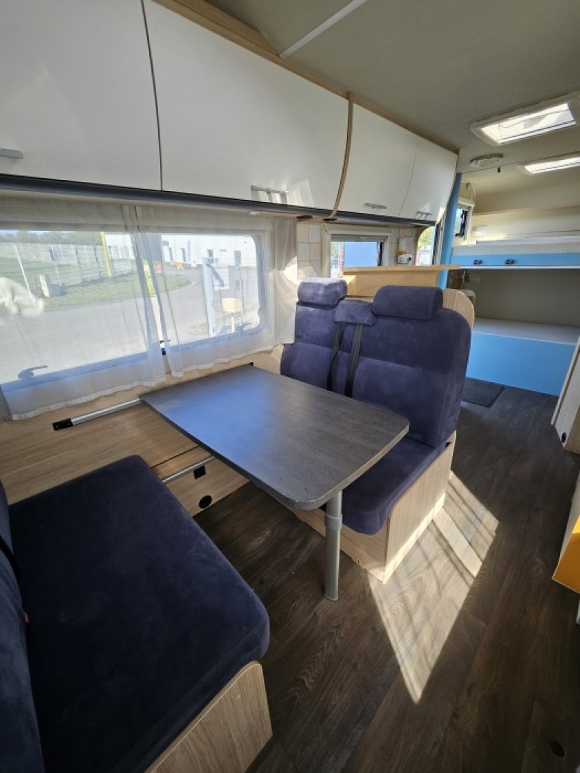 Capucine Sunlight, agencement familiale, 6 couchages, lits superposés modulable en soute, salle de bain modulable, cuisine équipée d’un grand frigo automatique, maxi salon avant avec dinette 4 personnes.