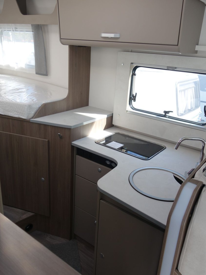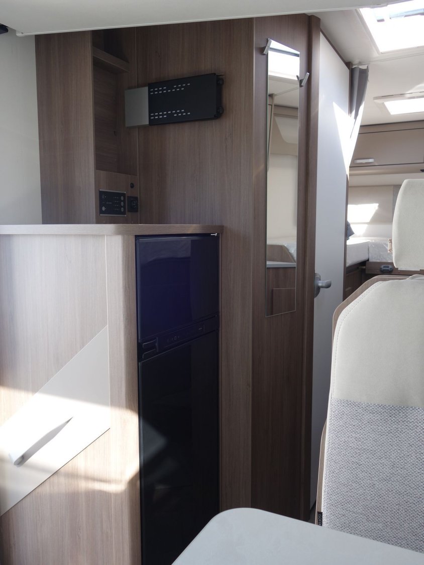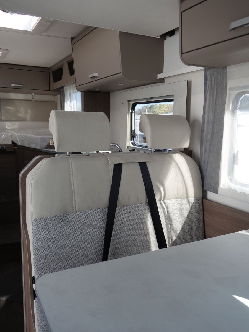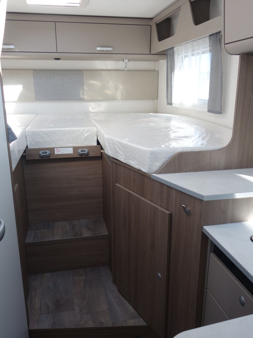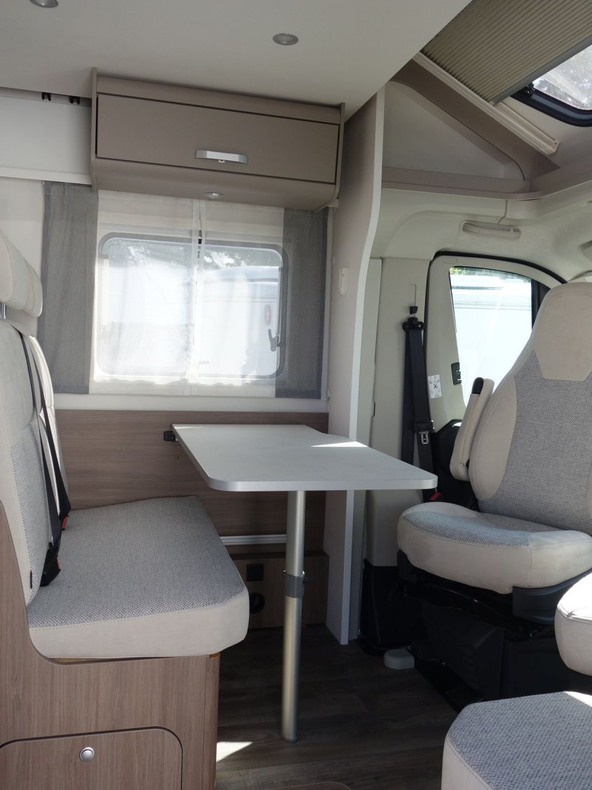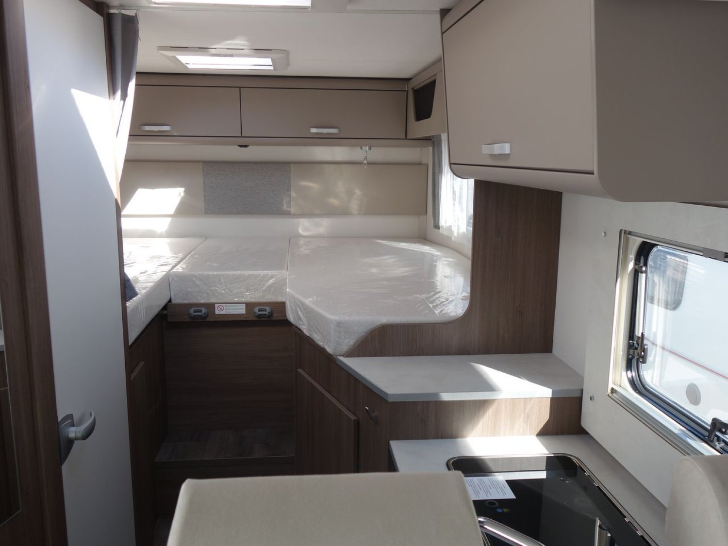 Profilé avec lits jumeaux transformables sur garage, cabinet de toilette avec WC et douche séparée de type vario, pack PRO + : parechoc peint, feux anti-brouillards, volant et pommeau de vitesse en cuir, jantes alliage 16 pouces bicolores, stores plissés cabine, store extérieur, toit panoramique de cabine, réfrigérateur 156 l, réservoir eaux usées isolé, baies à cadre affleurant ... conditions déstockage en concession