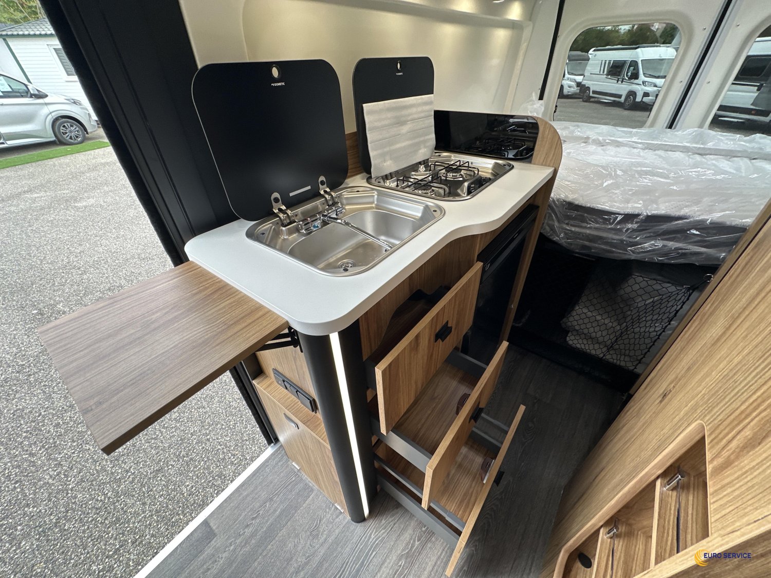 Doté d'une 5ème place carte grise de série, le Terravan peut accueillir 5 personnes en couchage, grâce à son intérieur parfaitement optimisé dans 6m de longueur. Son lit supérieur électrique vous permettra de moduler les lieux de vie sans effort. Les espaces cuisine et salle de bains sont pensés pour profiter au maximum de votre voyage.