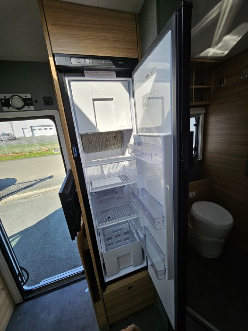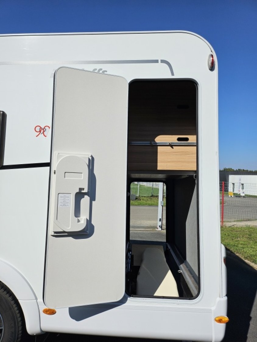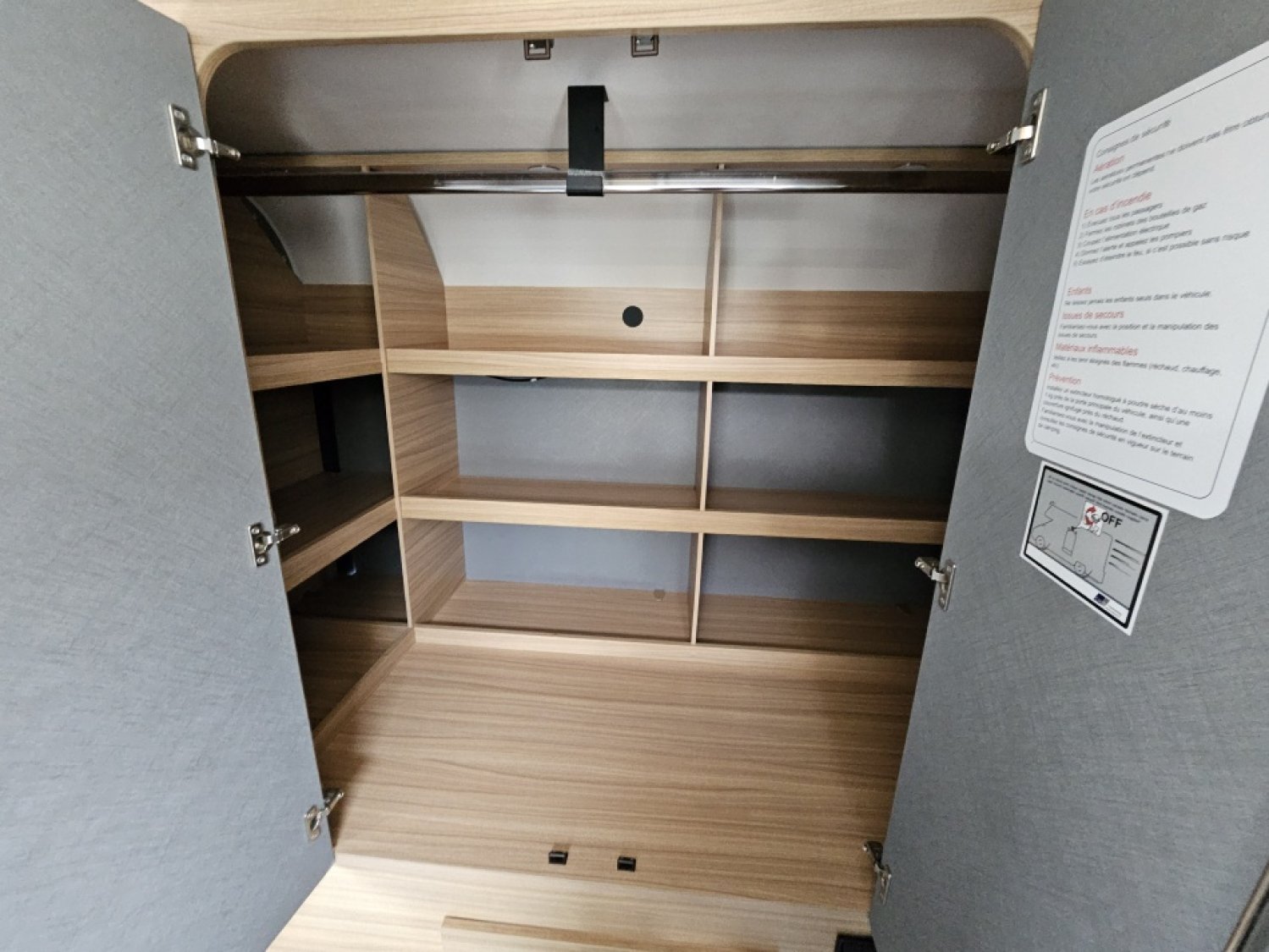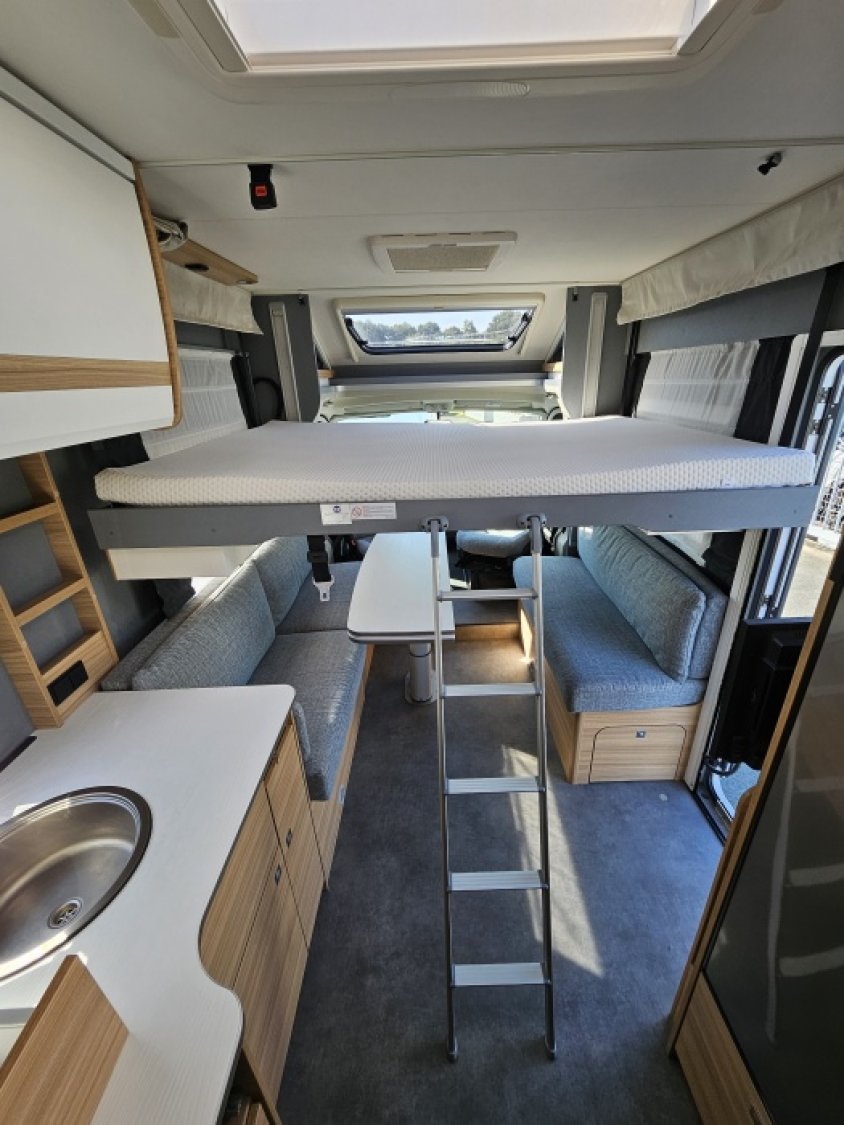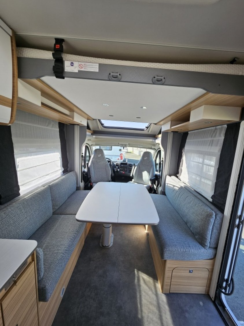 Cuisine : avec réchaud 2 feux - réfrigérateur 142 litres - Couchage : Lit de pavillon (2000 x 1500 cm) – Toilette spacieux : WC à cassette, Douche séparée - dressing - Banquette face à face avec table centrale - Chauffage / chauffe-eau Truma Combi 6 - grand Salon - sièges pivotants, réglables en hauteur - Occultation cabine coulissante plissée de série REMIS – grand salon 8 places - Grande soute traversante avec coffre à skie – coffre 2 bouteilles de gaz