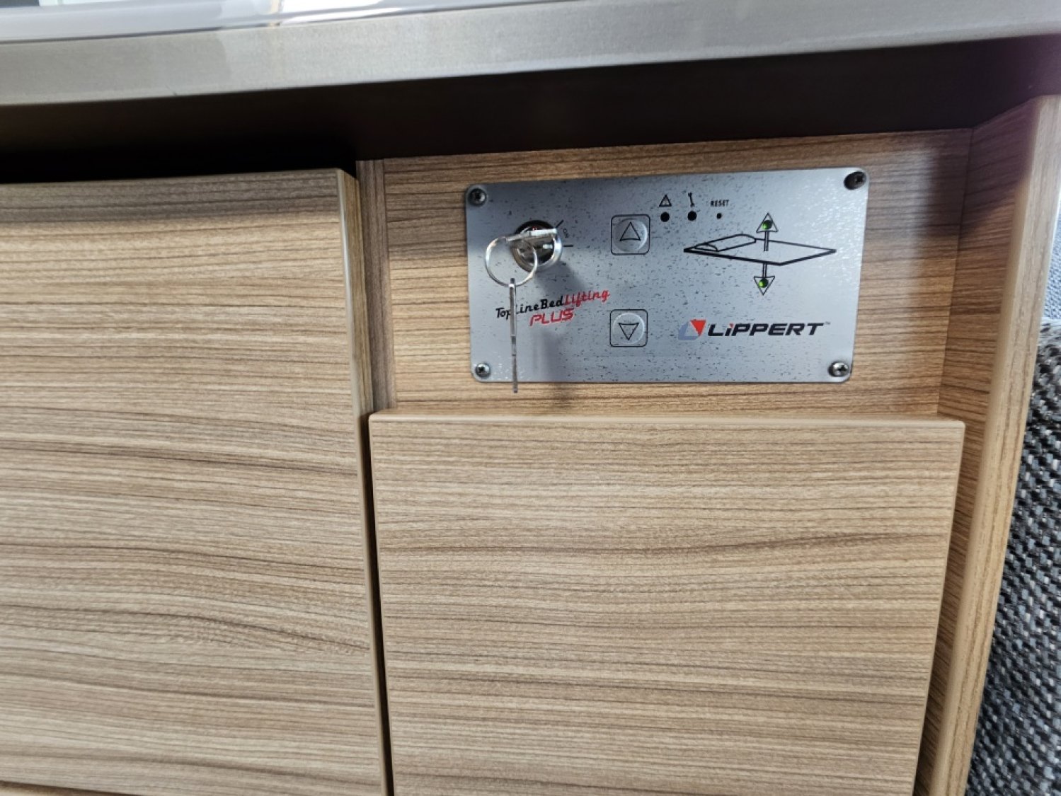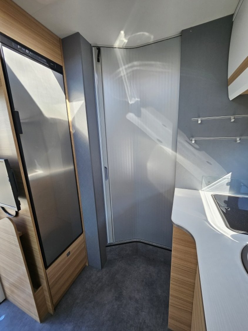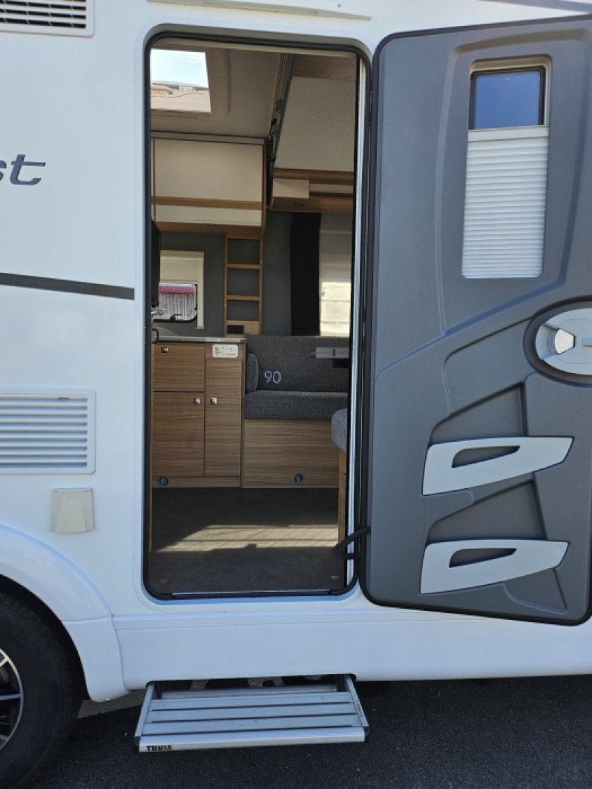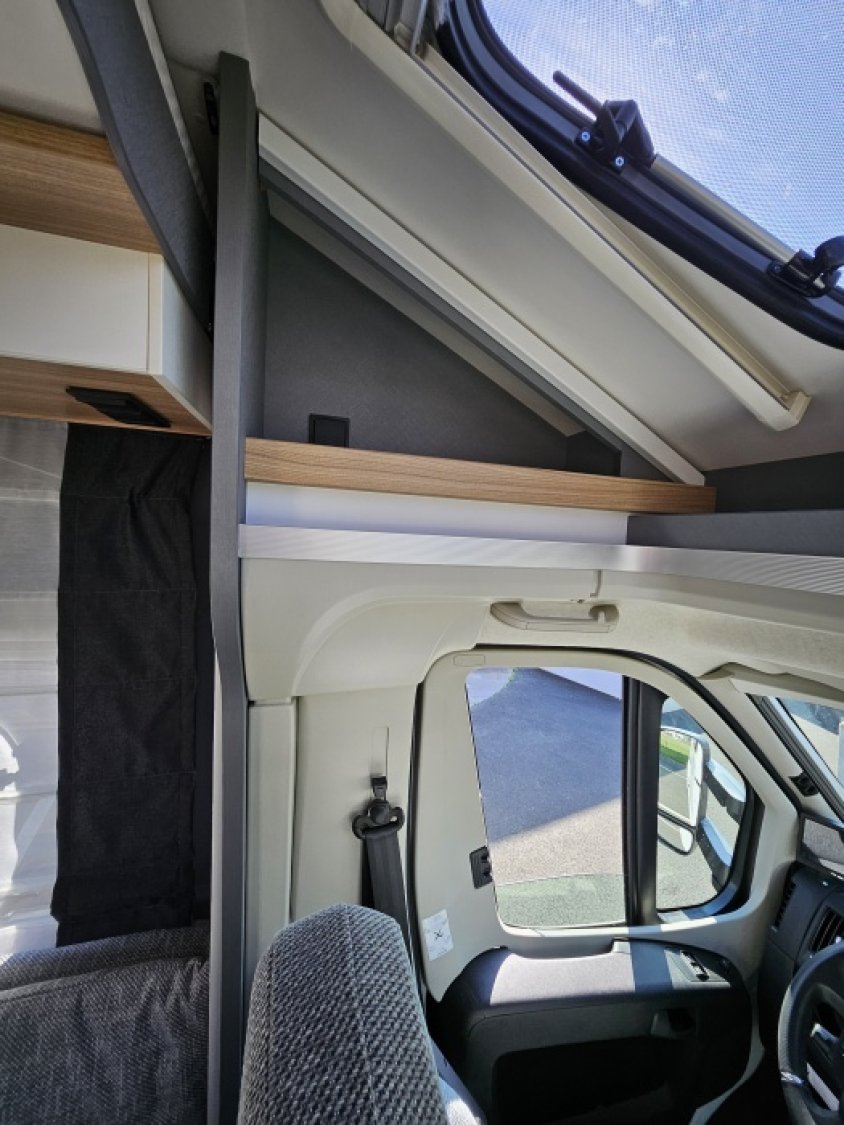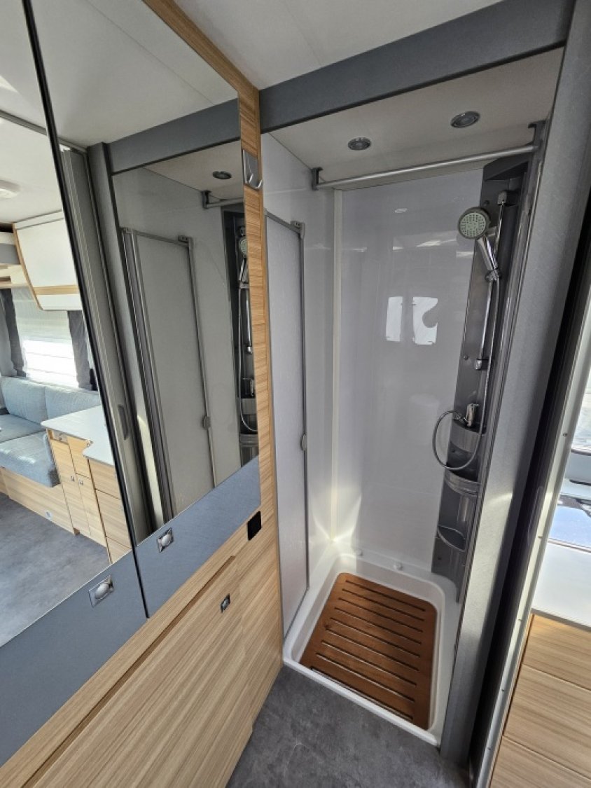 Cuisine : avec réchaud 2 feux - réfrigérateur 142 litres - Couchage : Lit de pavillon (2000 x 1500 cm) – Toilette spacieux : WC à cassette, Douche séparée - dressing - Banquette face à face avec table centrale - Chauffage / chauffe-eau Truma Combi 6 - grand Salon - sièges pivotants, réglables en hauteur - Occultation cabine coulissante plissée de série REMIS – grand salon 8 places - Grande soute traversante avec coffre à skie – coffre 2 bouteilles de gaz