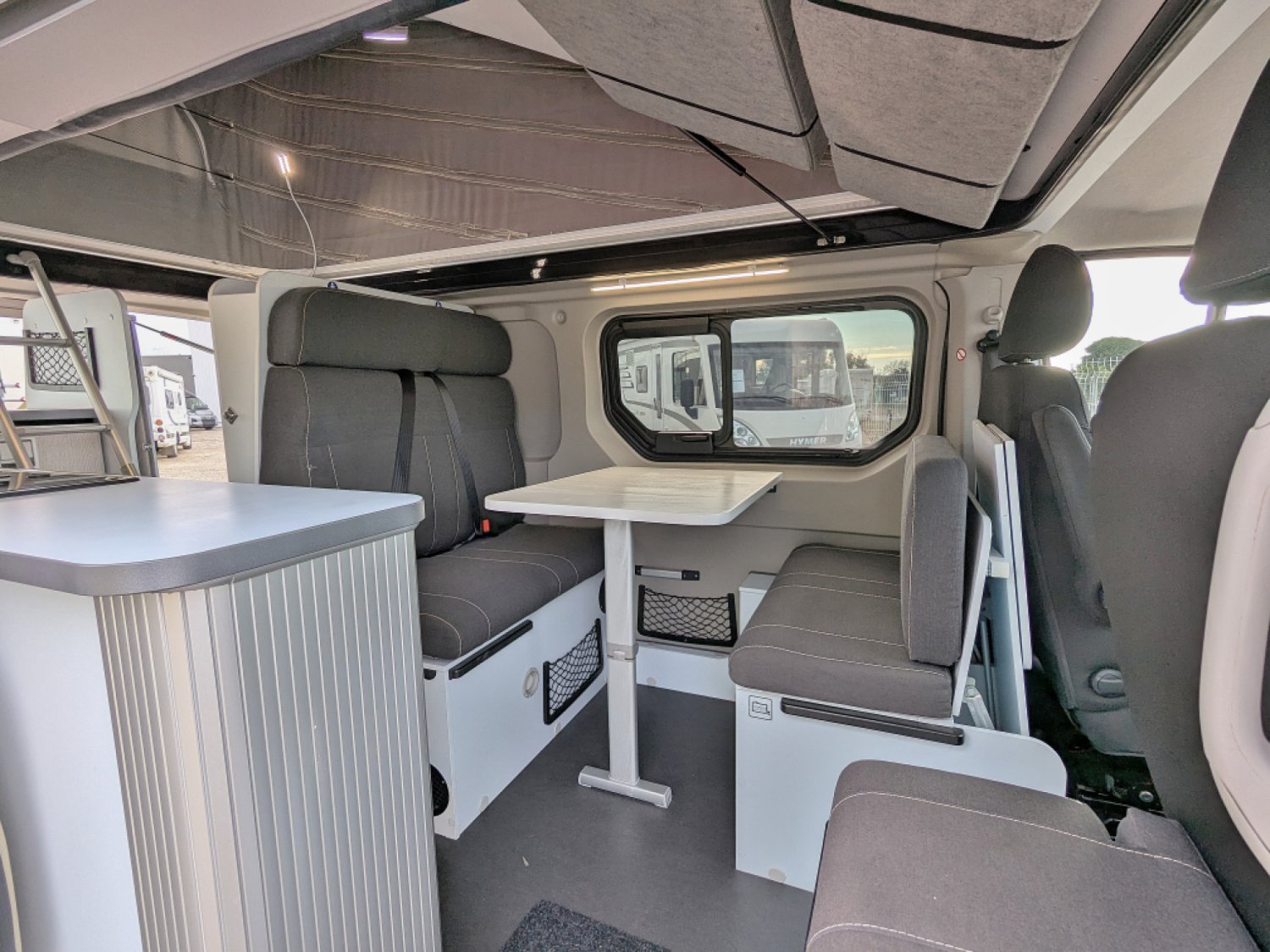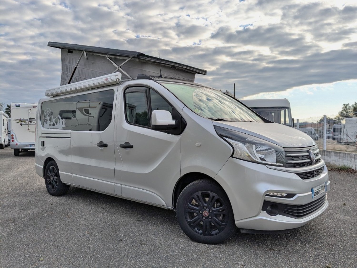 Van à toit relevable en très bon état sur Fiat 2,0 145 CV BV6 avec salle d'eau/WC arrière, cuisine latérale droite avec frigo à compression et plaque de cuisson 2 feux, et salon avant avec banquette face/face convertible en couchage de deux personnes.