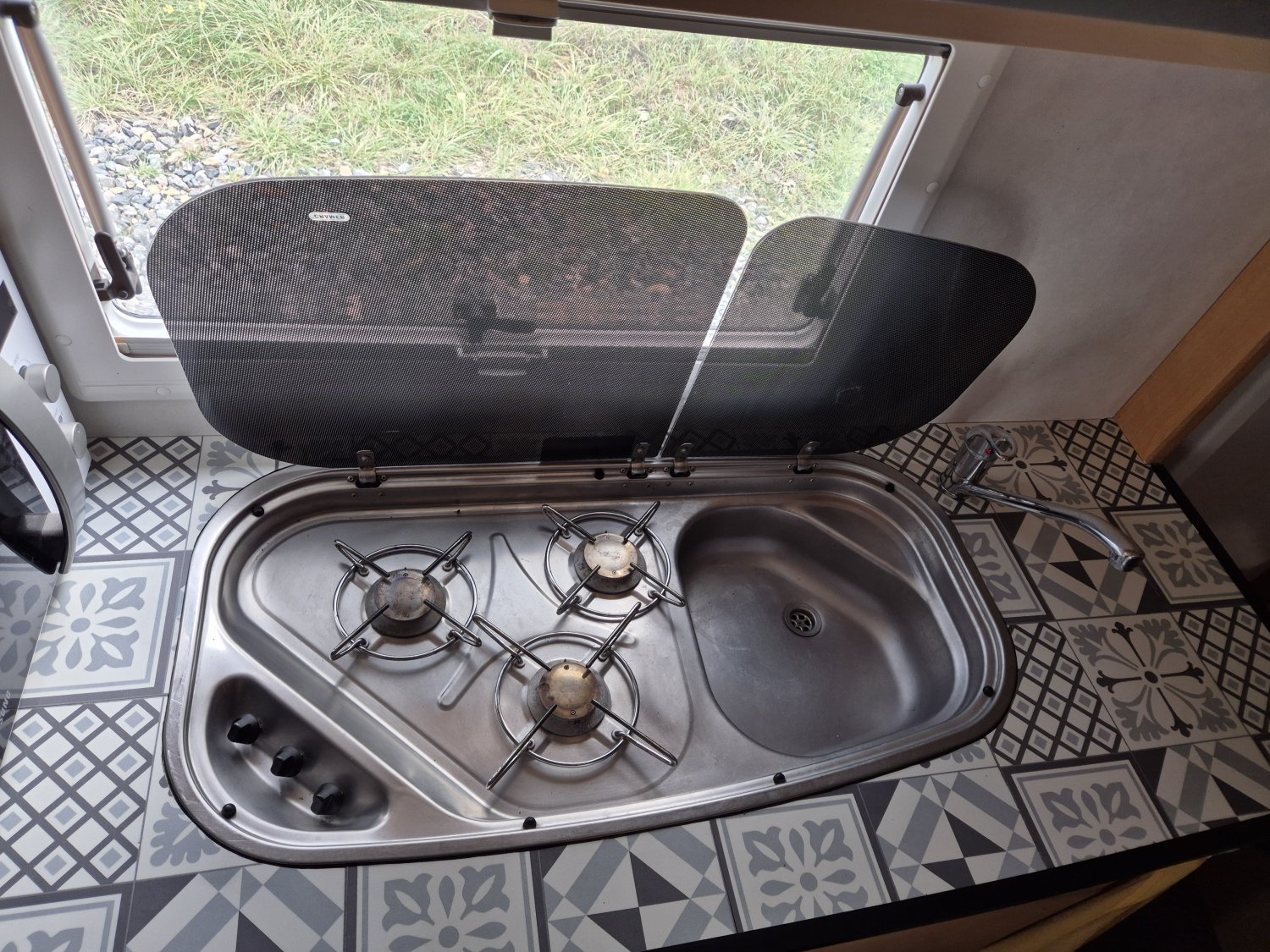 Cuisine équipée : plaque gaz 3 feux, frigo