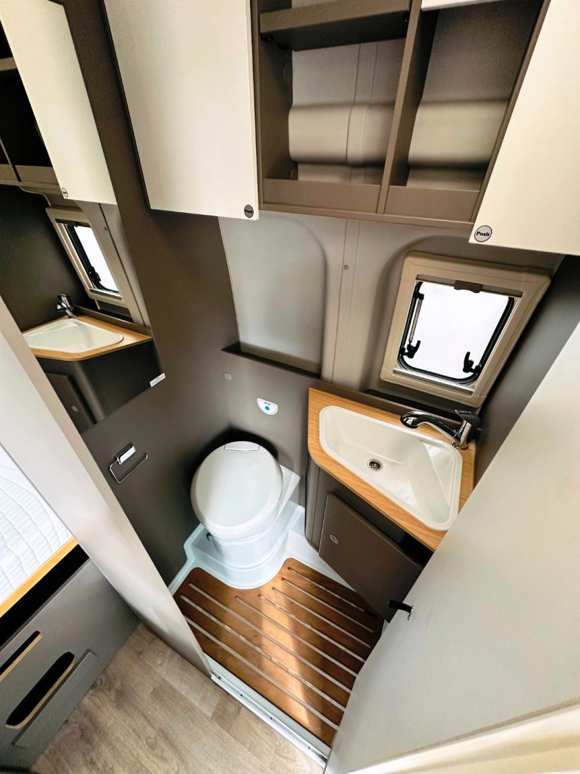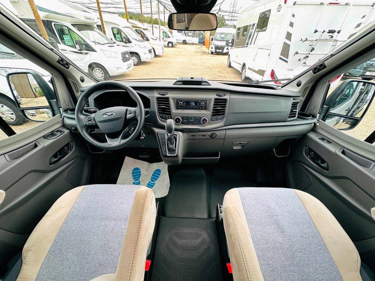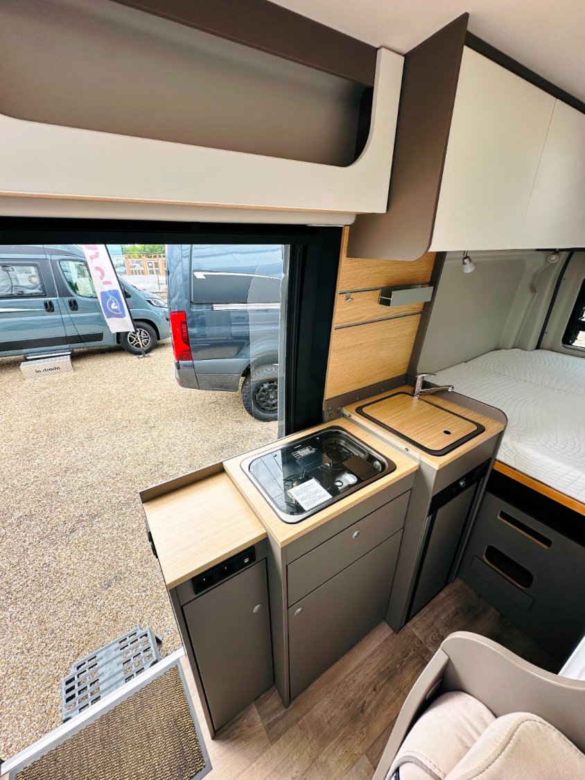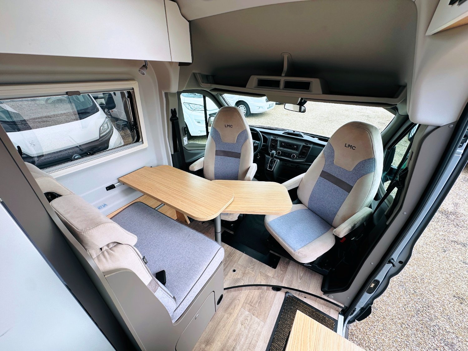 Fourgon LMC (5.98 M), lit permanent arrière transversale modulable (possibilité de dégager le couloir), salle de bain avec douche intégrée, salon avant avec sièges pivotant, table centrale, cuisine droite équipée de nombreux rangements, d’un plan de travail amovible et d’un frigo par compression.
