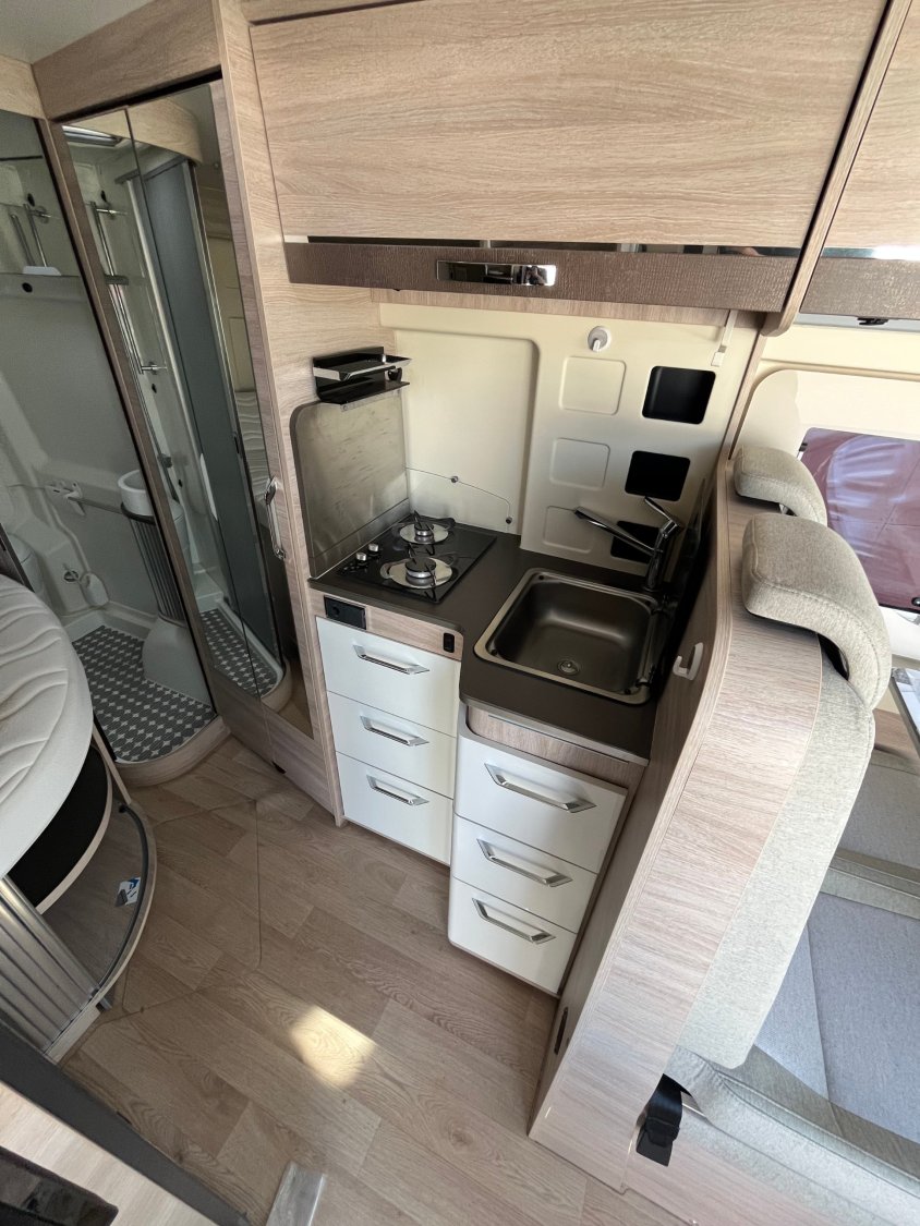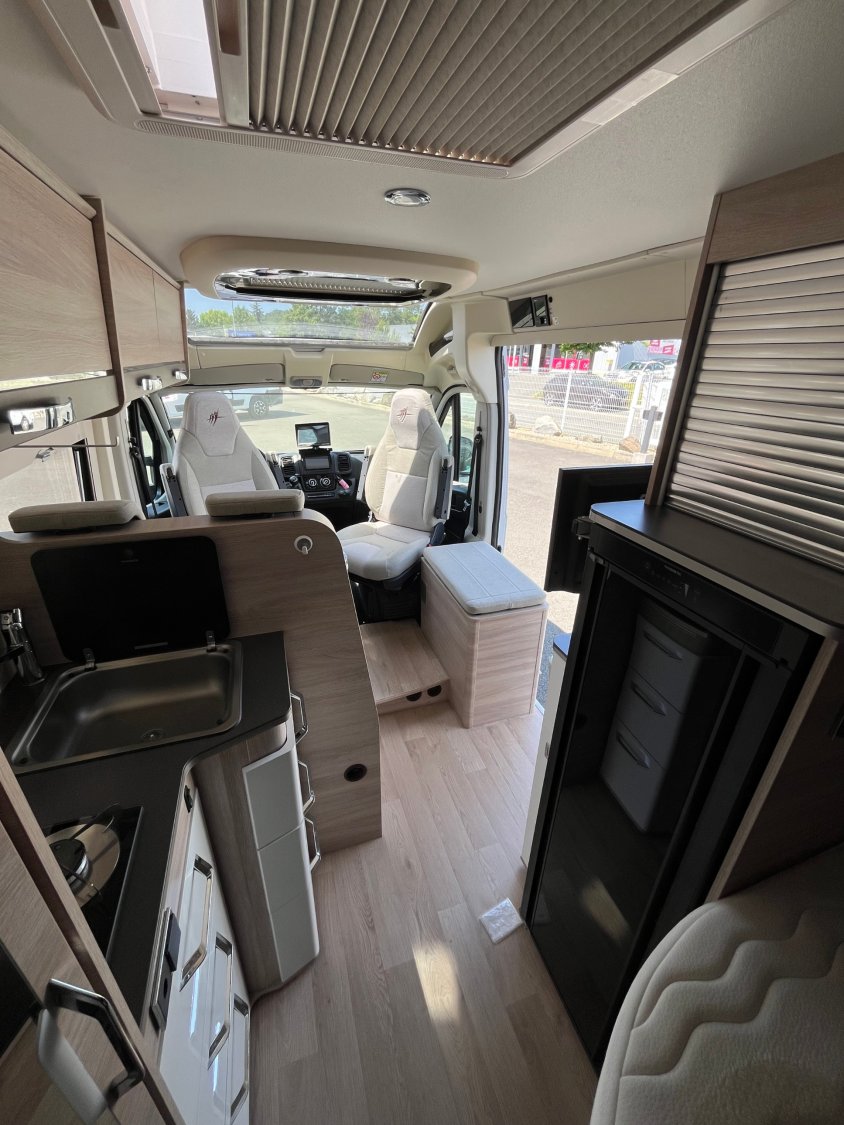 Grande penderie, Toit panoramique, Store, Tv, Antenne, Grand frigo AES 128L, Climatisation, Camera de recul, Lit à la française, Panneau solaire, Maxi salle de bain à l'arrière, Busbiker