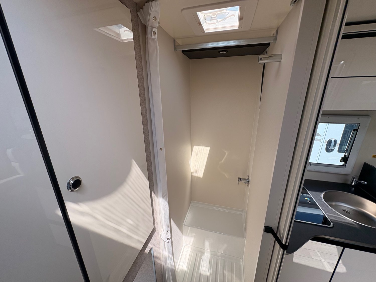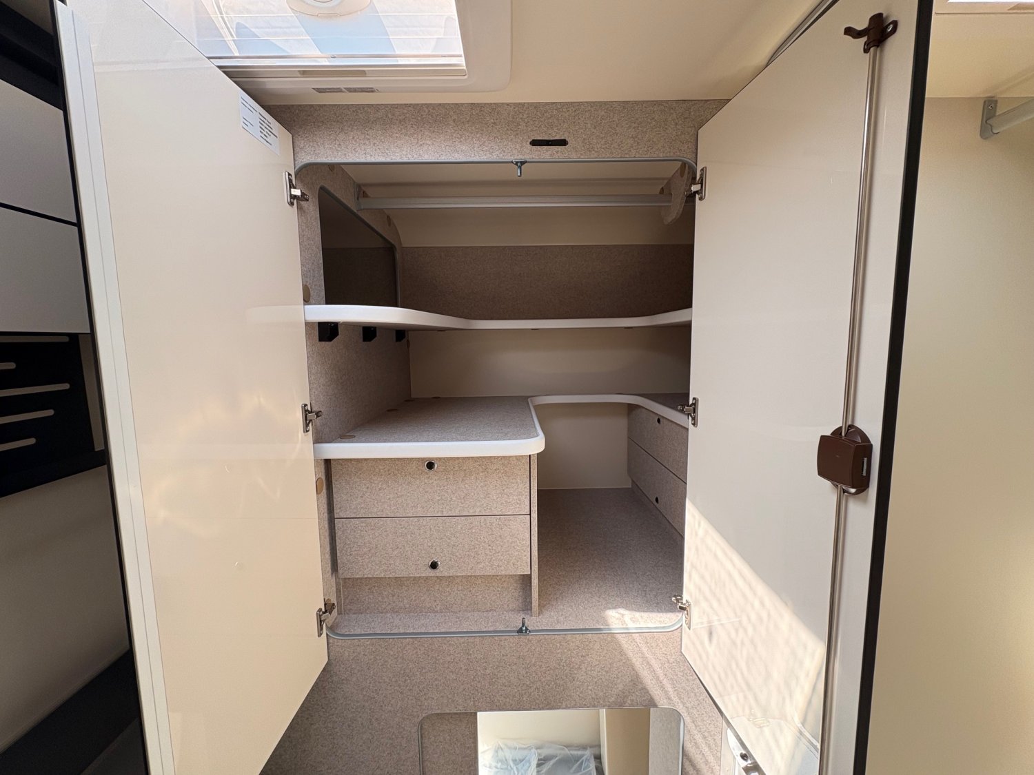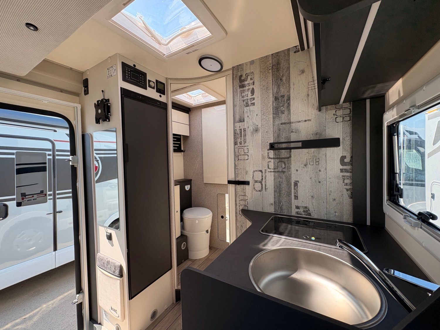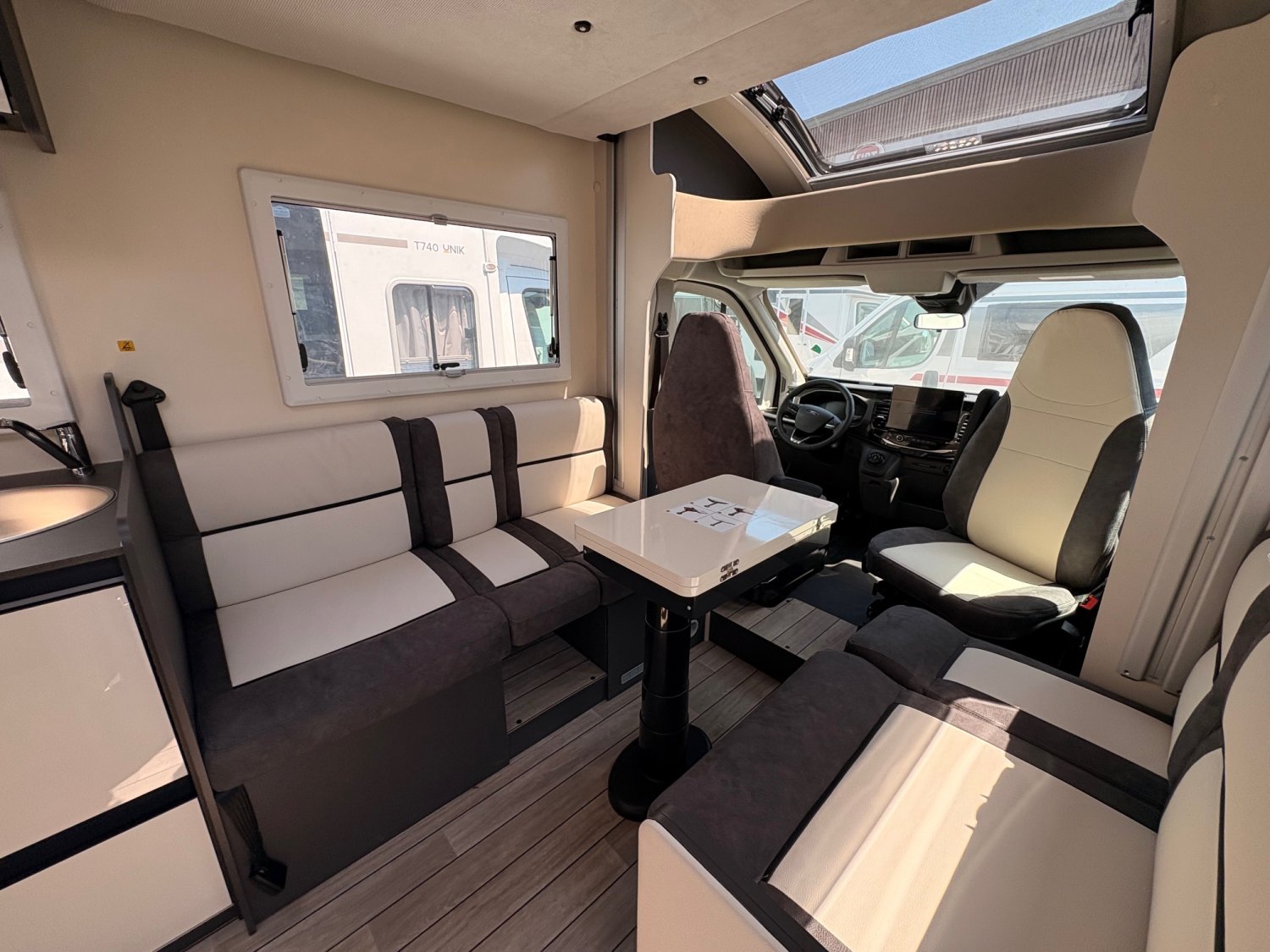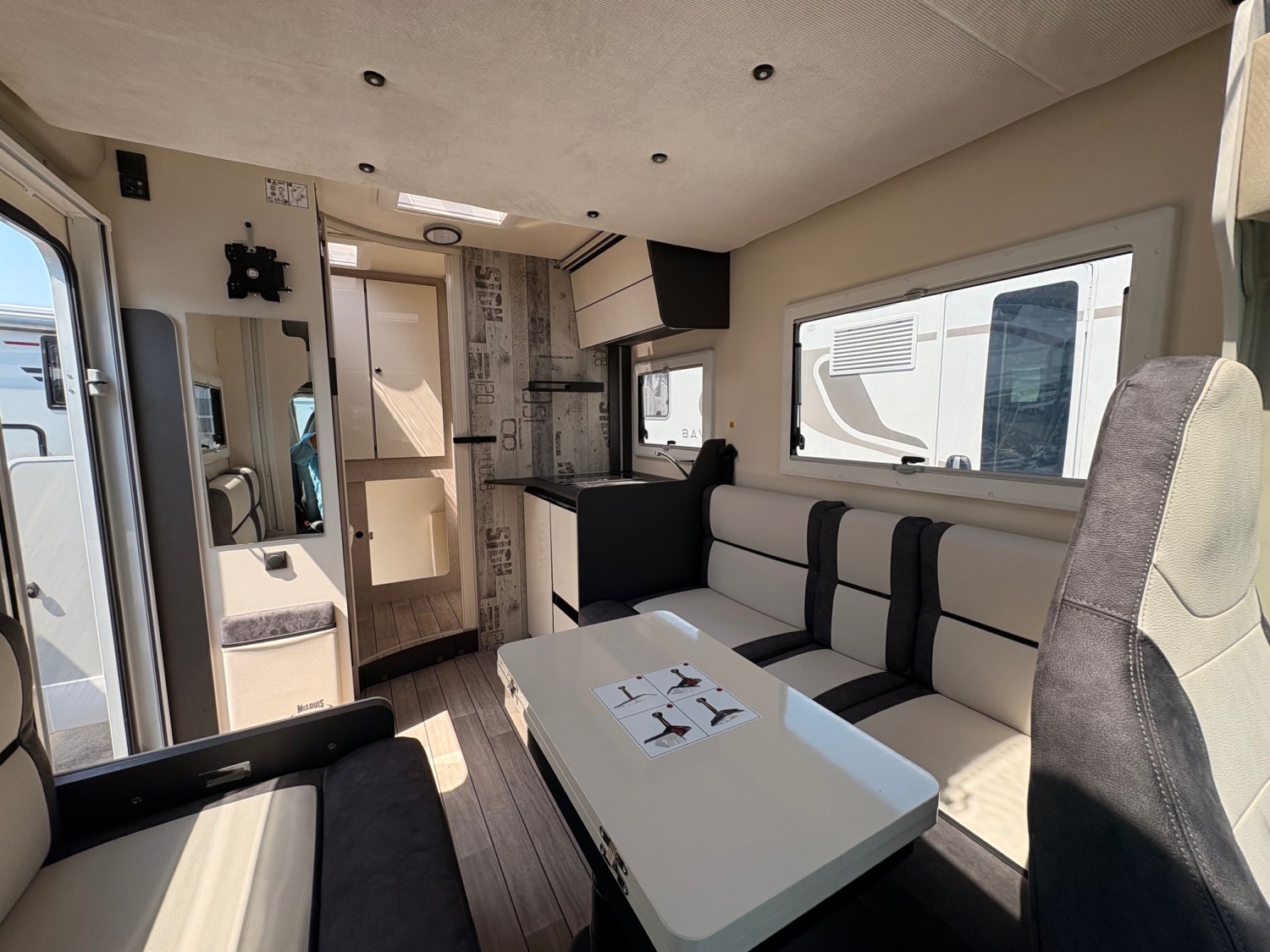 Profilé avec lit de pavillon, grande dinette face à face, salle de bain arrière et garde-robe arrière. Dimensions compactes : seulement 2,15 m de large, avec une longueur et une hauteur réduites. Lit de pavillon 2 places 190 cm de série.
