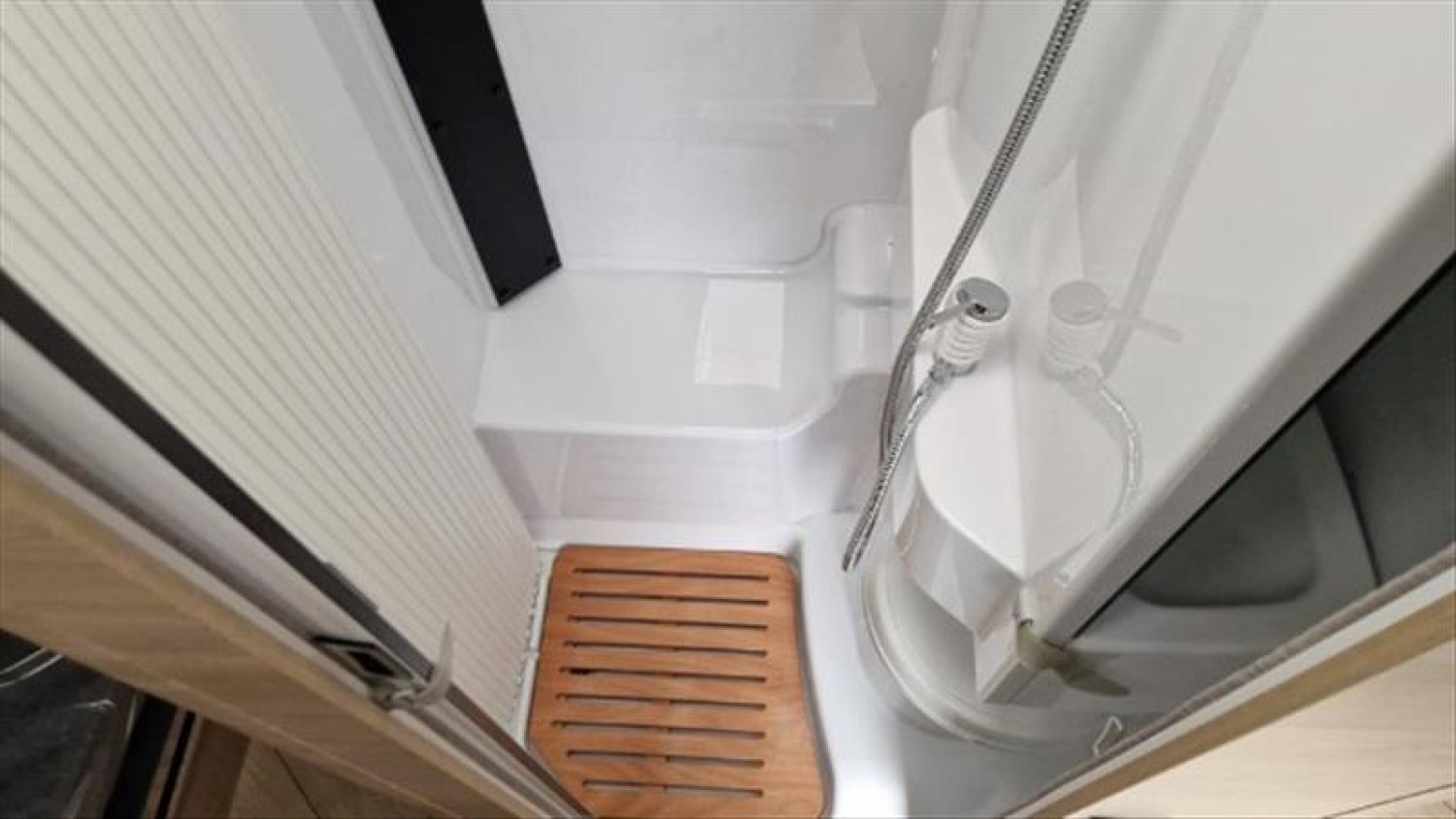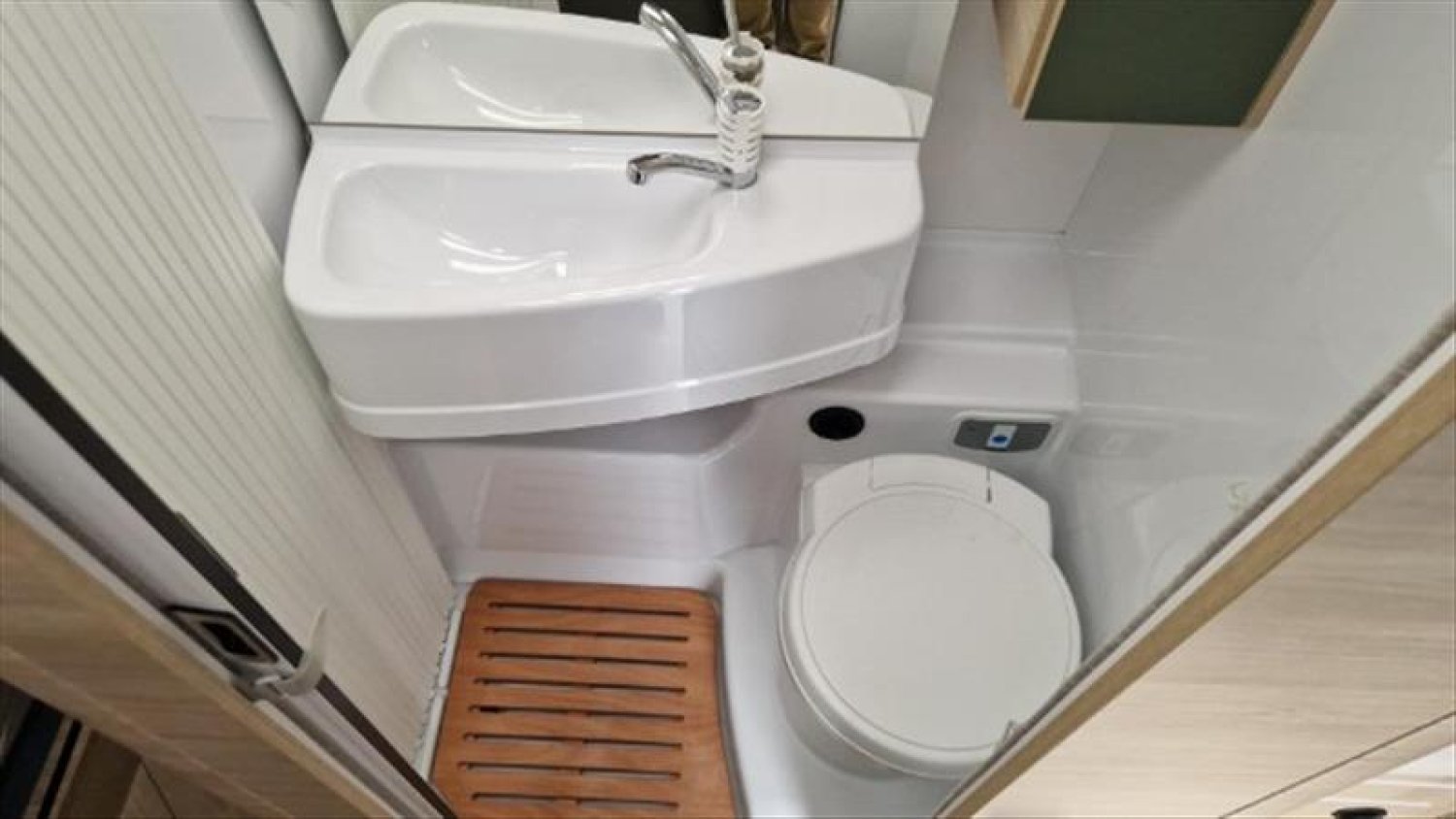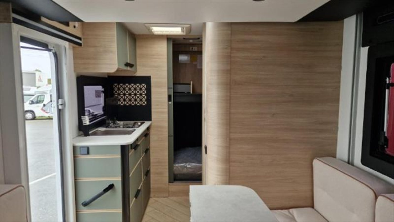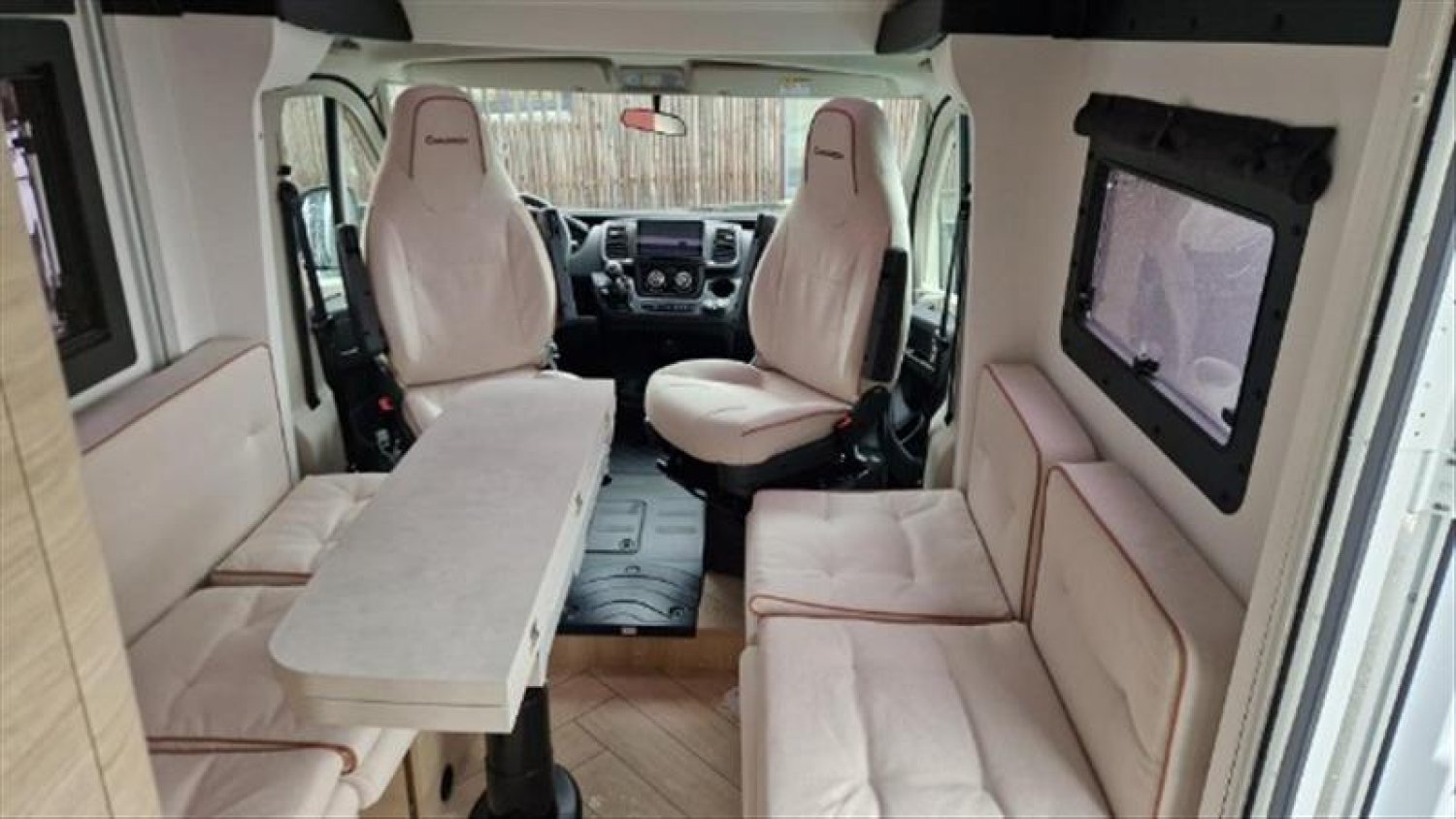 Profilé compact de 6,36 m sur Fiat Ducato, 4 places CG et 4 couchages. Lit pavillon électrique, salon face-face, cuisine équipée et douche séparée. Motorisation 2.2L 140 CV avec climatisation cabine et régulateur. Design soigné avec jantes alliage noires et volant cuir.
