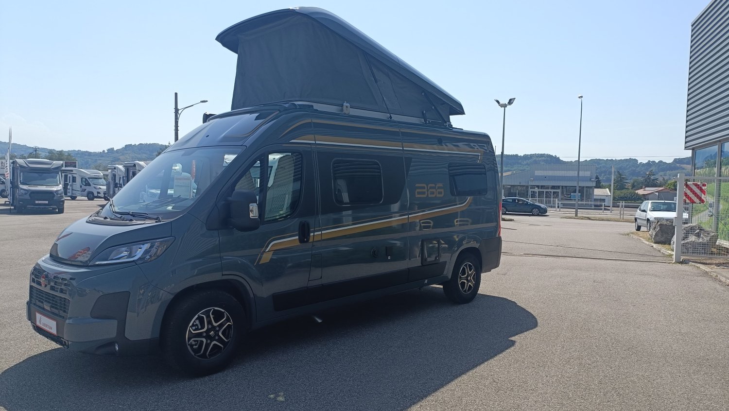 Burstner fait très fort avec cette série B 66. Ce fourgon de 5m99 dispose de 4 couchages avec un grand lit transversal arrière et toit relevable. Coup de cœur assuré tant il séduisant par sa couleur extérieure Gris Lanzarote, sa sérigraphie spécifique B66, sa sellerie cuir et son nouveau mobilier. Intérieurement, il est admirablement bien conçu avec une belle chambre arrière avec un lit en 150x197cm, une salle de bain vario, une cuisine astucieuse et un salon généreux. Un niveau d'équipement de série très appréciable.