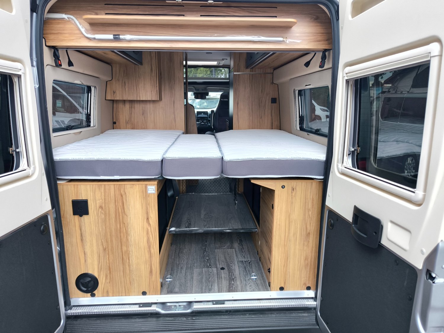 Le Duo Van crée en 2014, a été spécialement conçu pour les couples, offrants des espaces de vie généreux. Ses lits arrière jumeaux sur sommiers à lattes peuvent se transformer en un grand lit simple, avec de nombreux rangements intégré. Son coin toilette, avec WC escamotable et paroi de douche, est à la fois pratique et spacieux.