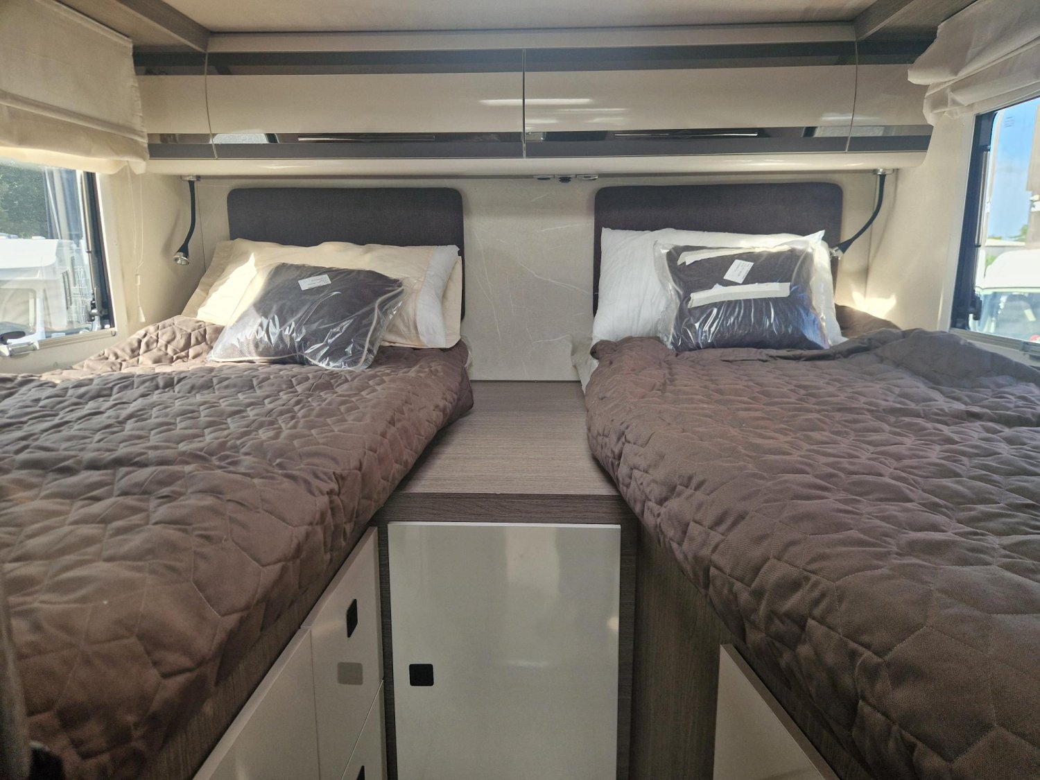 Profilé compact de marque leader en lits jumeaux hauts, 4 couchages et 4 places carte grise, entièrement équipé sur une base Fiat 2.2 l / 140 Cv en BVA.
