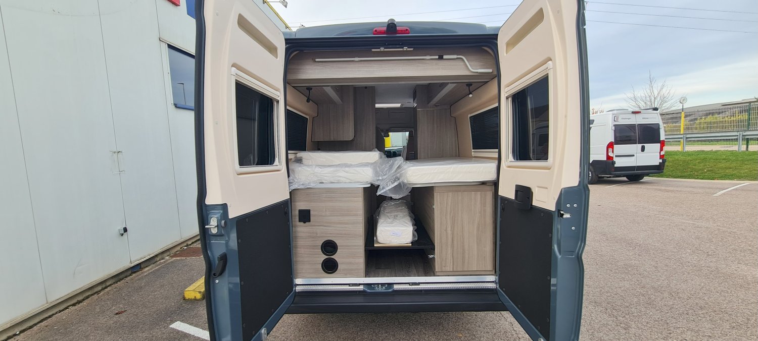Moustiquaire de porte latéral, Stores occultations cabine, Pré équipement tv, Douchette ext eau froide, Rétro-caméra de recul, Banquette isofix, Chauffage sur l'avant du véhicule, Grand frigo 138L, Pack multimedia avec GPS, Store extérieur, Panneau solaire, Batterie Lithium 120ah, Rétro caméra de recul