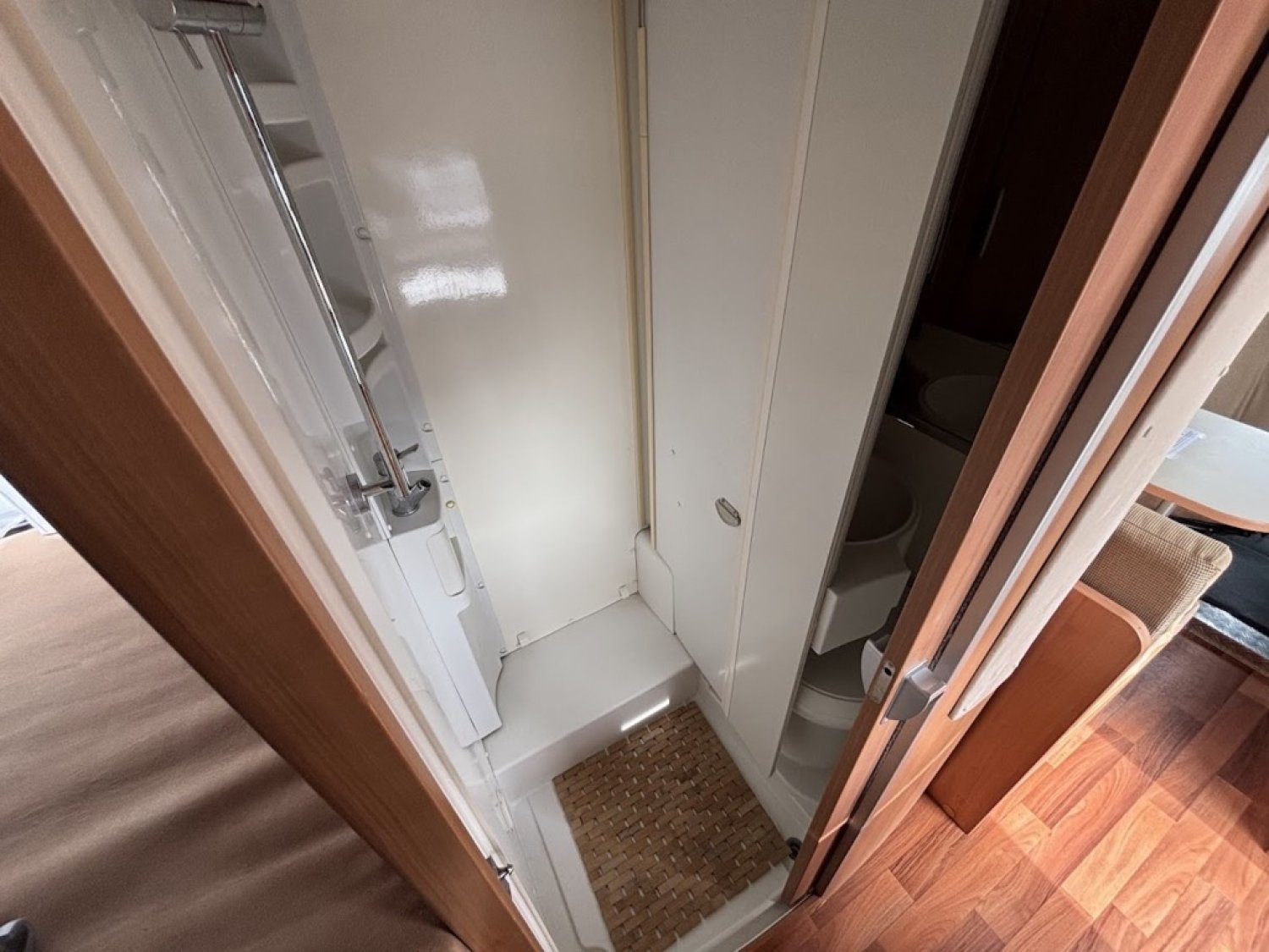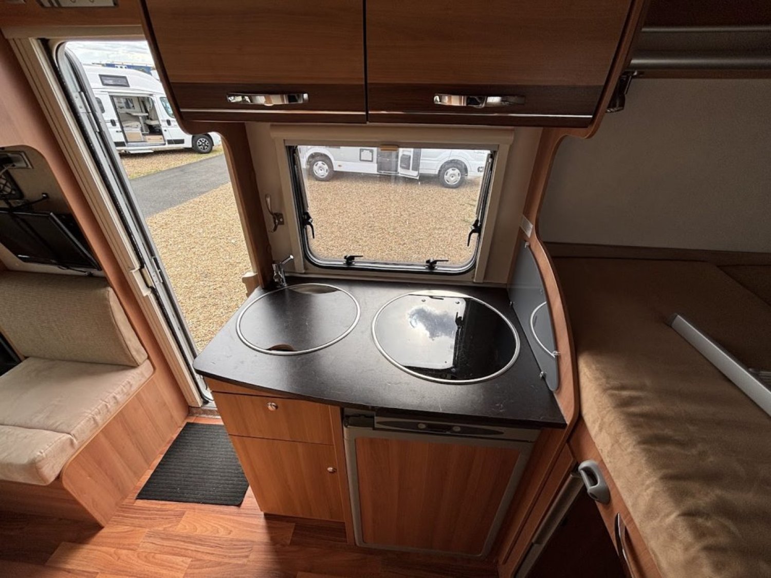 Cuisine en long, Douche à vario, Grande soute, Lit arrière transversal, Lit toit relevable, Salon avant sièges pivotants, WC Cassette.