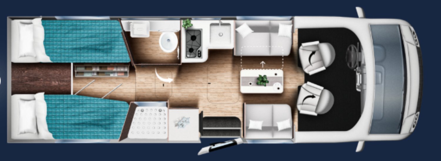 Avec ses deux lits jumeaux à l’arrière, son grand salon face-face, sa cuisine équipée et sa salle d’eau avec douche séparée, il offre tout le confort nécessaire pour partir loin, longtemps et bien installés.