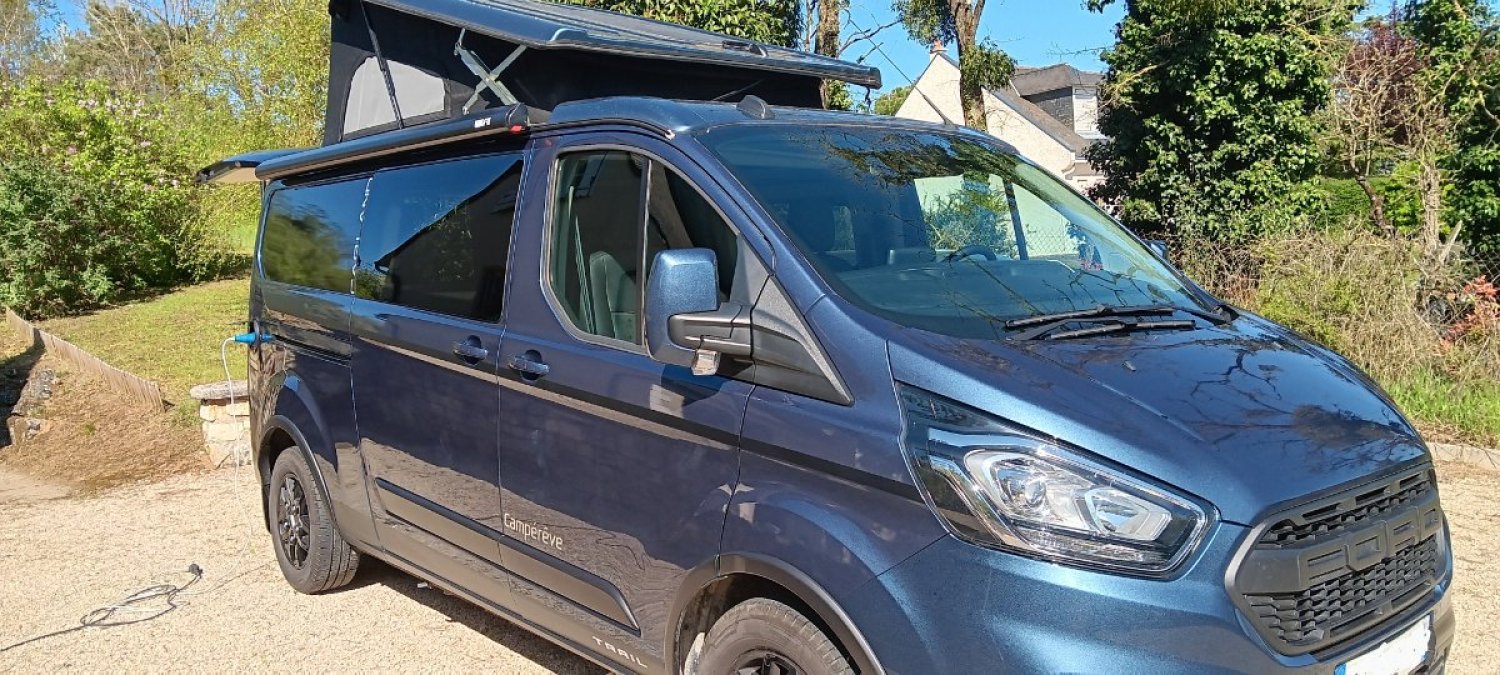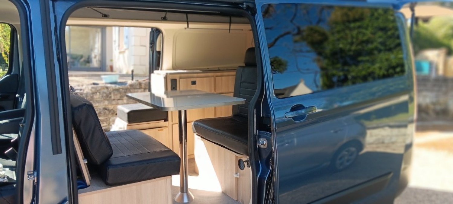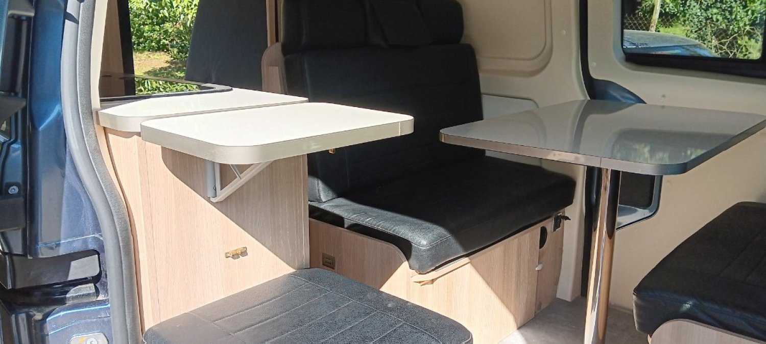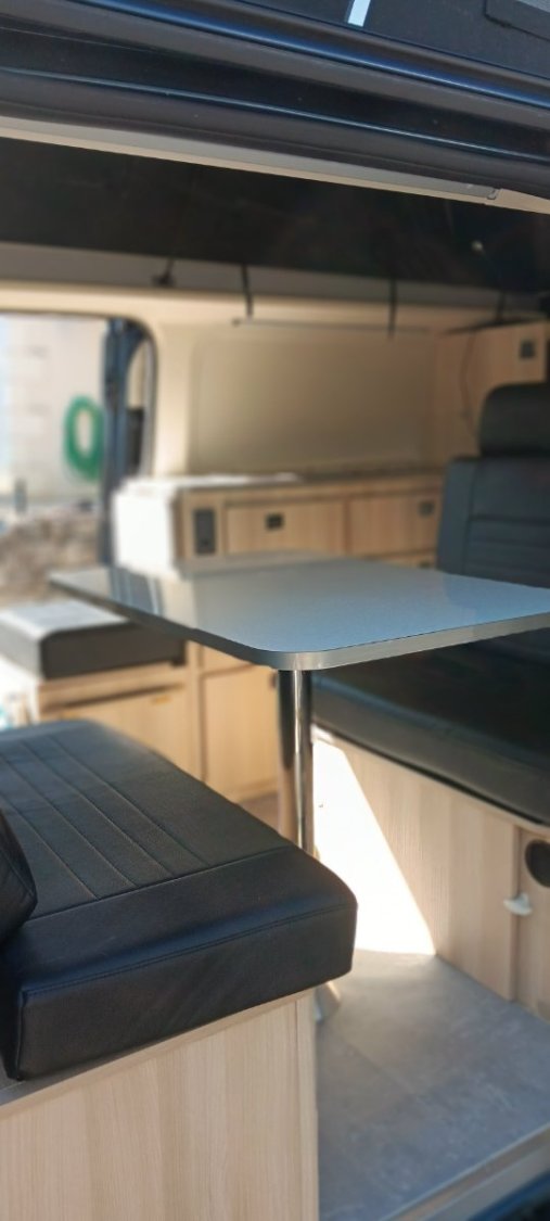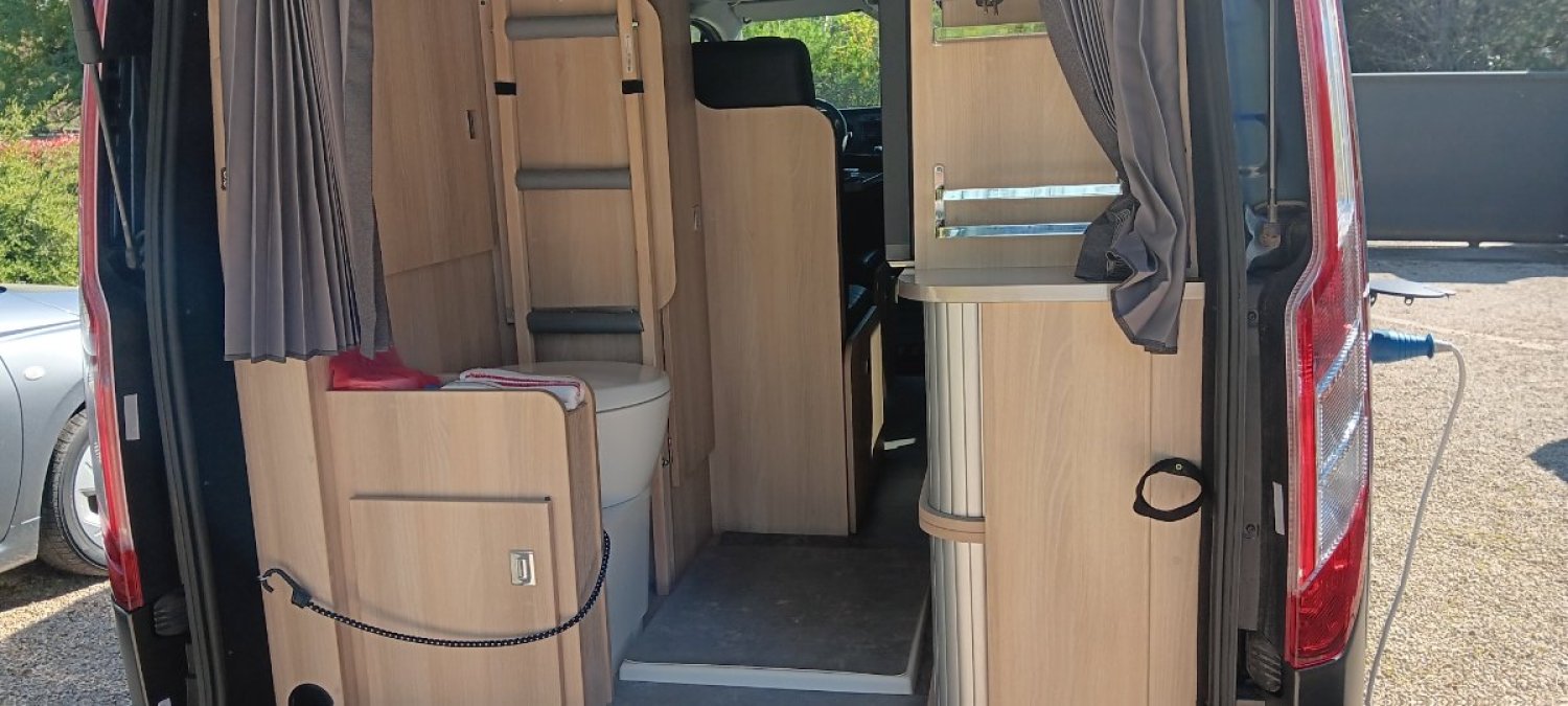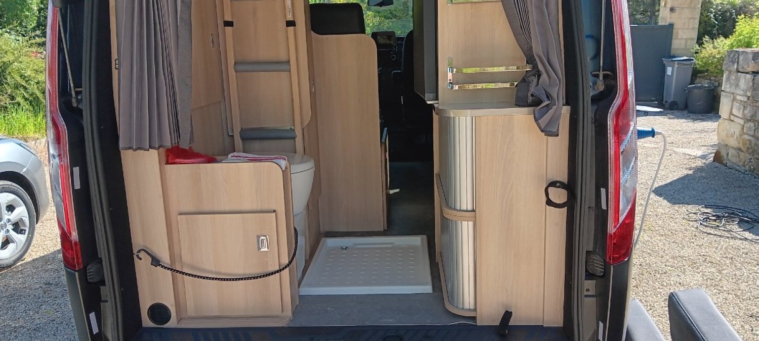Van aménagé comprenant un grand salon avec banquette face / face, une cuisine avec de nombreux rangements, un réfrigérateur, une douche, un WC casette et un toit relevable.