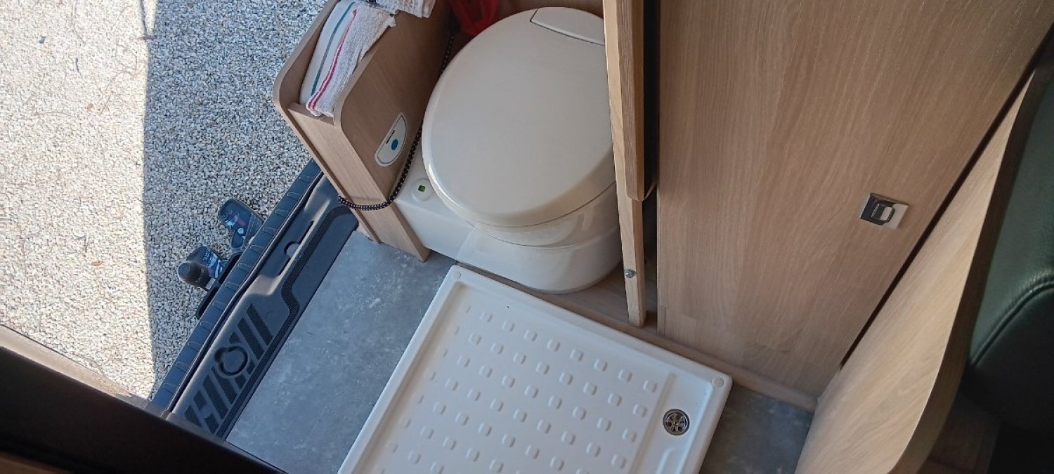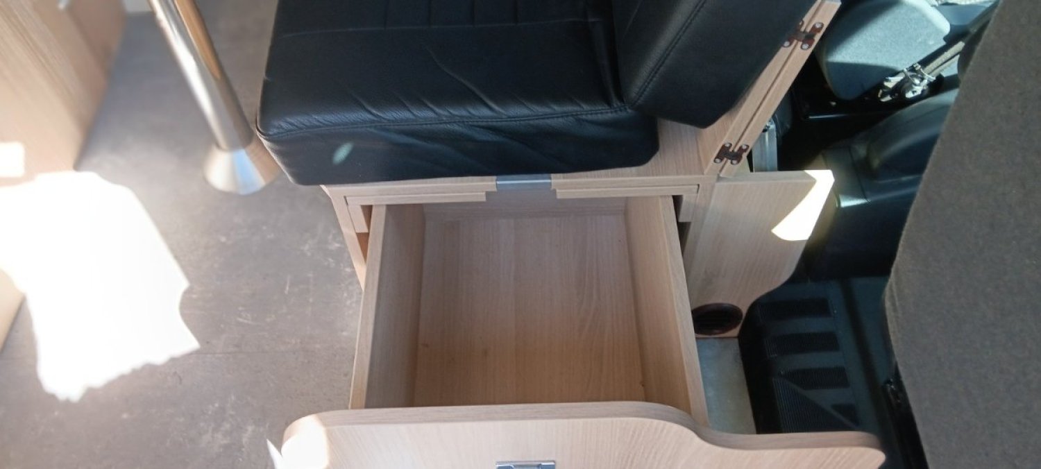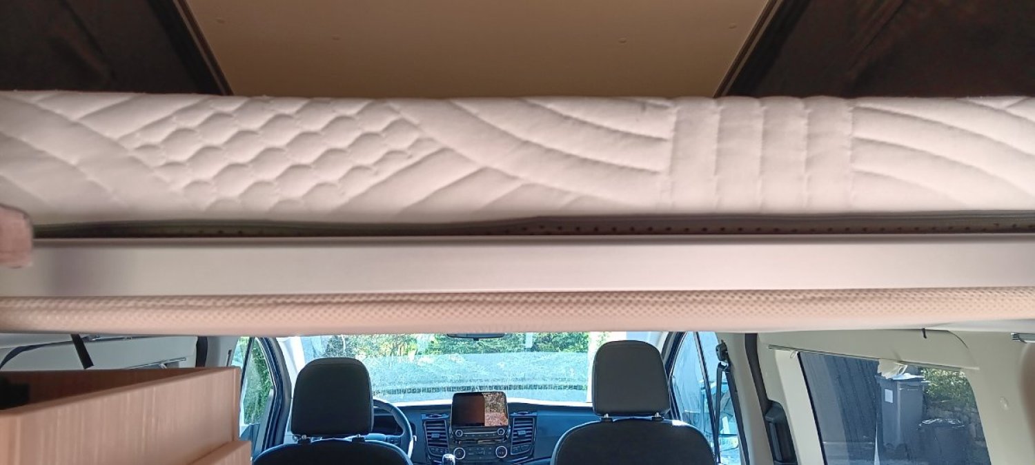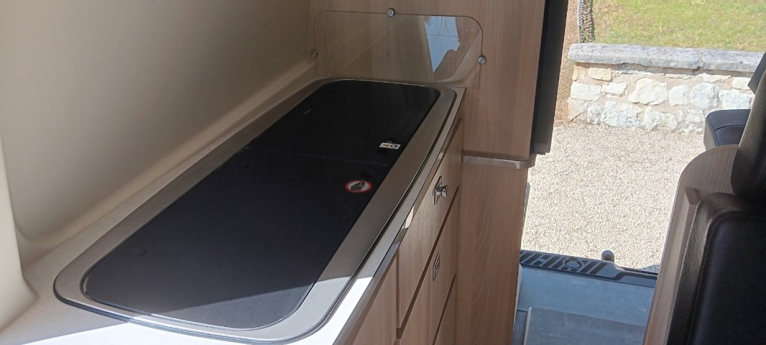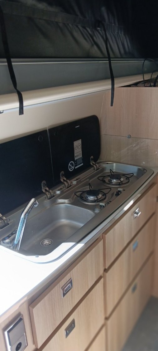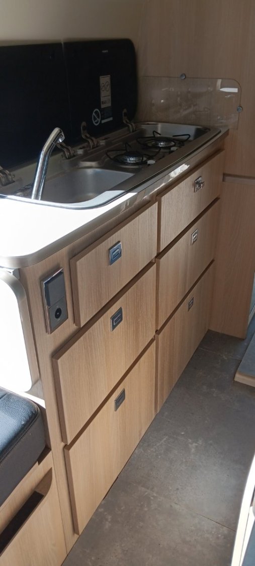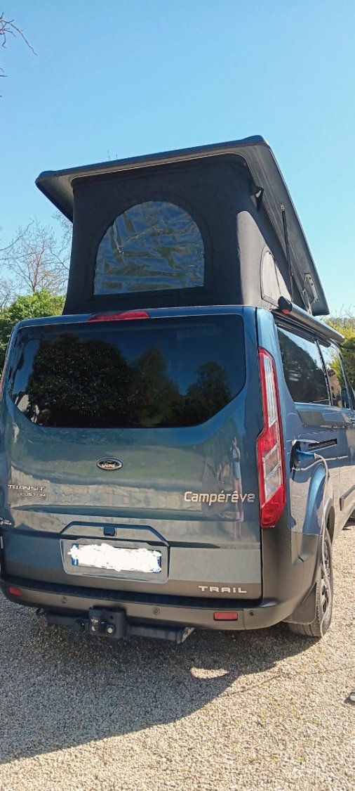 Van aménagé comprenant un grand salon avec banquette face / face, une cuisine avec de nombreux rangements, un réfrigérateur, une douche, un WC casette et un toit relevable.