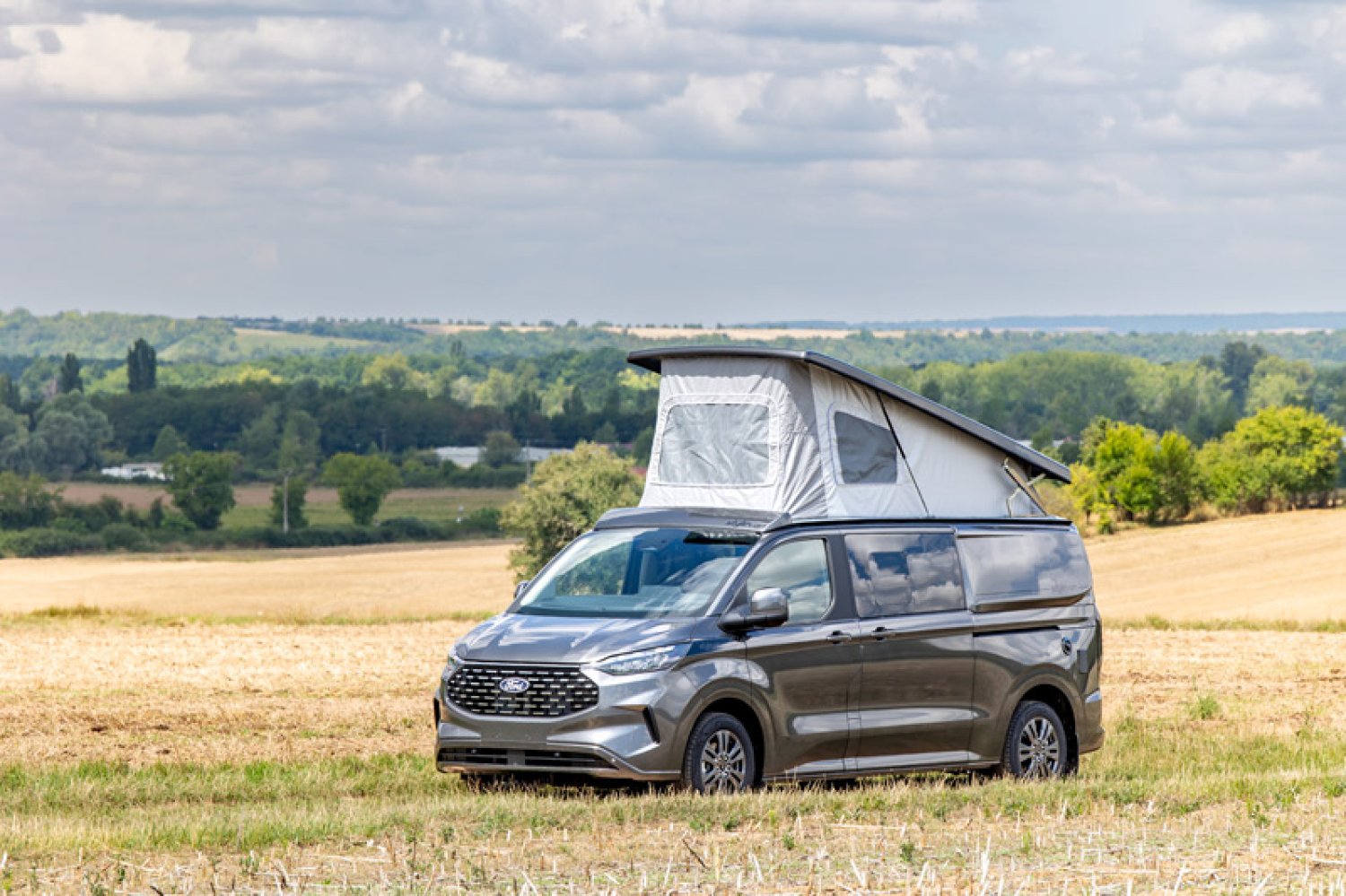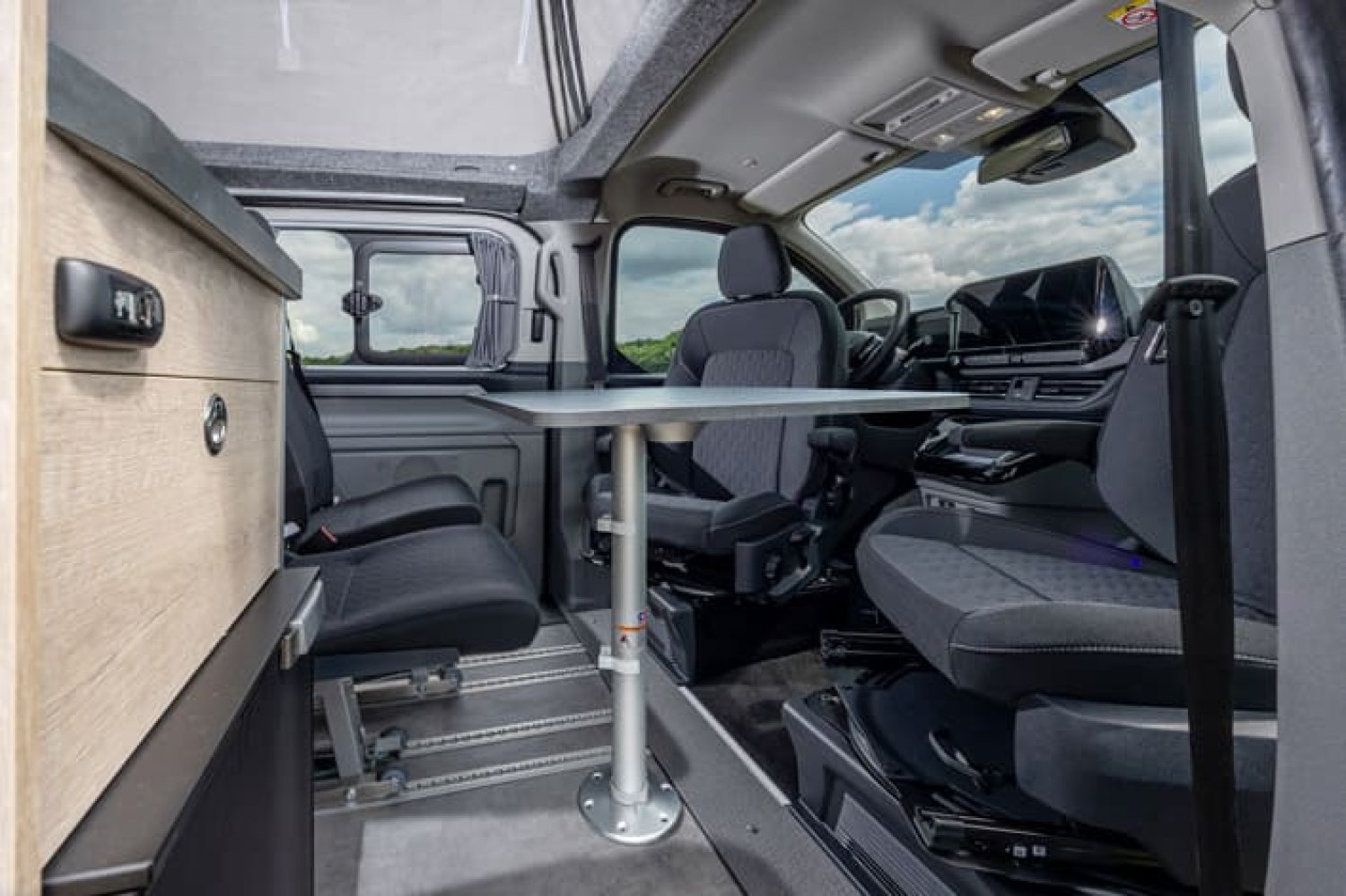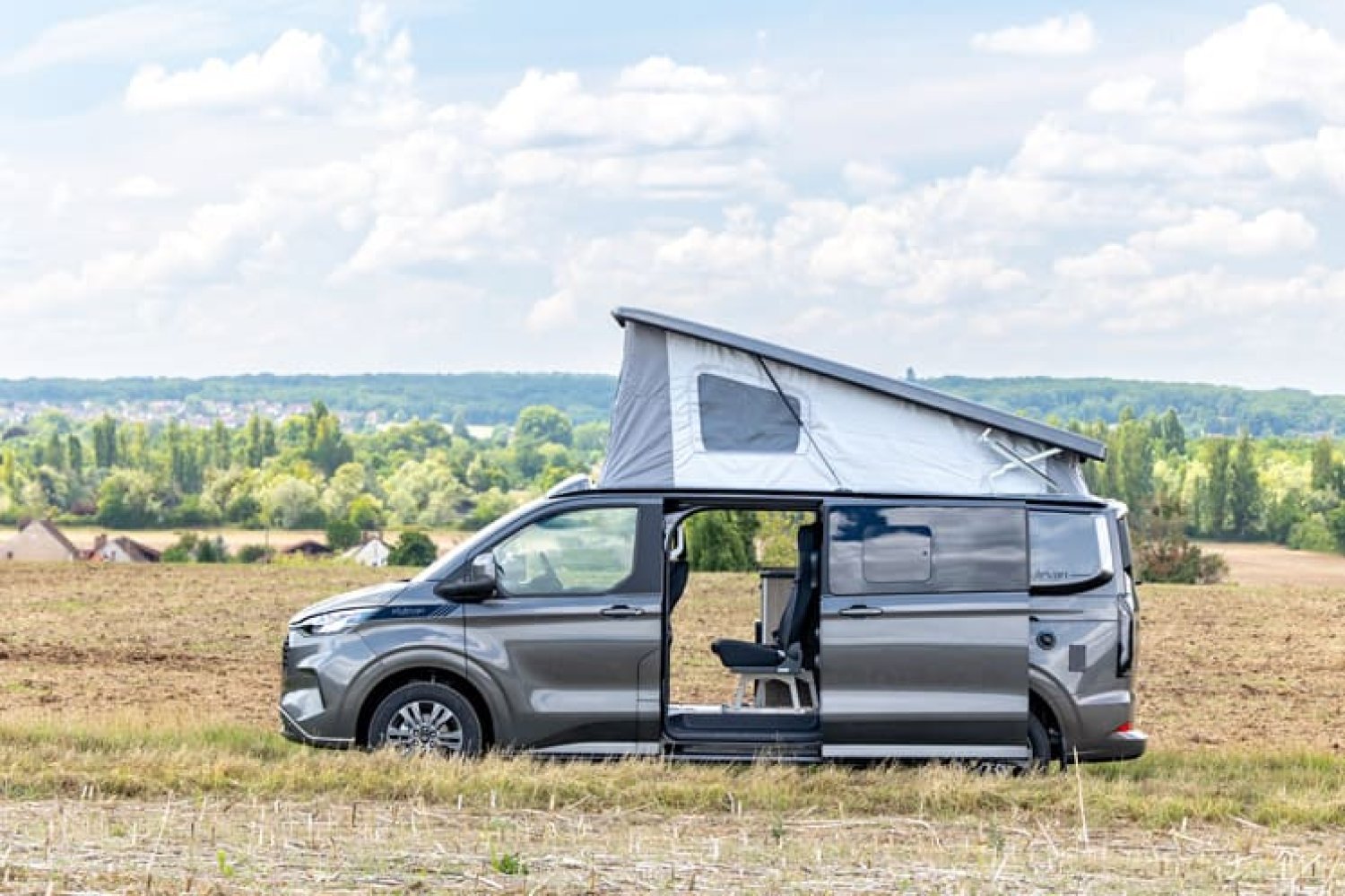 Van aménagé haut de gamme sur base Ford Custom L2H1 (5,45 m), version longue pour plus d’espace à bord.