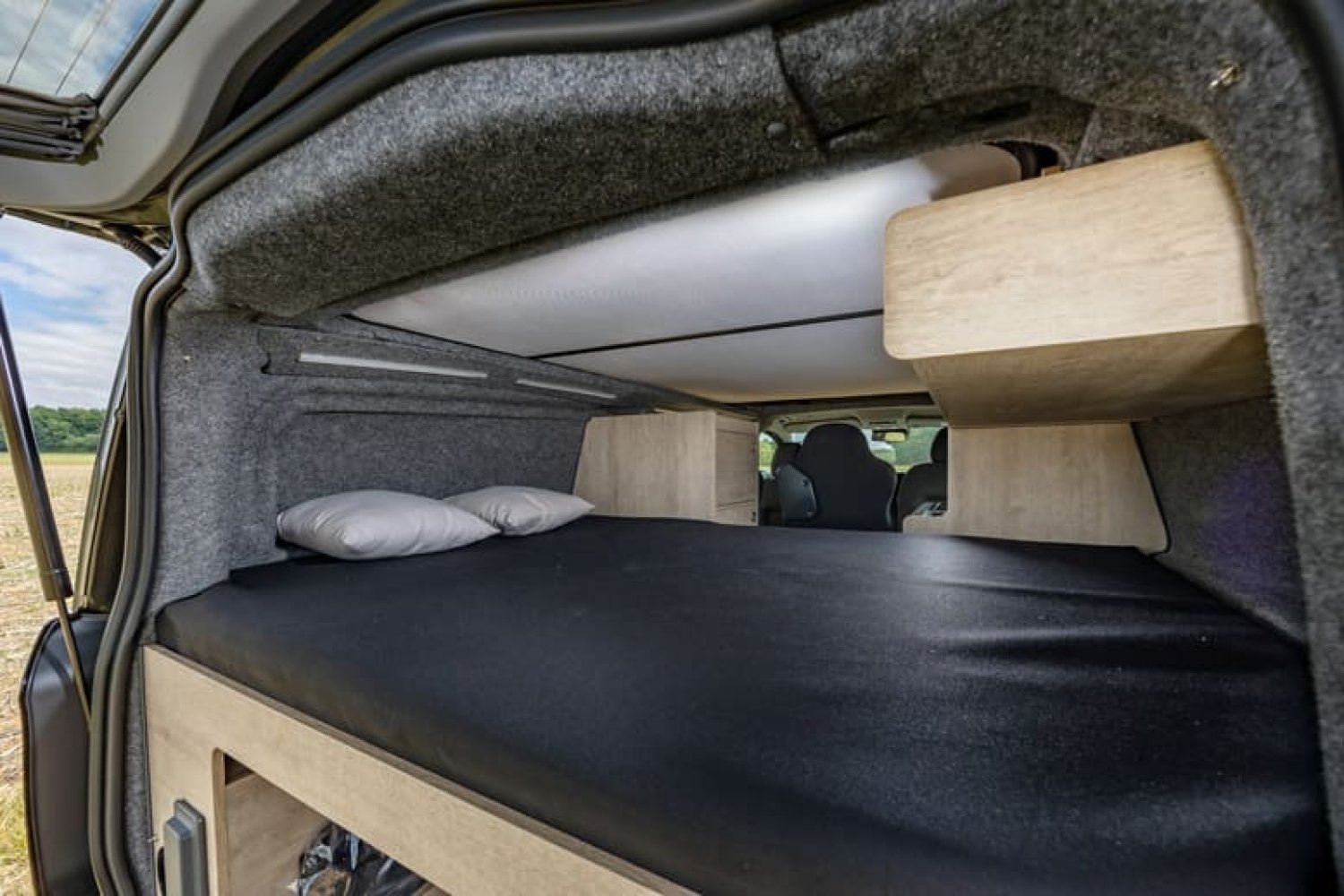- Couchage permanent : lit transversal arrière (135 x 188 cm) + option lit dans le toit relevable.