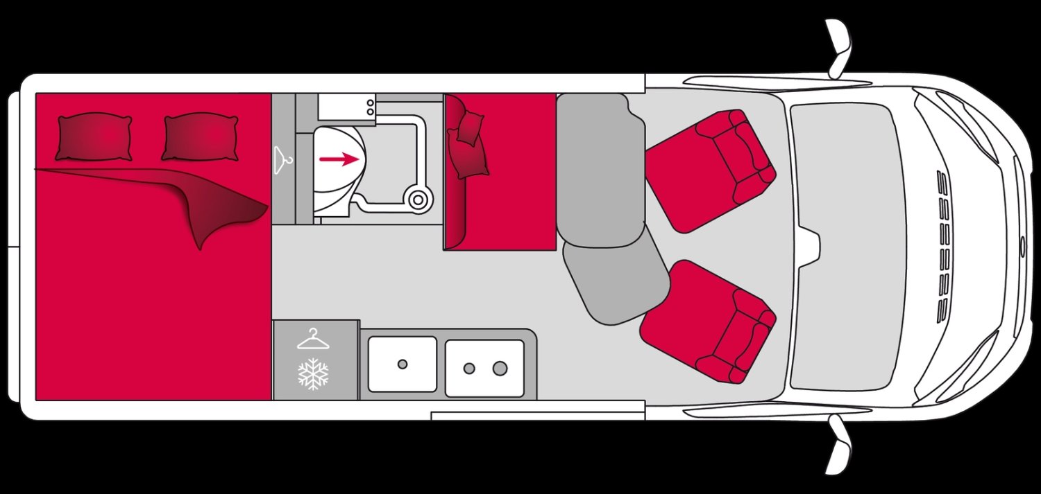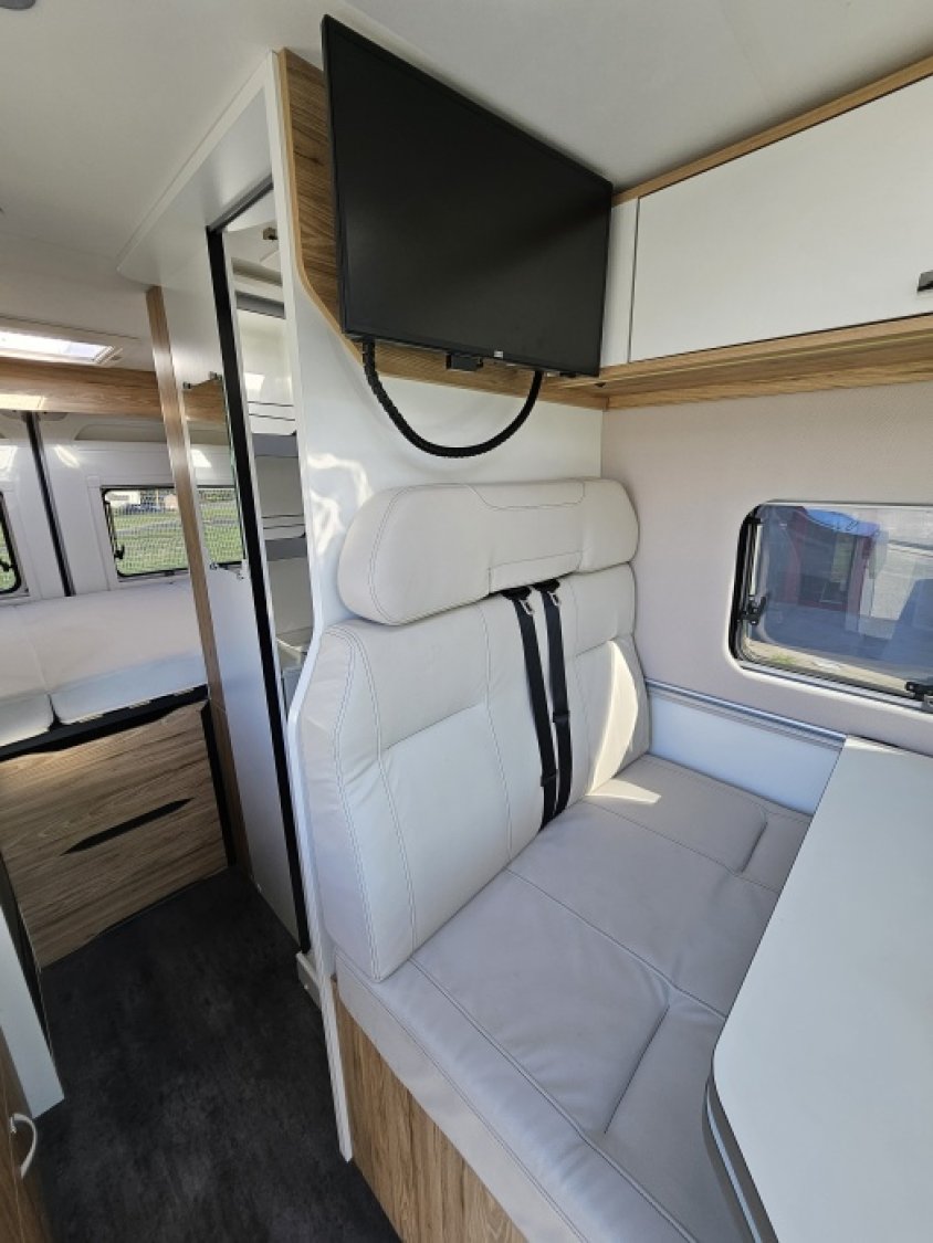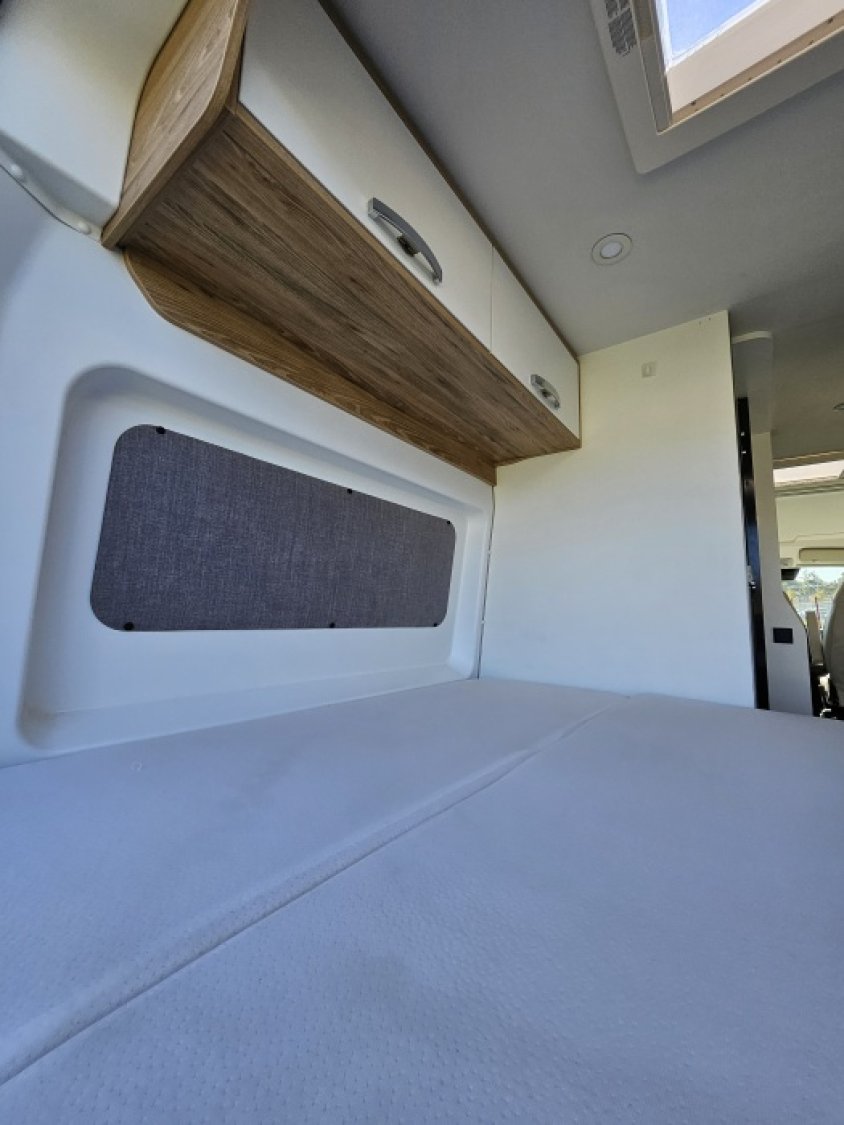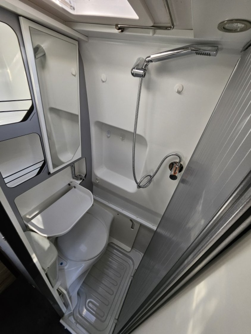 AMENAGEMENT INTERIEUR : Lit transversal 2 places. Lit dinette 1 places. Salle de bain et toilette non séparés (WC coulissant offrant la plus grande douche du marché). Moustiquaires + stores occultants. Siège conducteur et passager pivotants