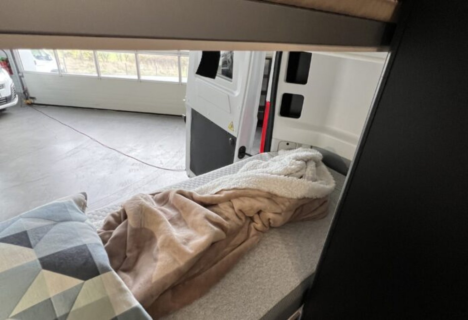 FOURGON HAUT DE GAMME 5M99 AVEC LITS SUPERPOSES ET LIT DE PAVILLON.
