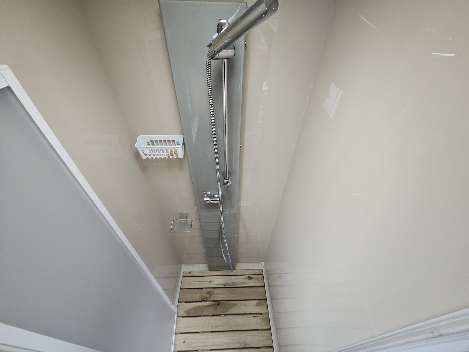 La salle de bain transversale arrière propose une maxi douche séparée.