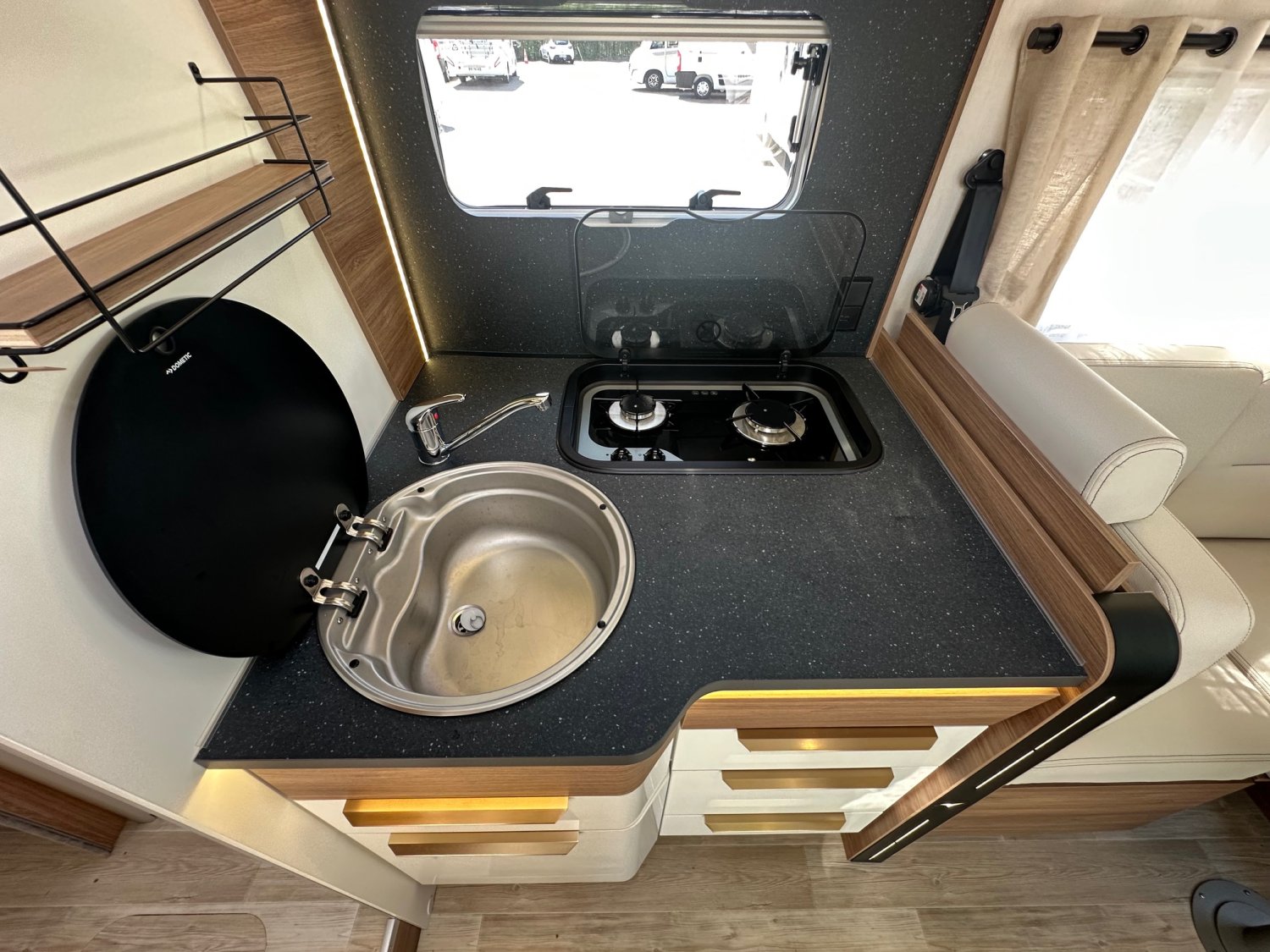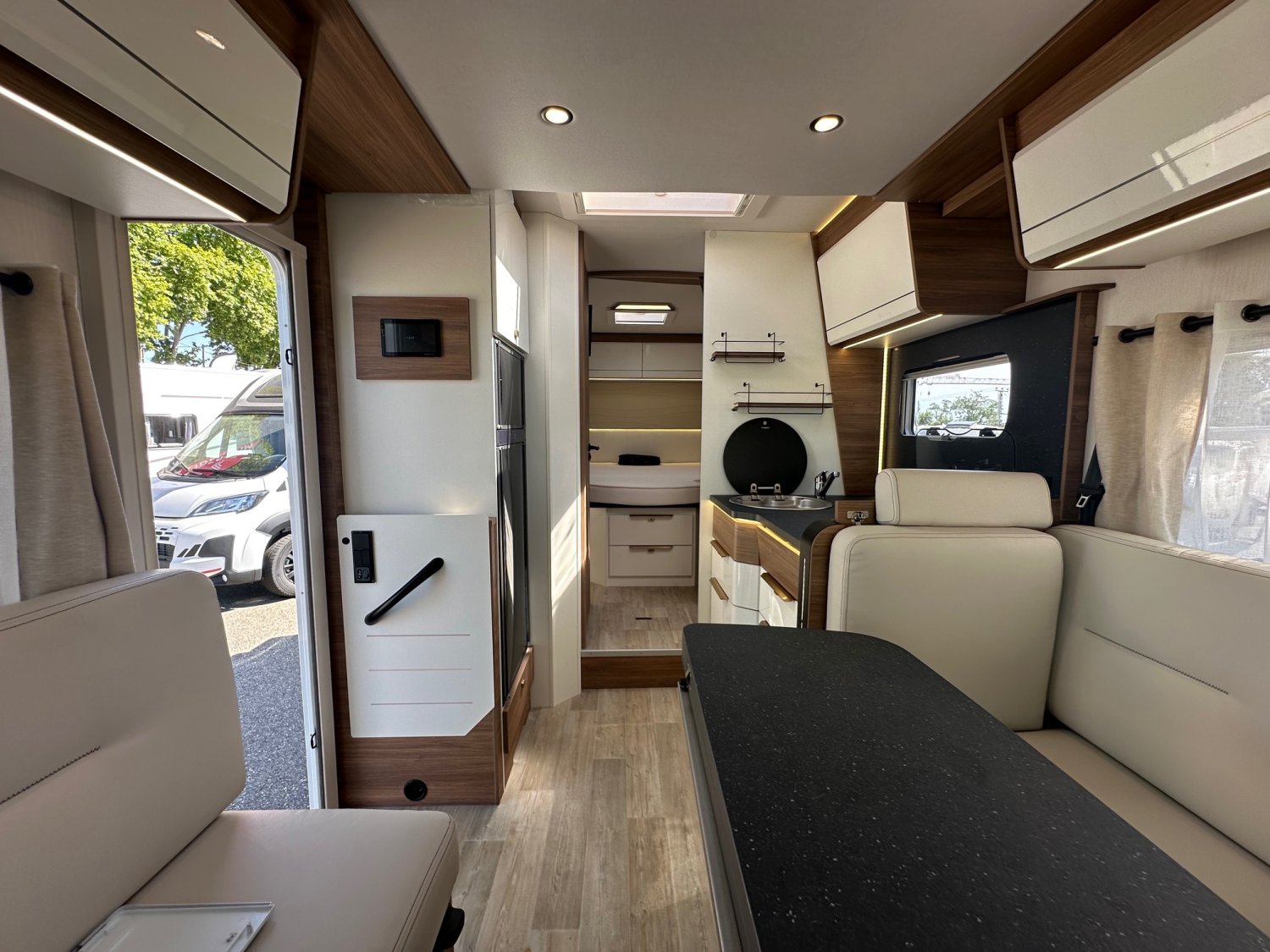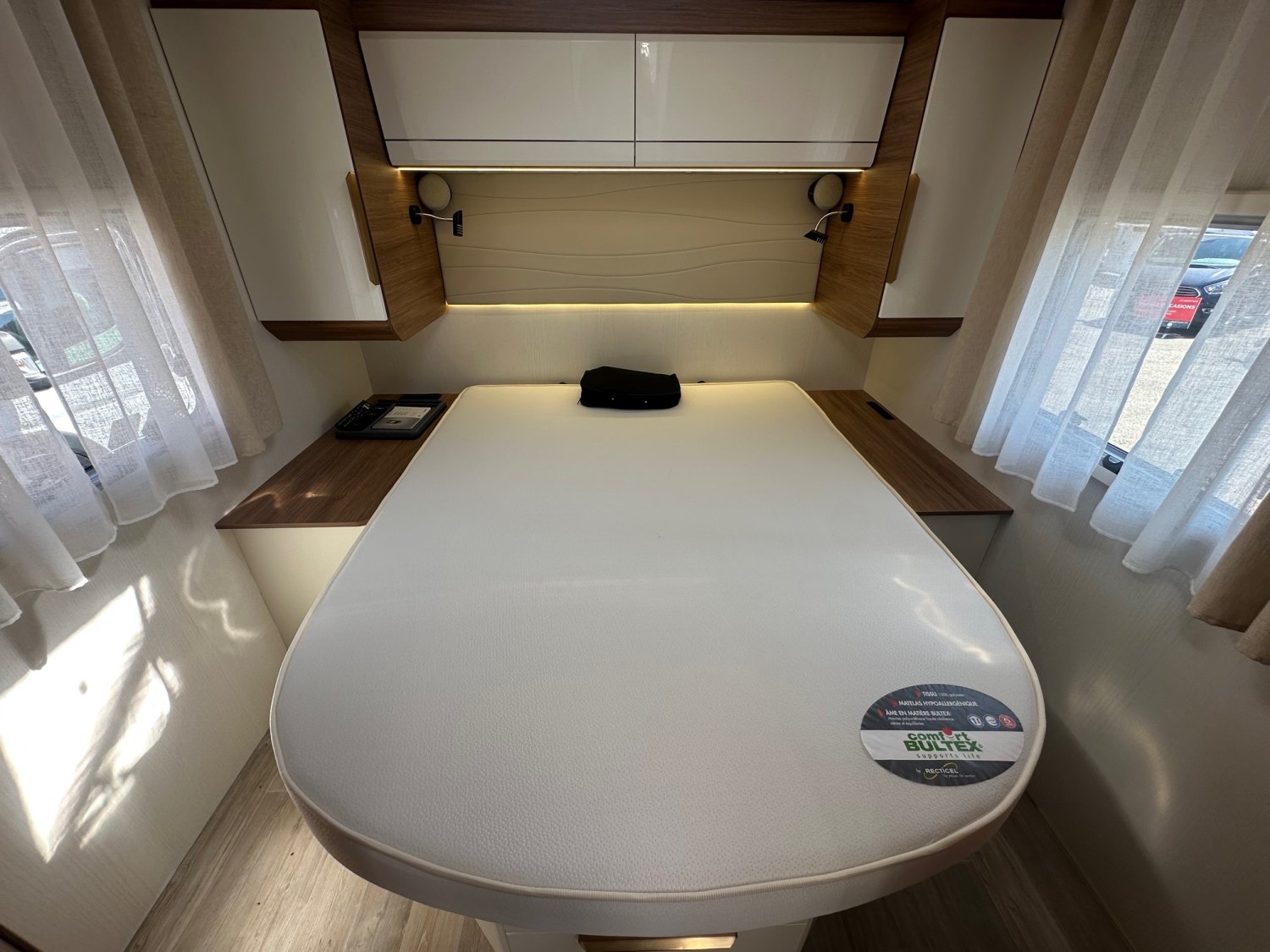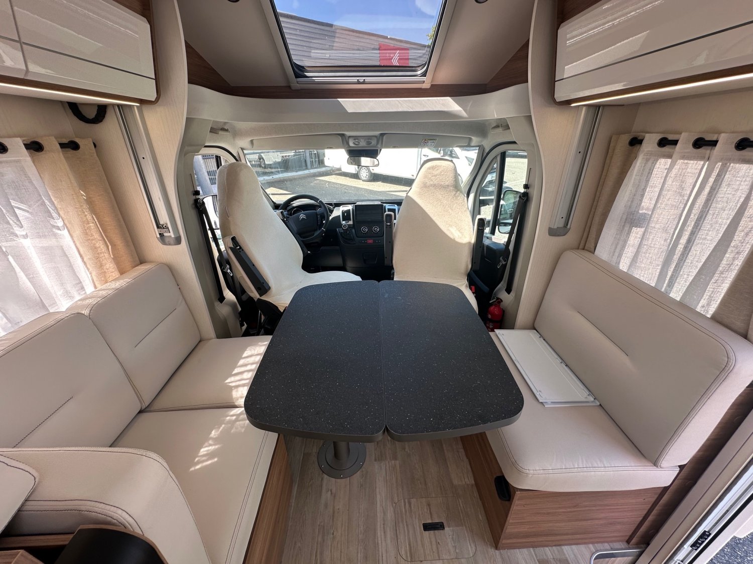 Avec ses 7,45 m de long, ce modèle nécessite une certaine vigilance lors des manœuvres, notamment en raison de son porte-à-faux arrière de 2,38 m. Il se distingue par un aménagement très recherché : salon face-face et lit central, une configuration particulièrement appréciée par les acheteurs français. Construit sur un châssis Fiat 140 ch, ce profilé intègre également un traitement intérieur original et bénéficie de nombreux équipements populaires, le rendant prêt à prendre la route.