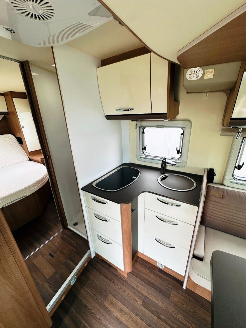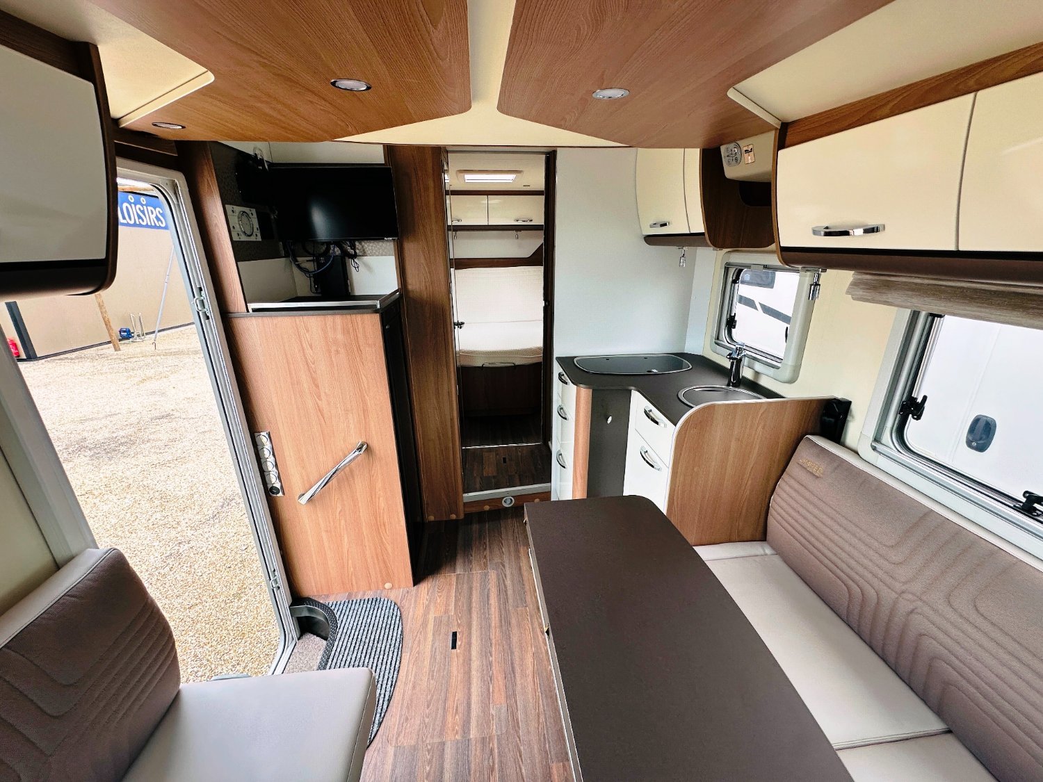 Profilé Burstner, 4 couchages, lit central réglable en hauteur sur soute garage (plusieurs vélos), salle de bain avec grande douche entièrement séparée, double fermeture chambre arrière, cuisine spacieuse et toute équipée, vaste salon avant avec sièges pivotant et table centrale + lit pavillon électrique pour deux adultes.