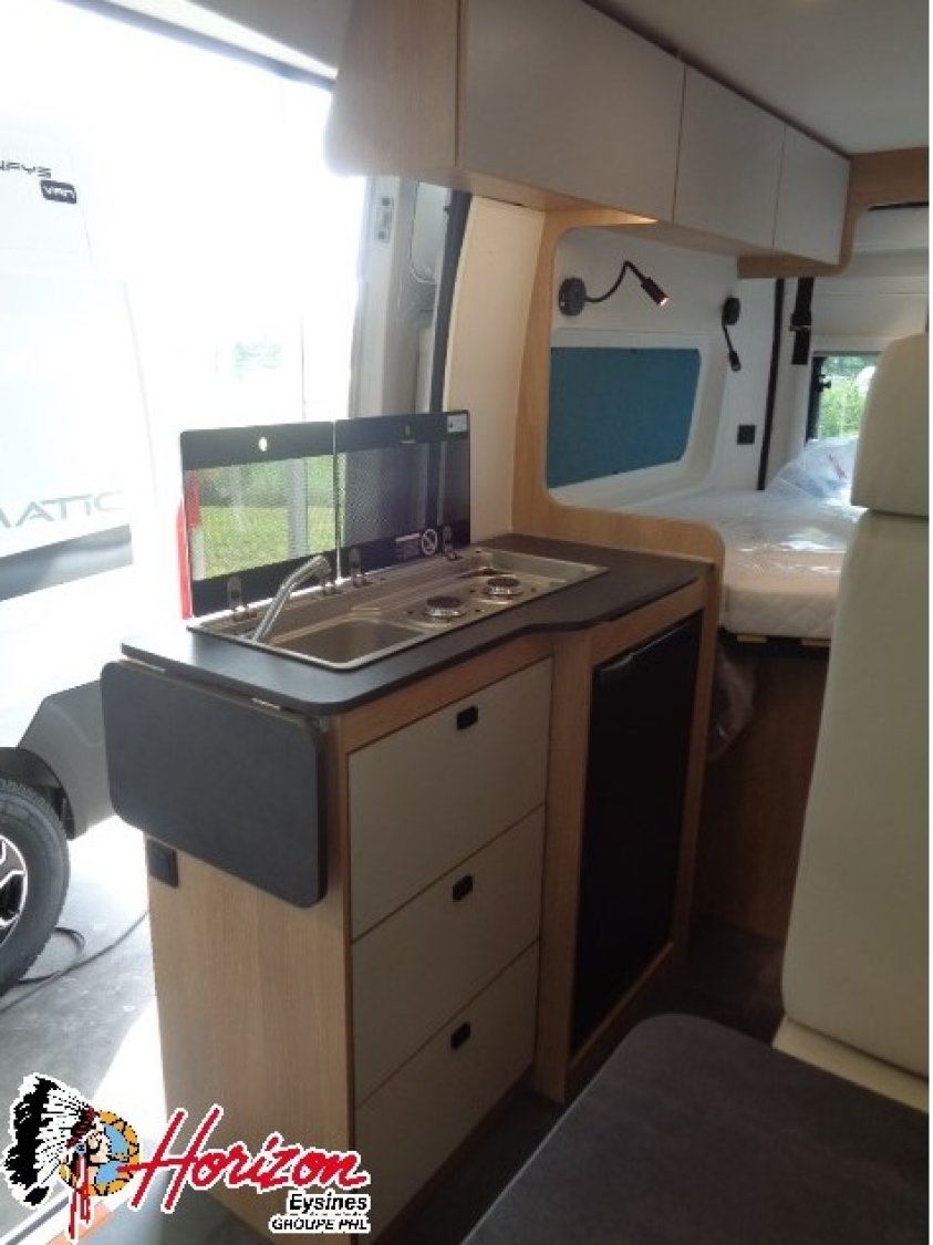 Le 54G est le plus petit fourgon aménagé de chez Joa. Avec ses 5.41m de long, il est idéal pour voyager en solo ou à deux. Très facile à conduire et à manœuvrer quelles que soient les conditions, son agencement intérieur est également très confortable, avec un lit garage, une cuisine tout équipée, une salle d'eau et un salon.