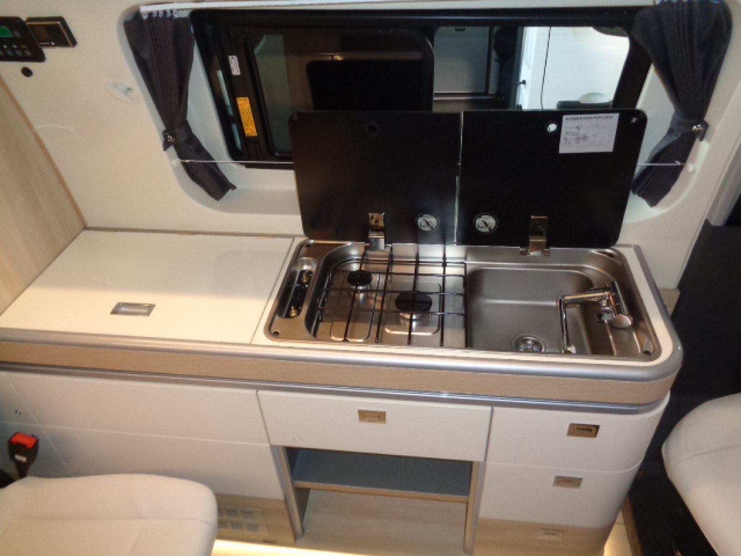 Le Campérêve Cap Coast est un van aménagé de moins de 5 mètres pour 4 personnes. Très bien équipé, il a un grand salon avec des sièges individuels et modulables. Un bel espace de cuisine et un lit dans le toit relevable. Et à l'arrière du véhicule, vous avez une douchette extérieure et de nombreux rangements modulable pour faire vos escapades à deux ou en famille.
