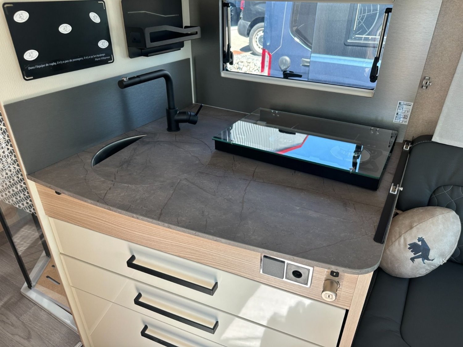 Pack confort (traction +, porte cellule Hartal avec baie et moustiquaire, stores plissés Remis en cabine, autordio double din-DAB+ avec kit main libre et caméra de recul, rétroviseurs électriques et dégivrants, commande digitale Truma, haut parleurs AV, convertisseur DC/DC, sièges cabine règlables en hauteur, vide poche central, hotte cuisine digitale, inverseur de gaz automatique Duo control, matelas Evoluflex haute résilience, transformation dinette en couchage, plaid et coussins déco, galerie de toit)