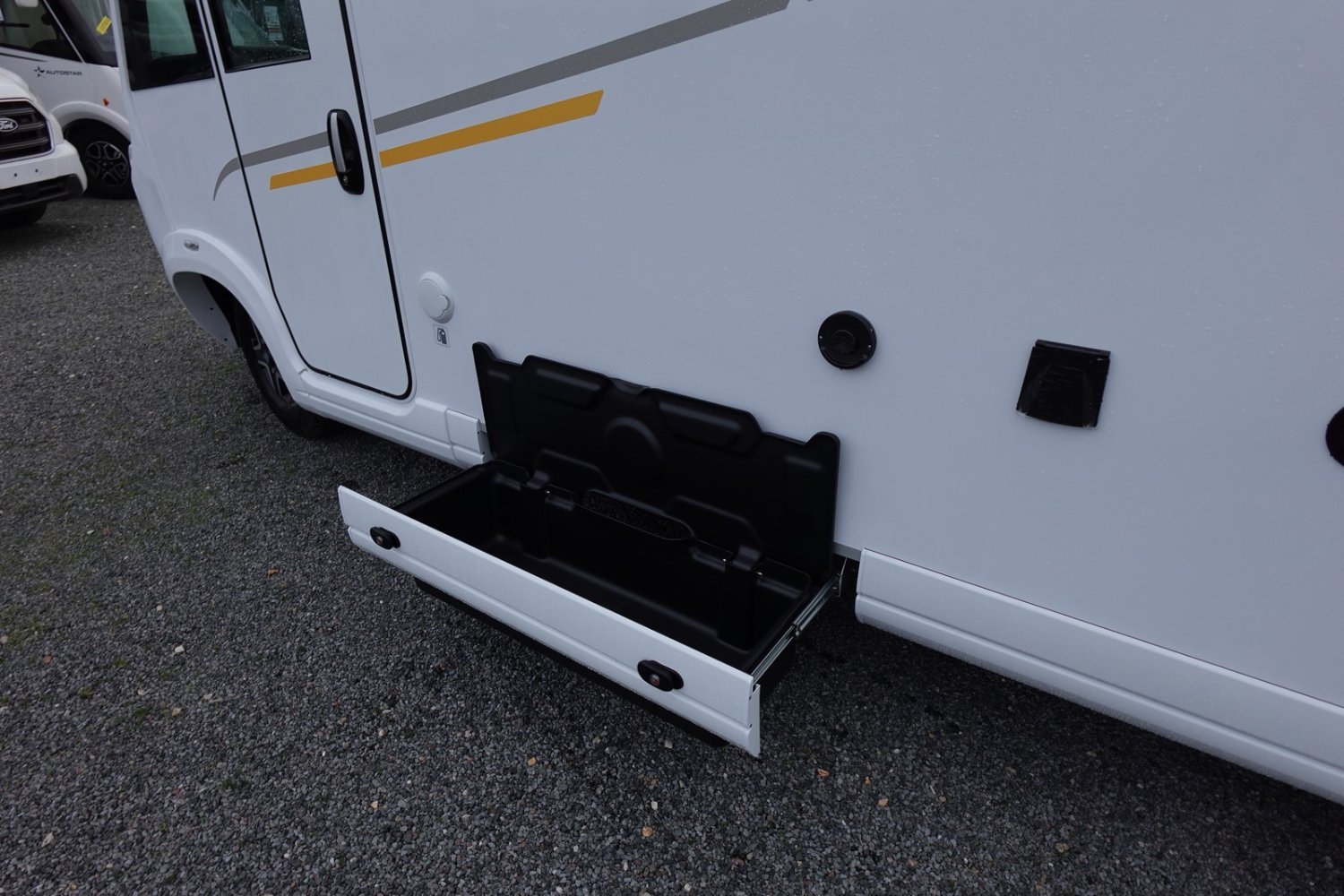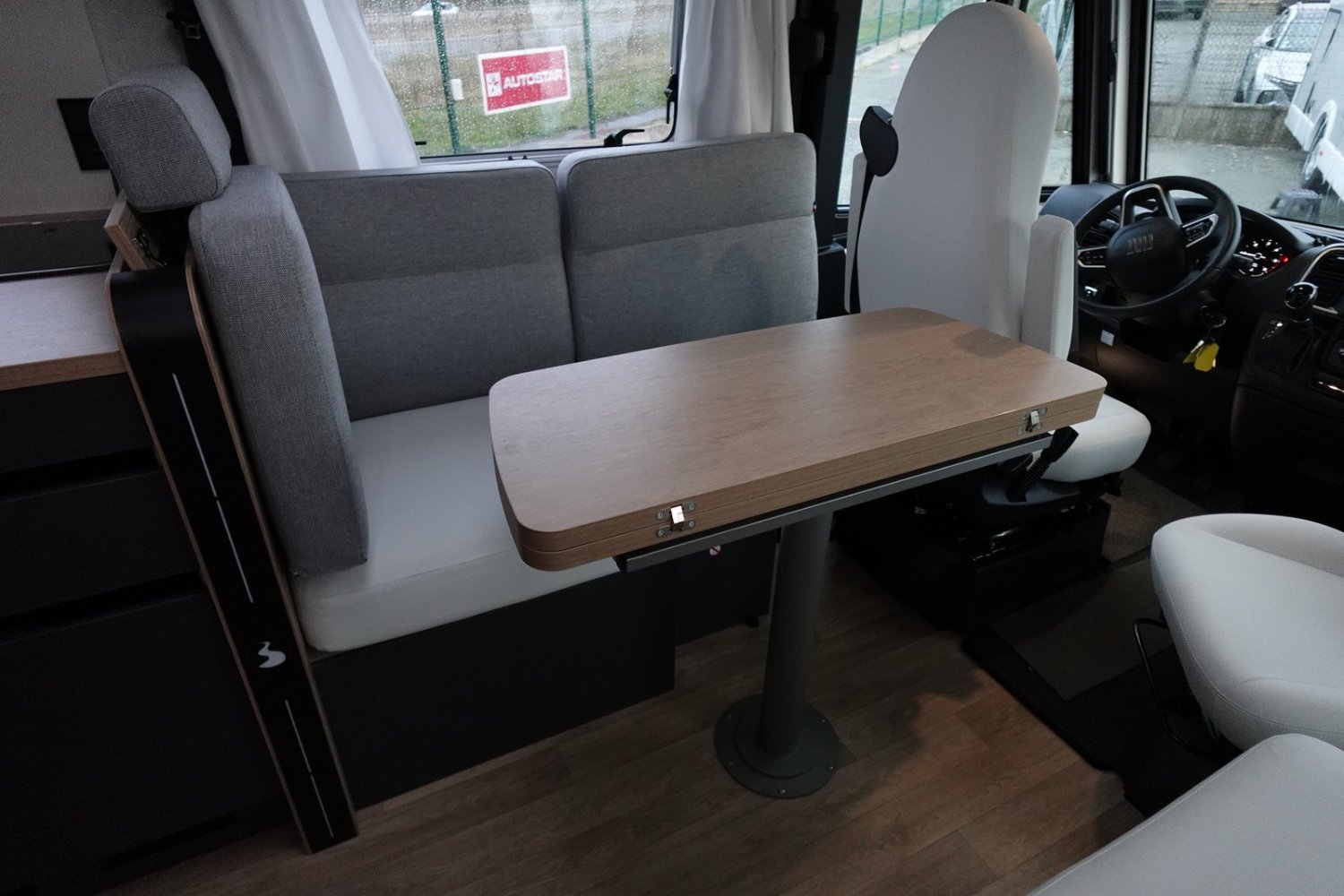 (Motorisation 140 CV, Boite automatique, Batterie Lithium 200 Ah, Convertisseur pur sinus 2000 W, 2 Panneaux solaire 100 W haute performance, Booster pour une charge rapide de la batterie, Chauffage hybride Truma D 6 E, Tiroir bas de caisse, Douchette eau froide/eau chaude dans la soute arrière, Eclairage + rails d’arrimage + prise 220 V dans la soute, Porte serviettes repliable, Poubelle et accessoires pour compartimenter, Eclairage dans la penderie de la chambre, Sellerie bi-ton et bi-matière simili et tissu Sand, Ambiance Pyla)