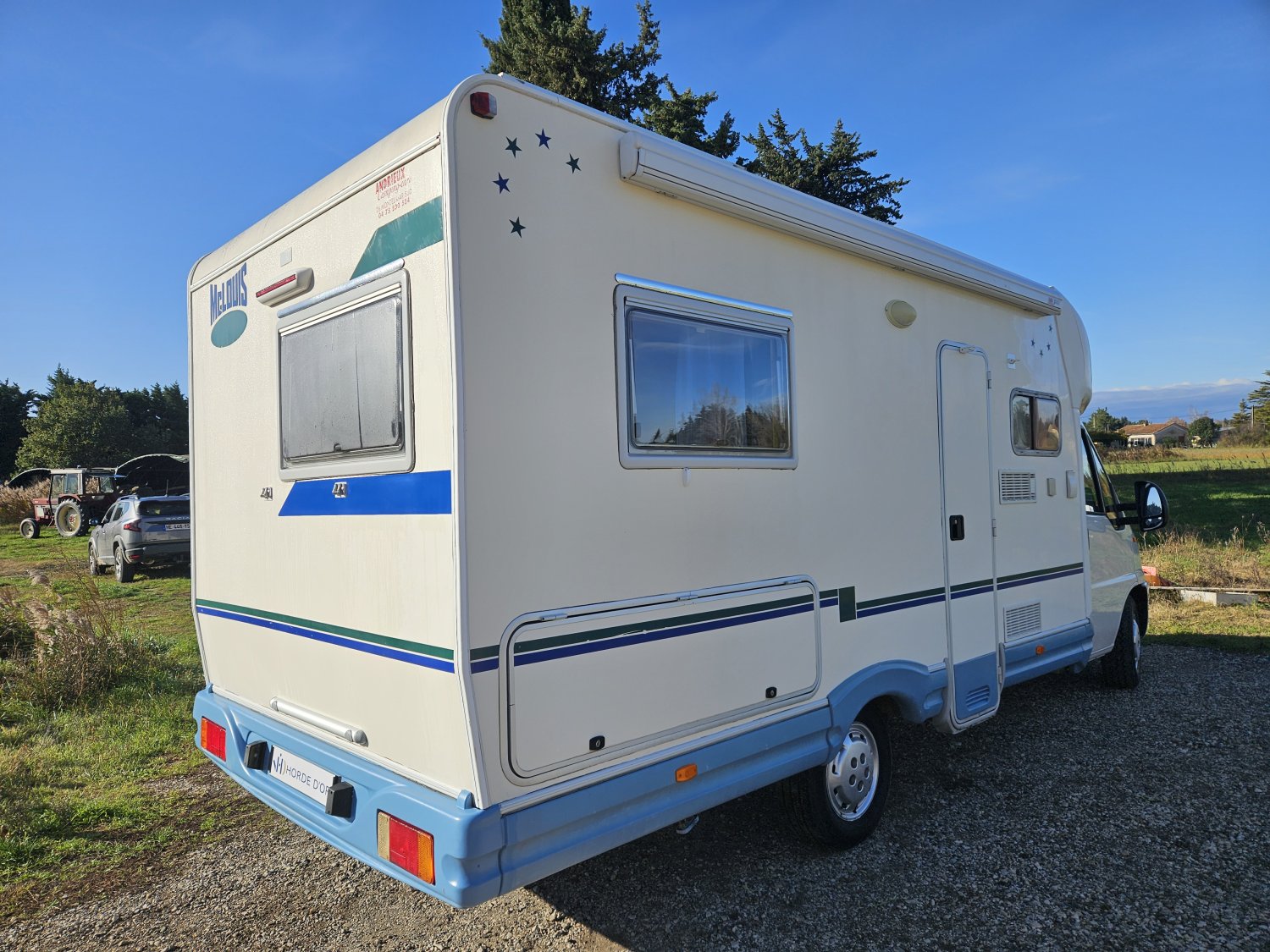 Côté équipements, le camping-car dispose d'une direction assistée, de vitres électriques, d'une roue de secours, d'une soute pratique pour les rangements, d'un panneau solaire de 75 Watts pour une autonomie accrue, d'un store extérieur de 3,5 Mètres pour profiter des beaux jours, ainsi qu'une antenne hertzienne omnidirectionnelle et d'un autoradio.