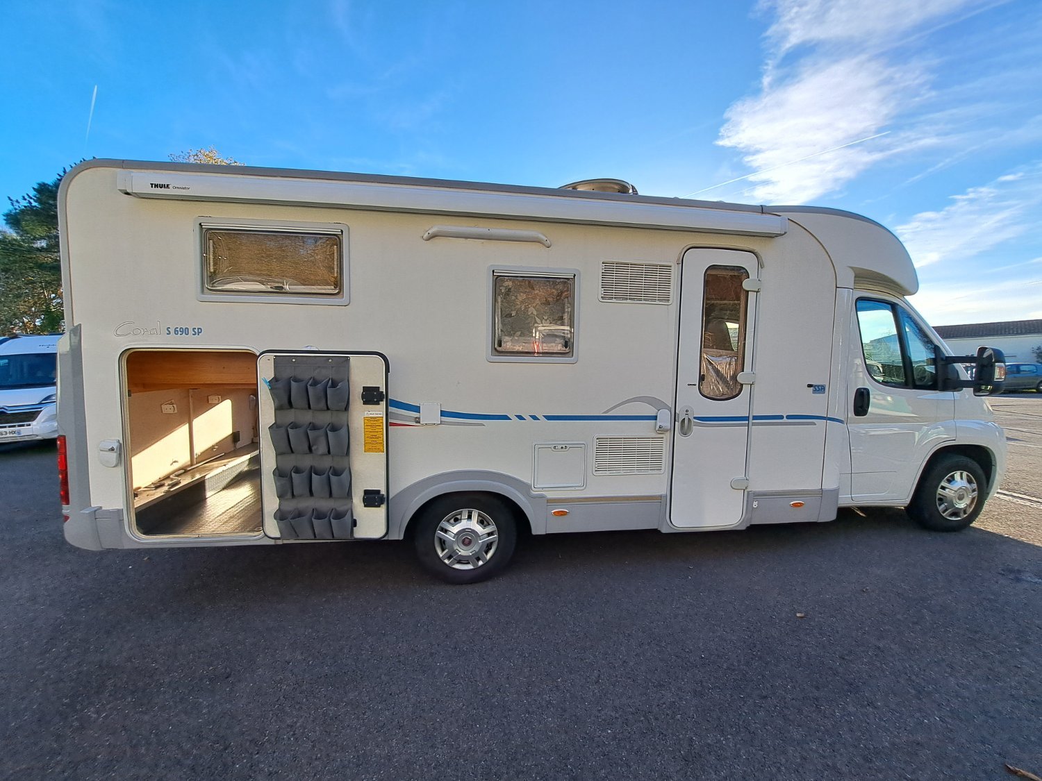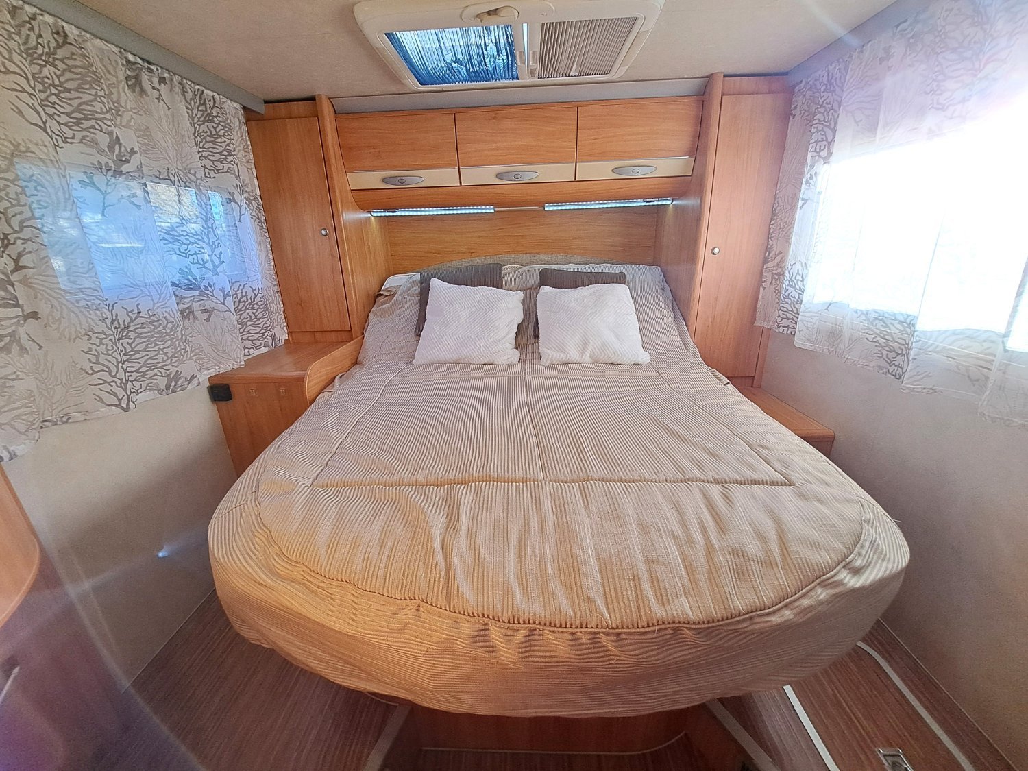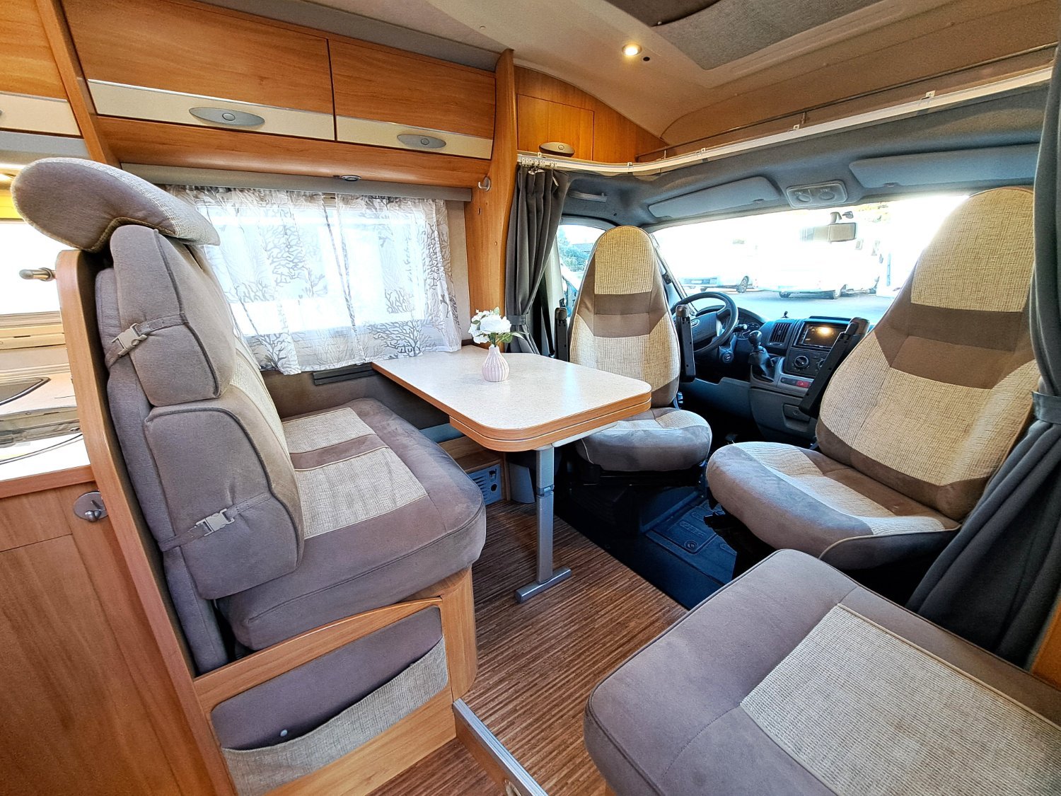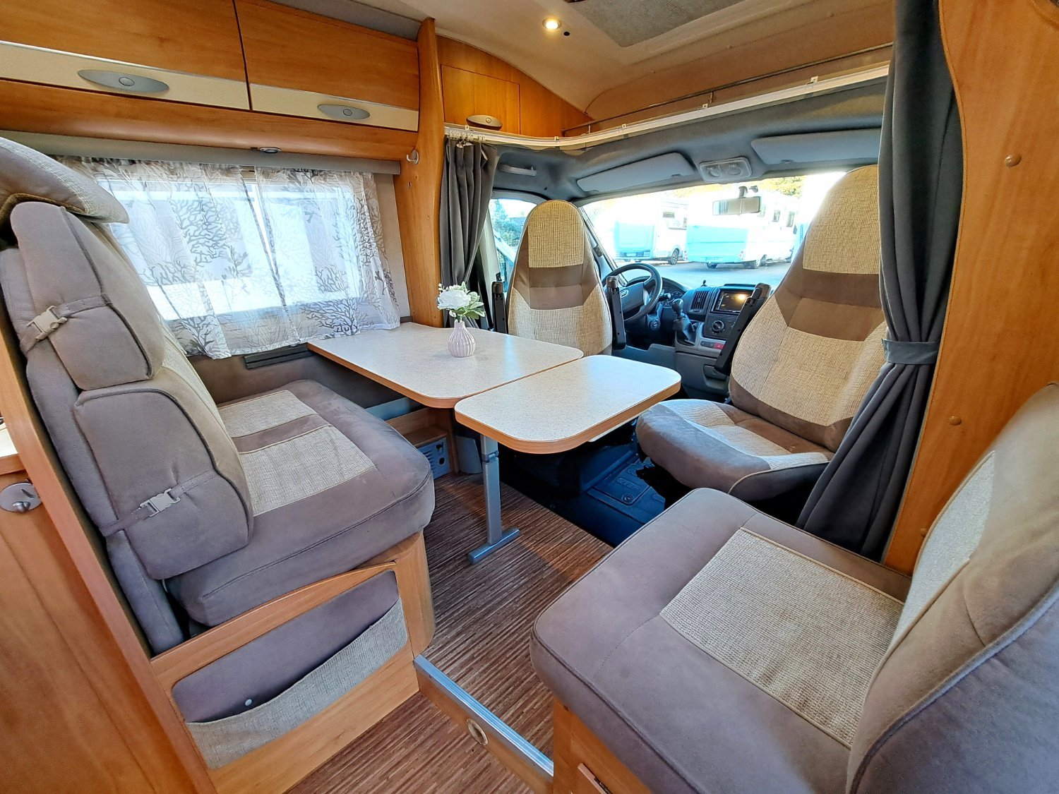 Profilé Adria Coral S690 SP 5 places Carte Grise - 129 400 km - 32900€ Poids à vide : 2940 kg ; Poids total en charge : 3500 kg ; PTRA 5500 kg Porteur : Fiat Ducato 2,3 l Multijet 130 cv, L x l x h : 7.36 x 2.29 x 2.78 m Places C.G./nuit/repas : 5/3/6 Clim cabine : Oui Carrosserie : tout polyester Cuisine : 3 feux gaz hotte aspirante Four Gaz Réfrigérateur 150 litres AES 2 TV salon et chambre+ Antenne satellite Nombreux rangements Chauffage / Chauffe Eau Truma Gaz Couchage : Lit central arrière (200 x 145 cm) Têtes relevables Lit dinette (200 x 110 cm et x cm), Toilette : WC à cassette Douche : séparée Soute-garage Stores Remis Front Suspensions Pneumatiques Caméra de Recul Poste multimédia Carplay Store extérieur Porte Vélos Panneau Solaire Révisé Mécanique et Cellule Garantie mécanique 3 mois