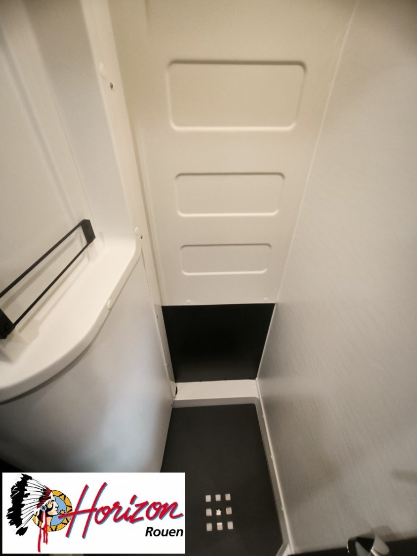 La salle d'eau DUO'SPACE, astucieusement aménagée, permet, grâce à la paroi pivotante, de passer d'un cabinet de toilette spacieux et pratique, à une cabine de douche confortable et indépendante.