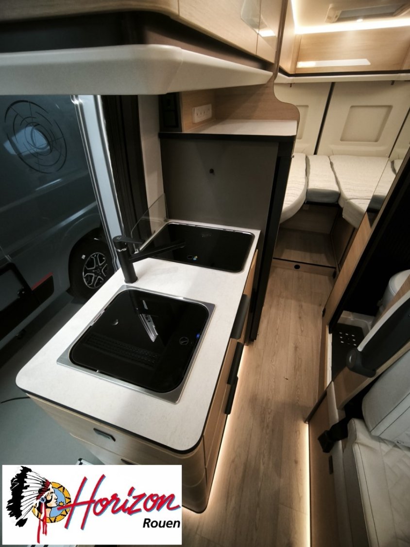 Fourgon avec Les lits jumeaux modulables offrent à chacun son espace personnel, garantissant un sommeil réparateur sans compromis.