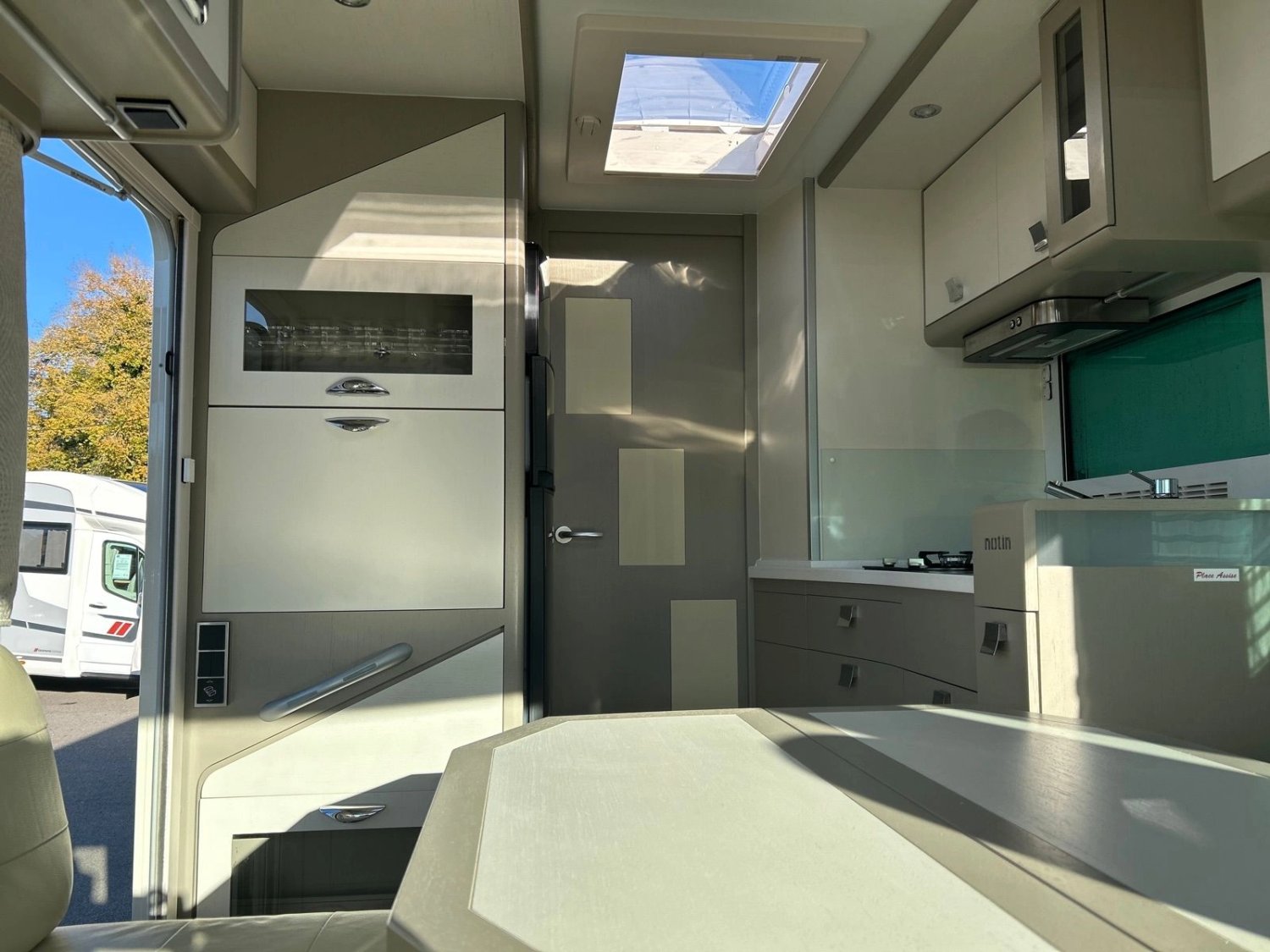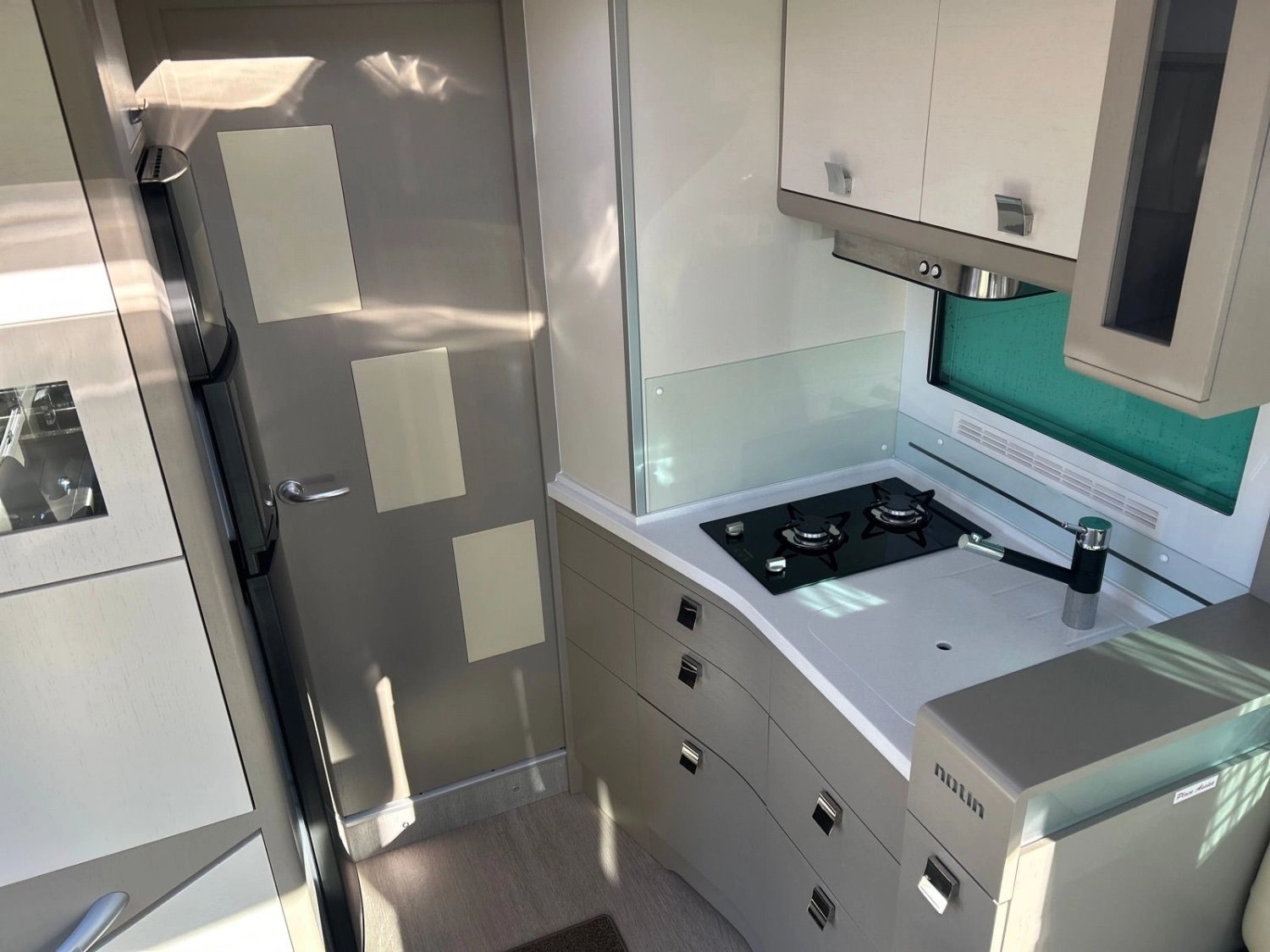 - Cuisine : plan de travail en résine Corian, évier haute qualité, poubelle intégrée, robinetterie luxe à tête pivotante, mini-four gaz, hotte aspirante avec éclairage leds, maxi tiroirs de rangement freinés, colonne à épices