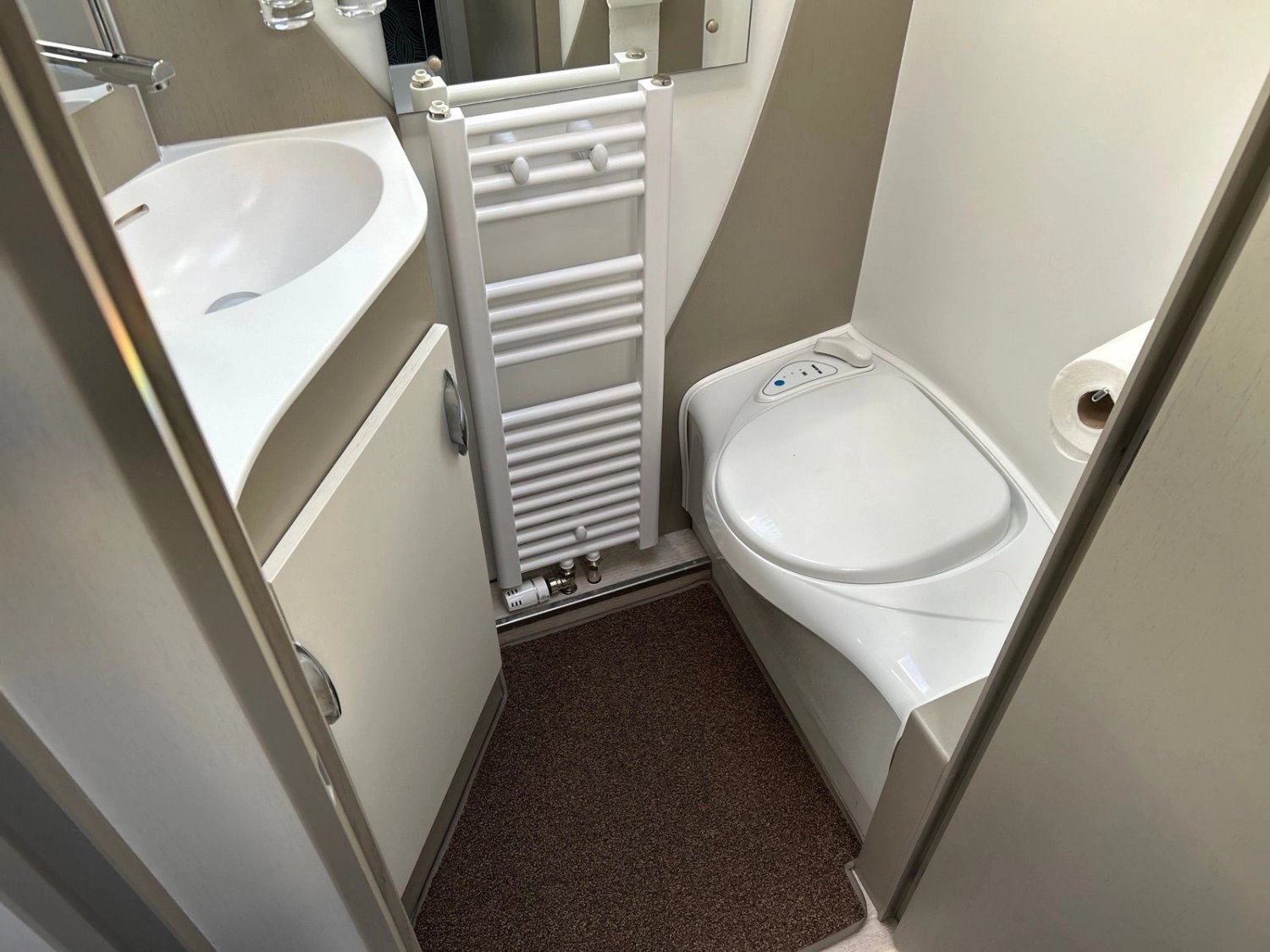 - Chauffage central ALDE : plancher chauffant + sèche serviettes chauffant ALDE intégré dans le cabinet de toilettes
