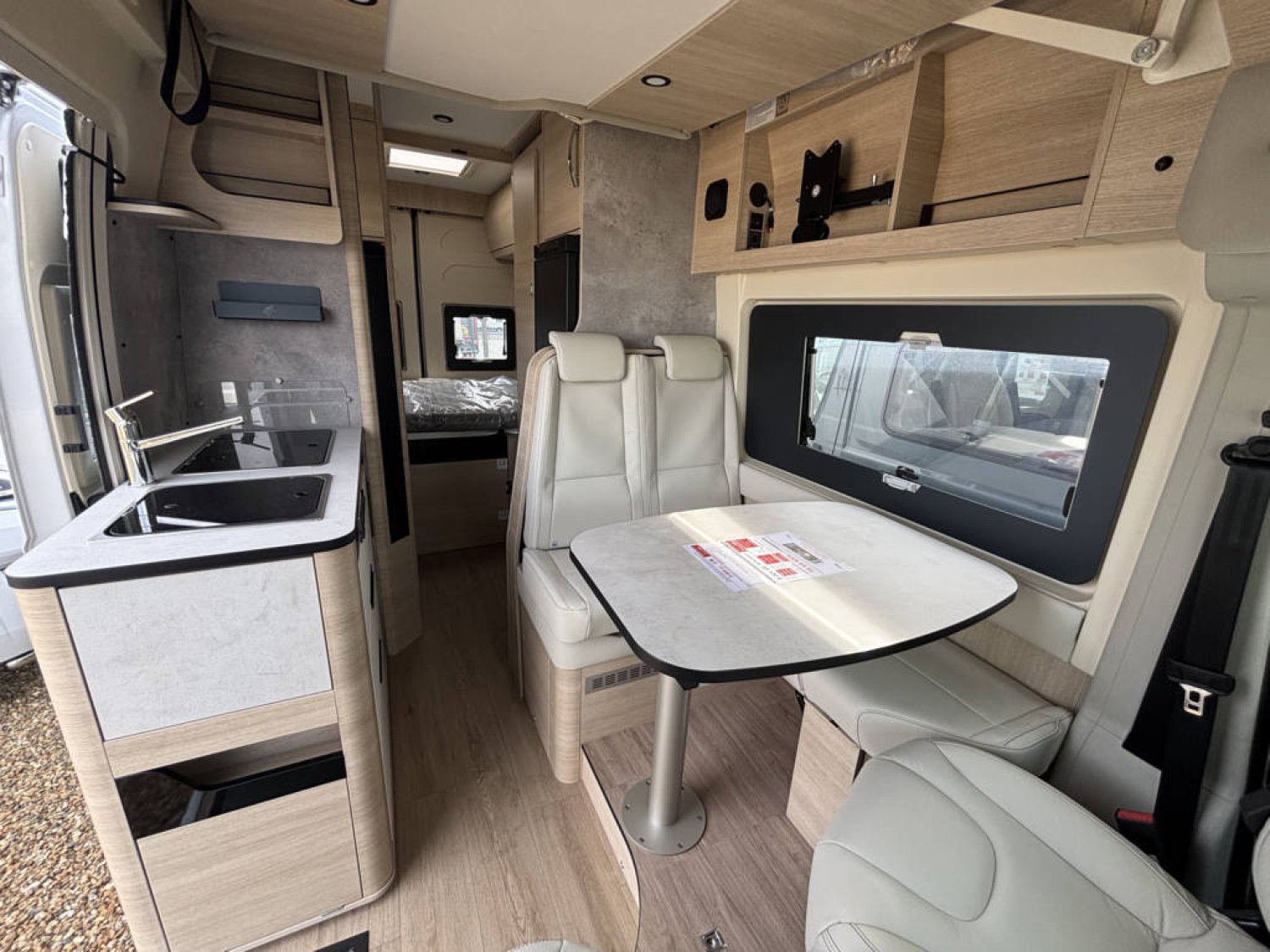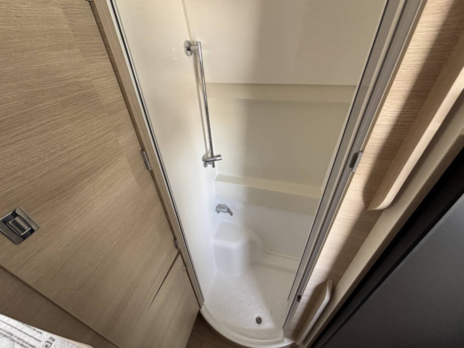 Cuisine en long, Douche indépendante, Lit arrière transversal, lit pavillon, Salon avant sièges pivotants, Salon en L, WC Cassette.