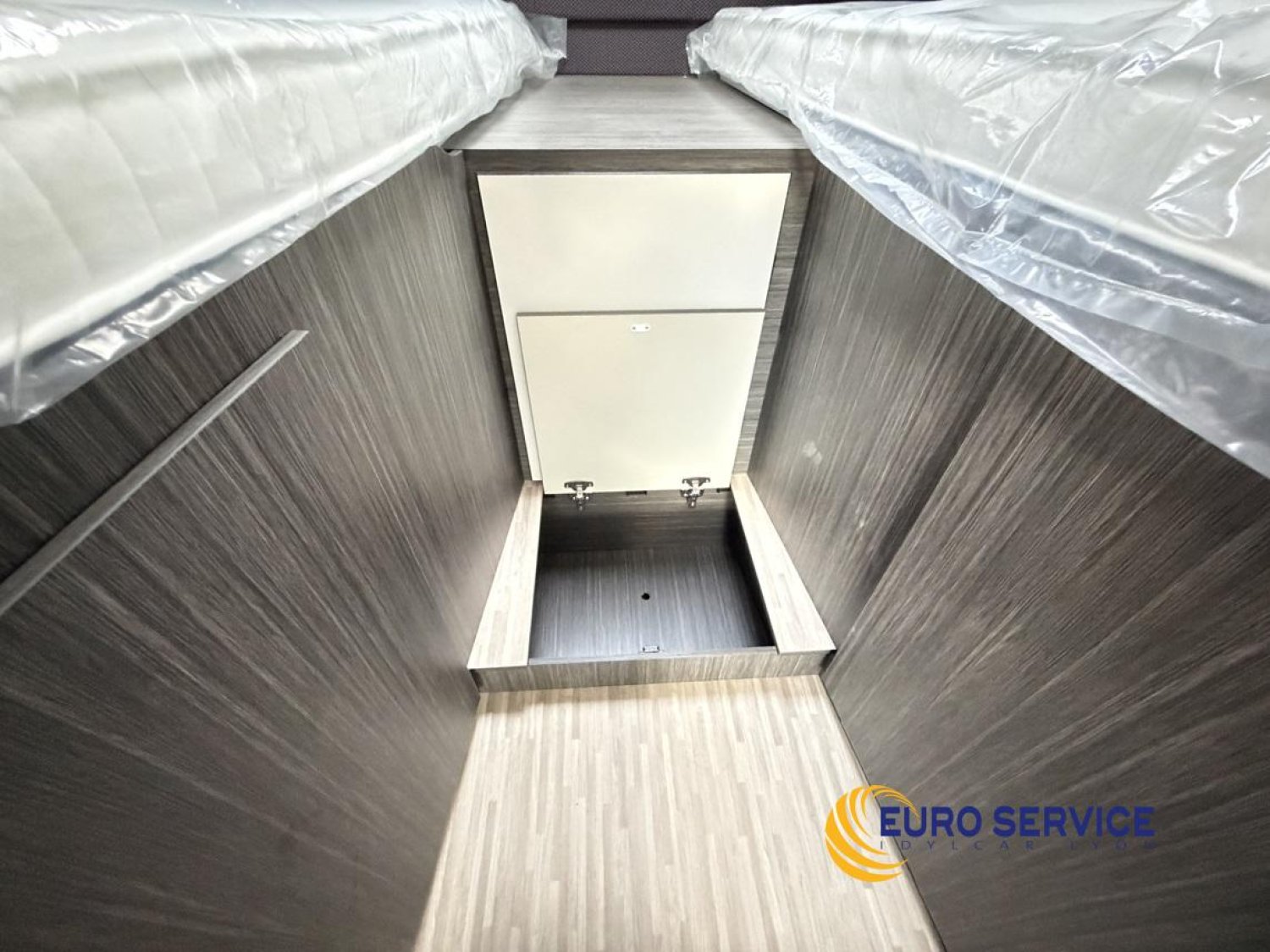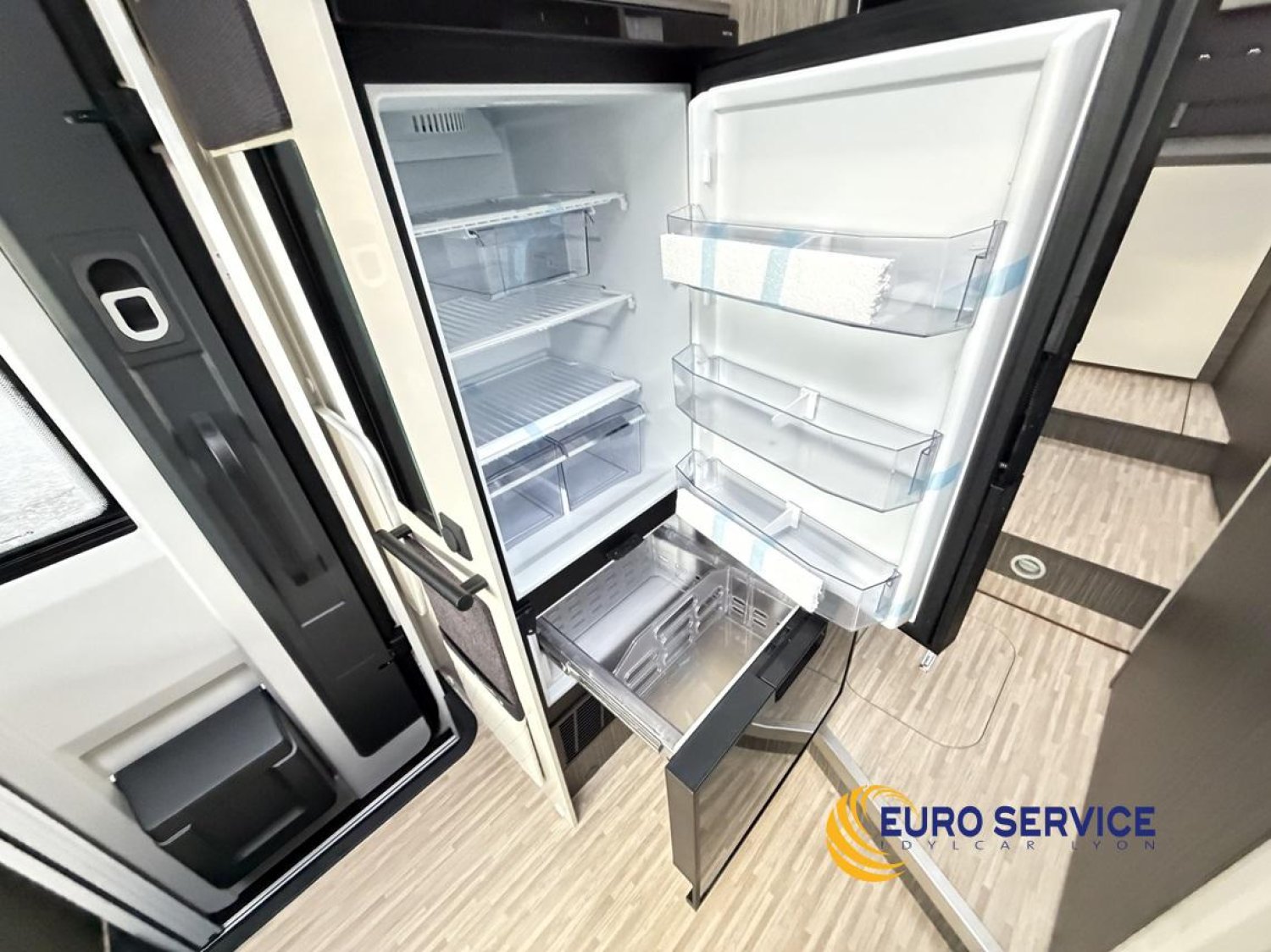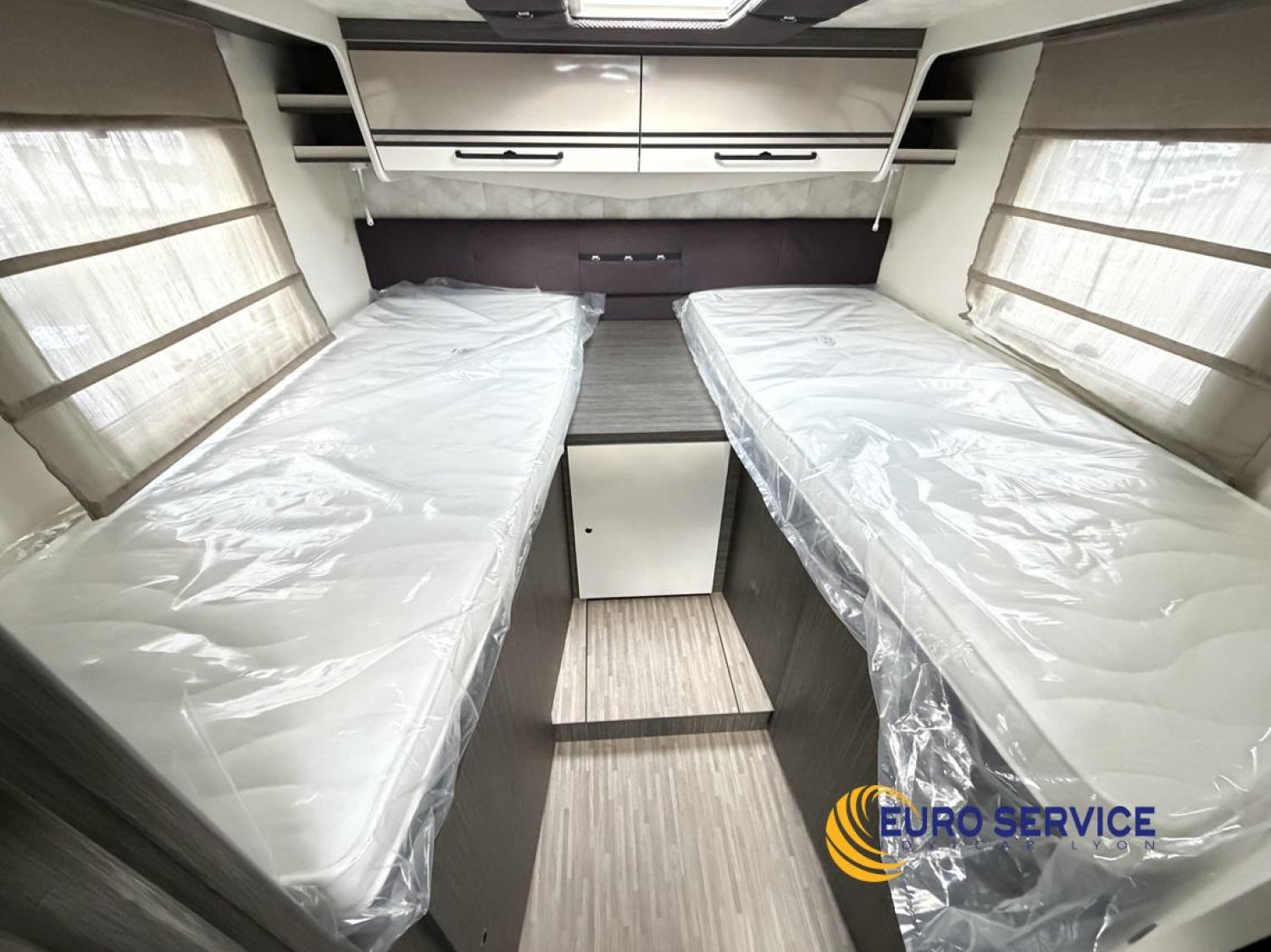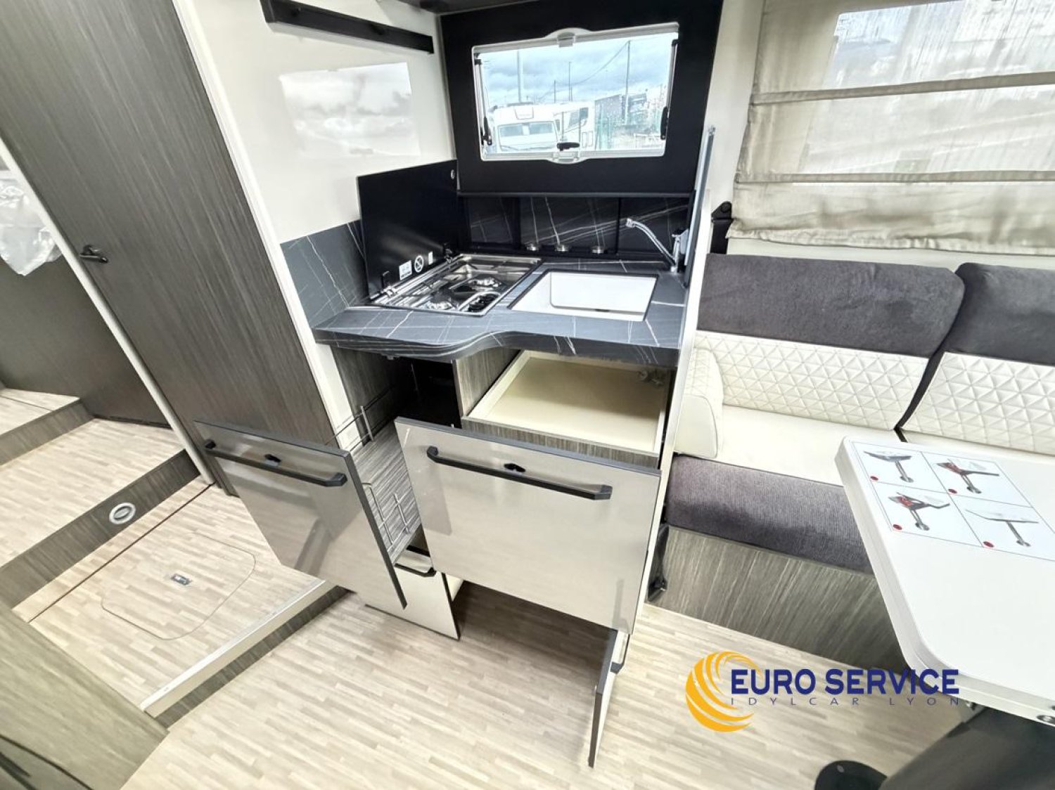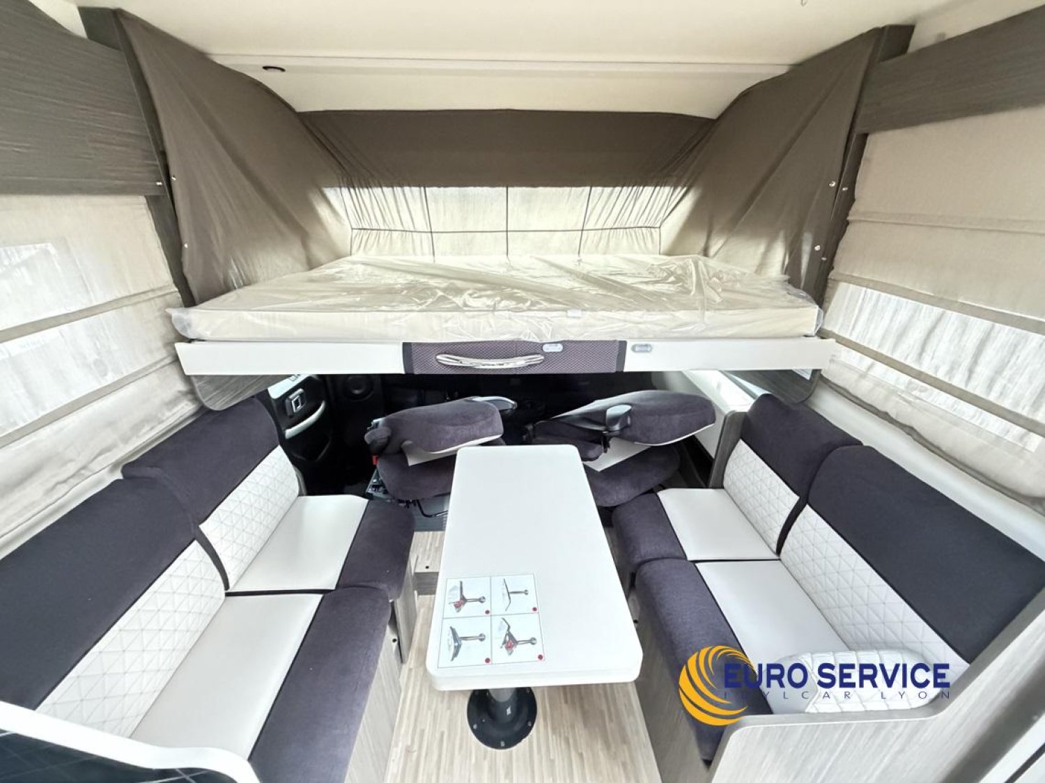Feux antibrouillard, Jantes en alliage 16" bicolore, Volant et pommeau de vitesse en cuir, Tableau de bord Techno, TPMS - Contrôle de pression des pneus, Frein à main électrique, Porte cellule XL avec 2 points de sécurité avec fenetre et serrure centralisée, Panneau solaire 200W avec régulateur MPPT, Store d'occultation plissé cabine, Support TV.