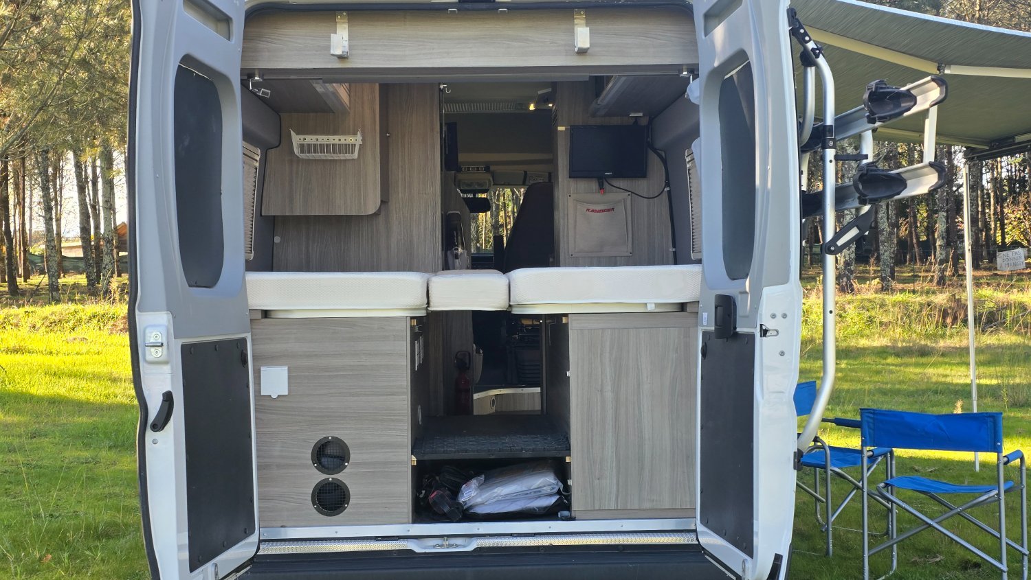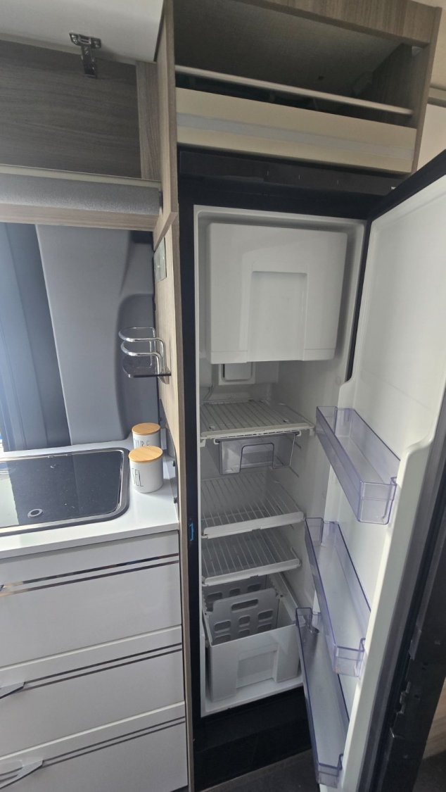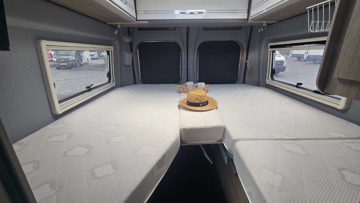 L'implantation est composée de deux grand couchages lit jumeaux et lit dînette, d'une vraie salle de bain, d'un grand réfrigérateur et son salon accueille quatre personnes.