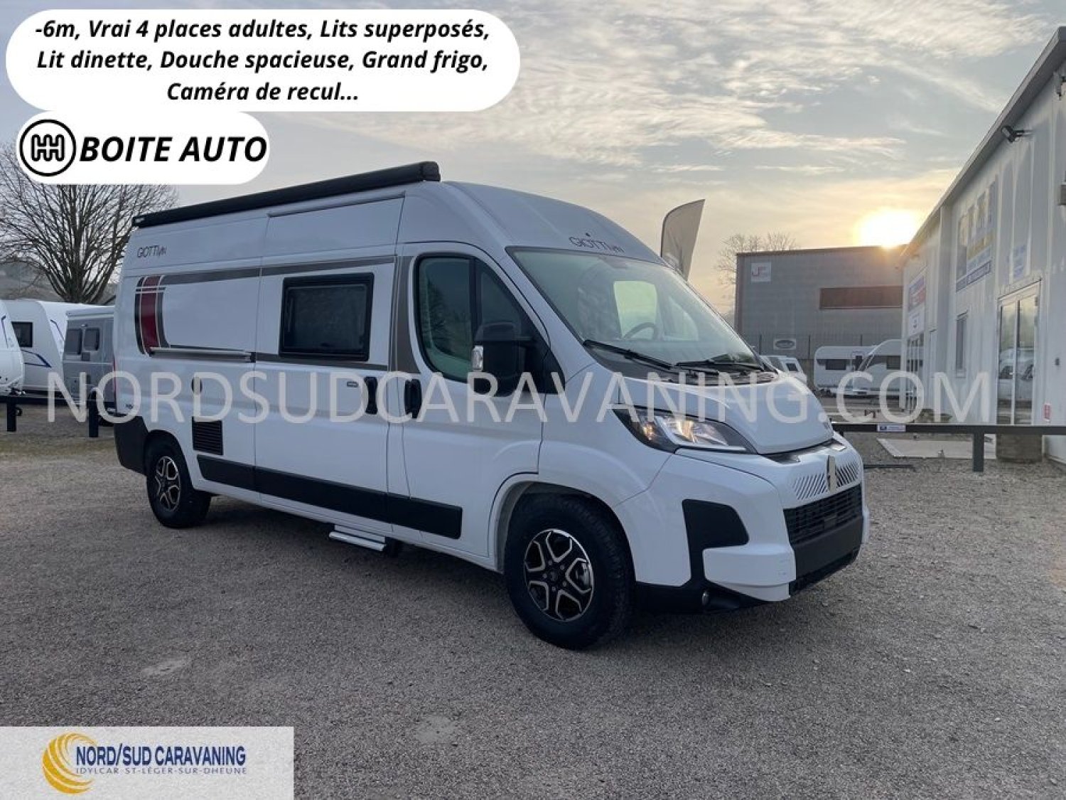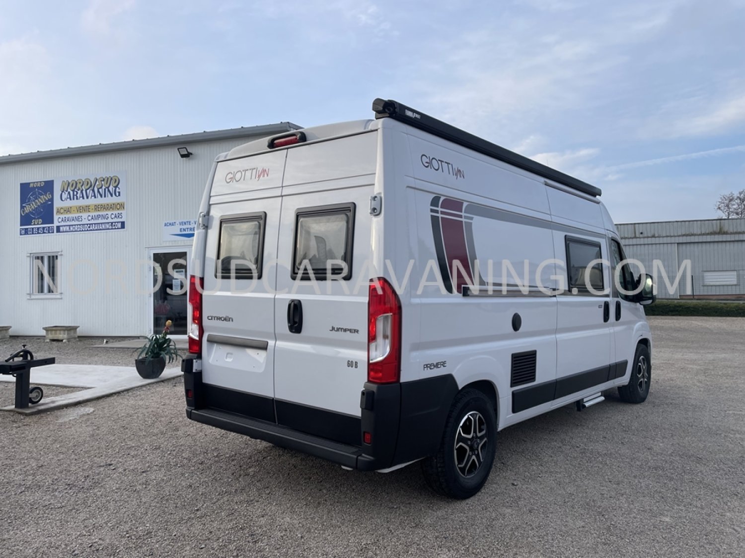 Le Giottiline Giottivan 60B est un fourgon aménagé sur porteur Peugeot Boxer, de 5.99m de long offrant 4 couchages avec une chambre 3 en 1.