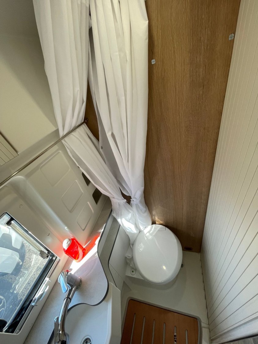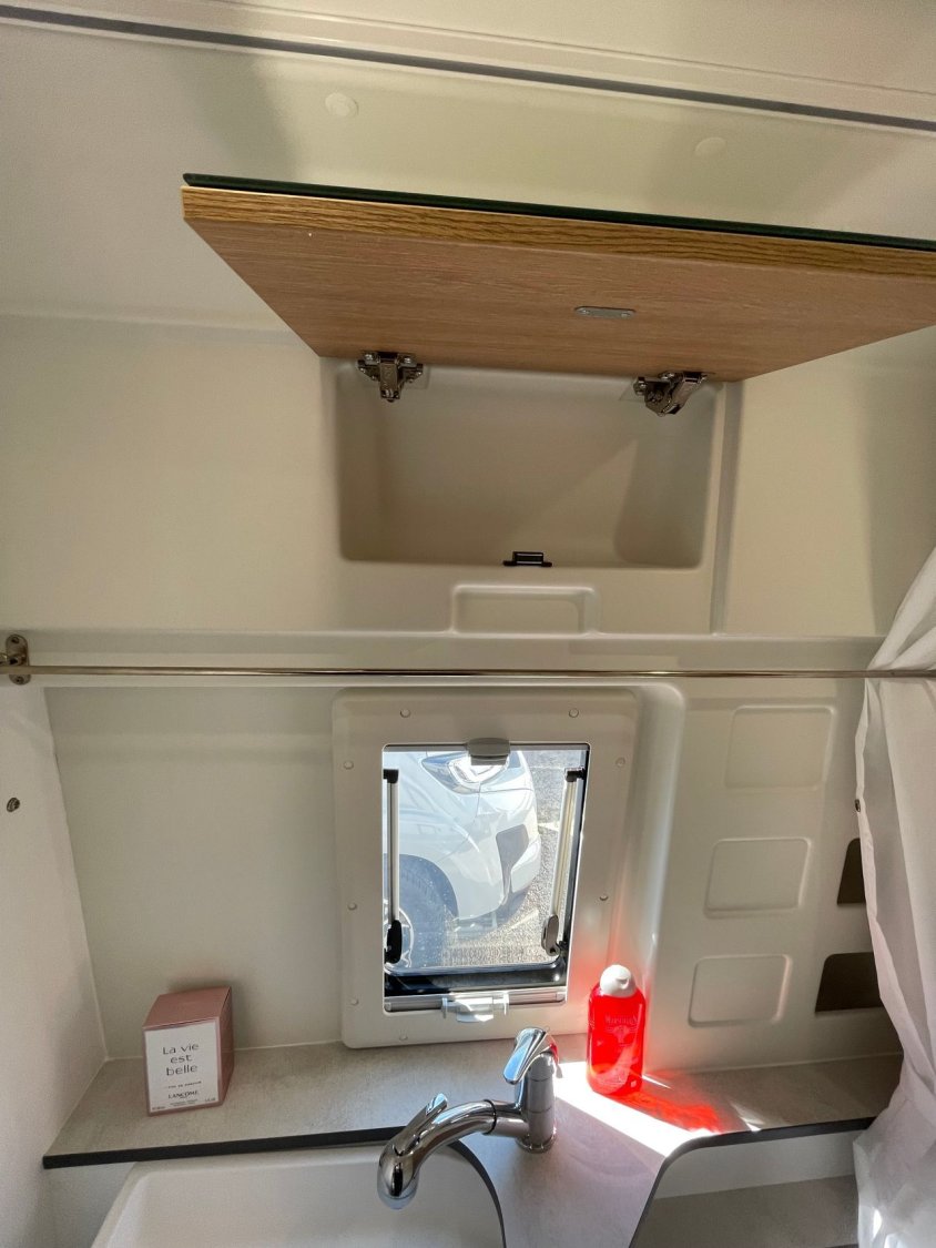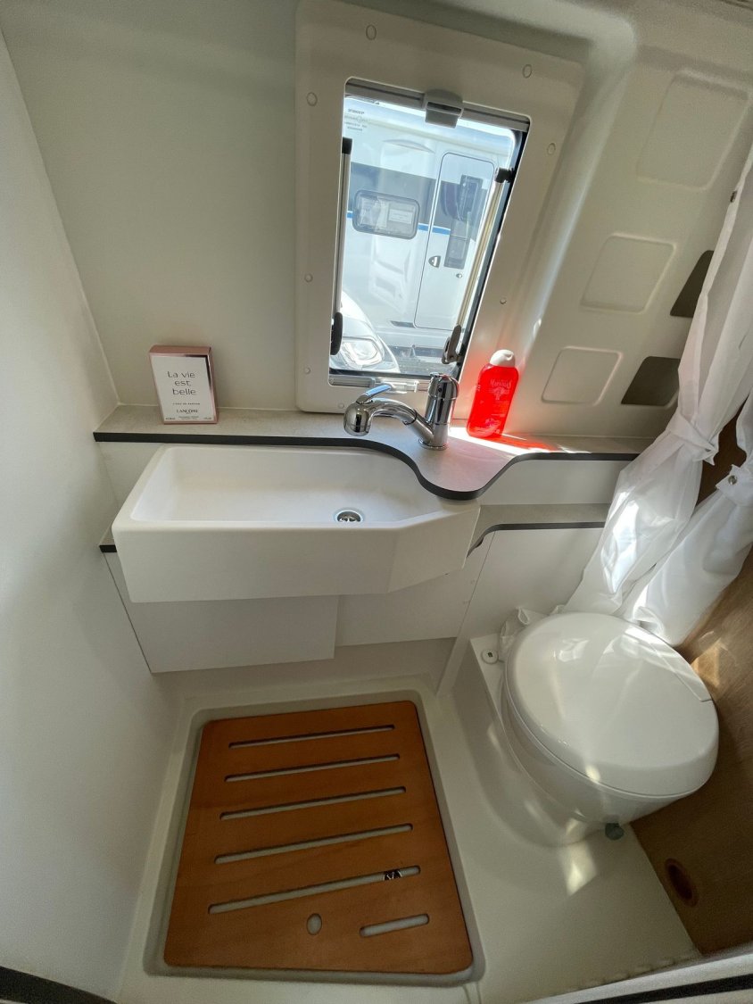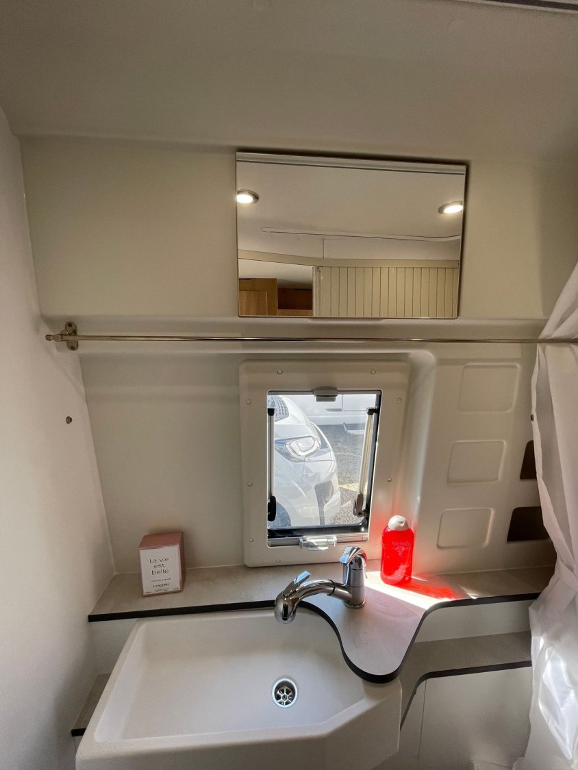 À l'avant, la dinette spacieuse permet également de se transformer en lit d'appoint, et on y retrouve également un grand réfrigérateur à compression de 135L, la climatisation cabine, ou encore un chauffage et chauffe-eau Truma. La salle de bain est équipée d'un bac de douche, d'un WC compact ainsi qu'un astucieux lavabo pivotant.